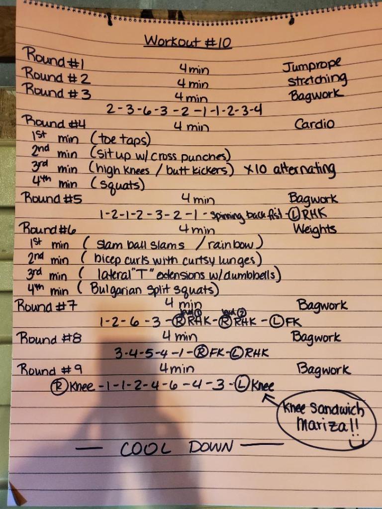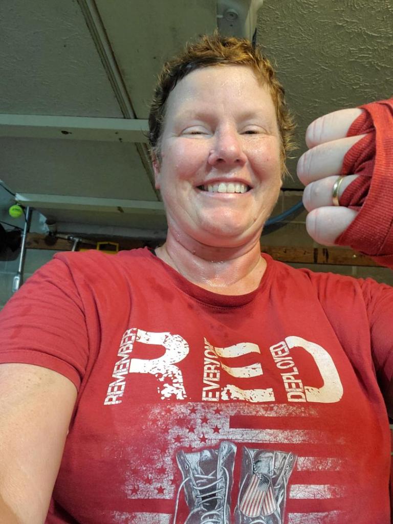 I am a lover of all tings martial arts. I have two black belts – one in Chinese Kempo – one in Okinawan Shorinryu – and I got up pretty high in traditional TaeKwonDo when I lived in Europe as well. The Asian trifecta of Chinese, Japanese, and Korean martial arts. I am also quite well-versed in Brazilian Jiu Jitsu as well. I got involved in kickboxing a few years ago and managed to belong to an awesome place called Impact Kickboxing here in Omaha and workout there for 5 days a week for almost 2 years before I got my cancer diagnosis. The people there were so incredibly supportive of me and my family. I am in daily contact with them still to this day. My 0530 crew always adds a hashtag of #wefight4Cyndi at the end of their posts. This is such a diverse group of people and yet we are bonded by blood, sweat, tears, and for some vomit….with these workouts. They all got t-shirts that said “We fight for Cyndi” on them. I am so blessed to have met these folks! I am finally feeling good enough to get back to working out again in addition to my 5 mile walks with Tallinn. Rich helped me set up a home kickboxing gym in our garage and I have designed 20 workouts with cardio and weightlifting to go along with the bag work. I have worked out each week day for the last two weeks and it has done wonders for my physical and definitely my mental health. It just feels so good to get some of my frustration out on the heavy bag each day. Here are a couple of photos….Tallinn isn’t fond of the heavy bag as he feels that if I am attacking it, it must just be a bad thing in general. Here are a few photos from my kickboxing adventures….
