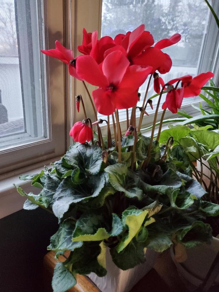 Okay, so I do not have a big green thumb. That happens when you only get to live someplace for 3 years at a time. However, we have a ton of plants in our house. When I first had my two cancer surgeries 6.5 years ago, I got a plant from Ed & Wanda Oslica….a pink Cyclamen (or as I call them, inside-out flowers). I managed to keep that plant alive and happy for 6 years. It grew so big that Rich replanted it. It didn’t survive the repotting, unfortunately. It totally broke my heart. When I had my surgery last November, the Oslicas again gave me a plant of Cyclamen….this time white. It was so pretty! However, it all of a sudden didn’t do well and then as Rich tried to revive it and it got overwatered. It is in a sad state right now and I am still hopeful it may revive itself. I was totally gutted though…I had these plants that brought me such joy as they would bloom all the time…especially during the winter months. When Lily and I were at Mulhall’s they had tons of these potted plants in all sorts of colors I had never seen. I was so very tempted to buy one for myself but I told Lily it wouldn’t be the same…as those flowers meant something special to me being from a good friend who was wishing me well. They are my “you can do this and get better” flowers. So I passed on buying some for myself.