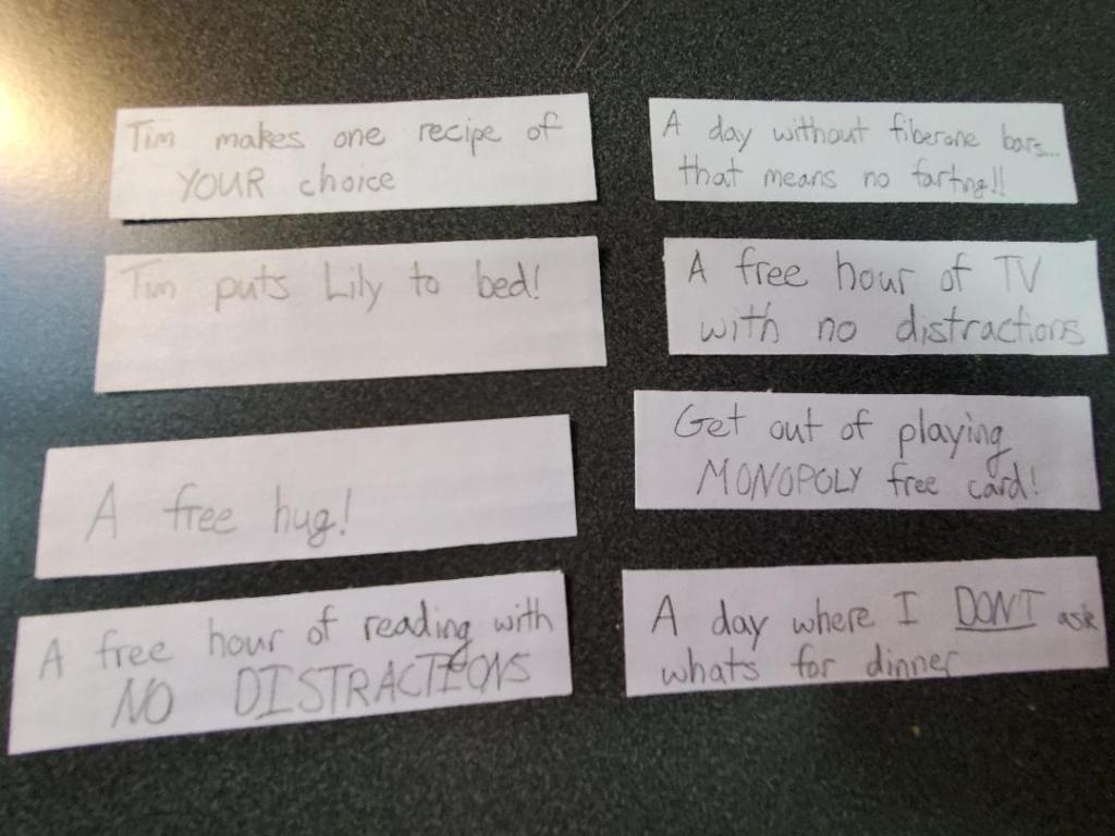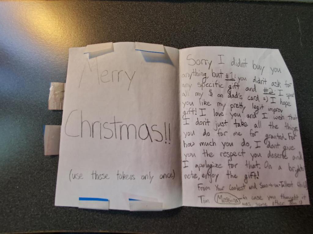 “Merry Christmas!! (use these tokens only once) Sorry I didn’t buy you anything, but #1: you didn’t ask for any specific gift and #2: I spend all my $ on dad’s card. :o) I hope you like my pretty legit improv gift! I love you and I wish that I don’t just take all the things you do for me for granted. For how much you do, I don’t give you the respect you deserve and I apologize for that. On a brighter note, enjoy the gift! From your coolest and soon-to-be-tallest child, Tim Messina – in case you thout it was some other Tim :o) And the coupons were: Tim makes one recipe of your choice…..A free hour of reading with NO DISTRACTIONS…..Get out of playing monopoly free card!…..A free hour of TV with no distractions…..A day where I DON’T ask what’s for dinner…..Tim puts Lily to bed!…..A day without (Tim eating) fiberone bars – that means no farting!!…..and the last one…..A free hug! I admit I have never handed any of these back to him….and have used several of them multiple times. It was an awesome gift! I had Lily read this and she laughed and said, “Classic Tim. Sounds just like him!”