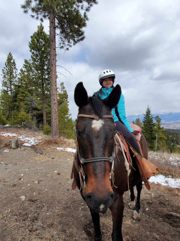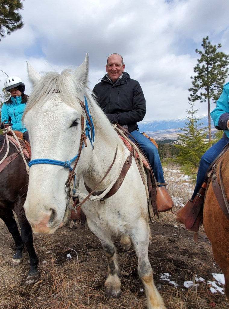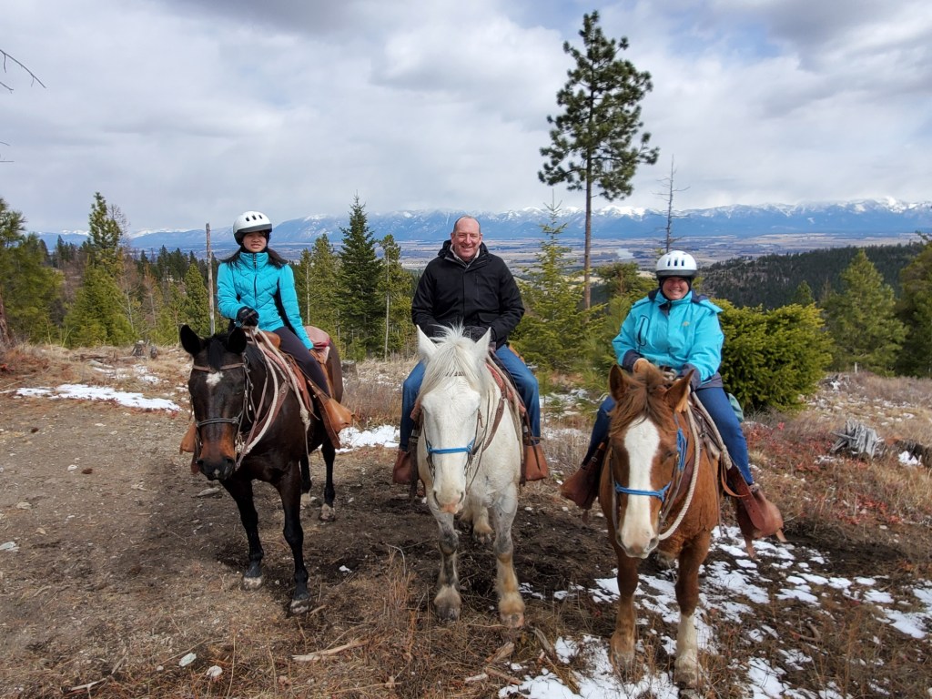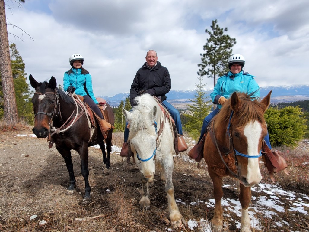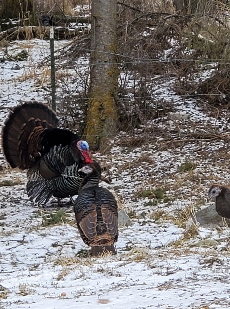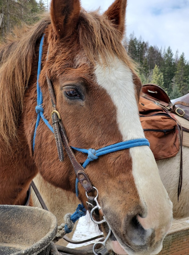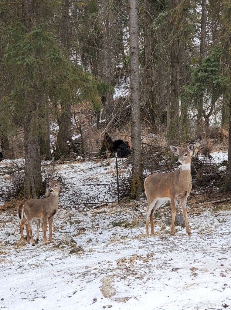 Not many horse places are open during the winter….but this one in rural Kalispell was! The three of us spent 2 hours on the trails in the mountains on horseback. It was a lot of fun and we all enjoyed it. My horse, Caramel, was in the back and decided to do a lot of plodding…..so kept falling behind. So we had to do a fair bit of trotting to keep up. It was a blast. The other family was from Chicago and when one of the little kids asked why the young man riding in the rear was wearing a gun in his holster, he said, “Just in case of mountain lions.” I think the dad of the kids, wearing square-toed leather dress shoes (sigh) blanched a bit. There were a lot of deer and turkey in the barnyard waiting for us to leave on the trail ride so they could eat the leftover feed dropped on the ground by the horses. Lily said it was her favorite part of the trip. (bonus!) It is hard to please a 16 year old year on a vacation with her parents and her dog that was breathing on her in the car the whole trip. :o)