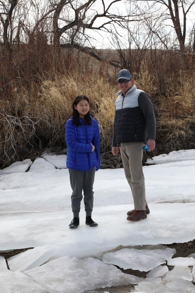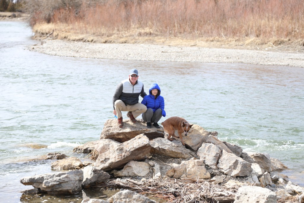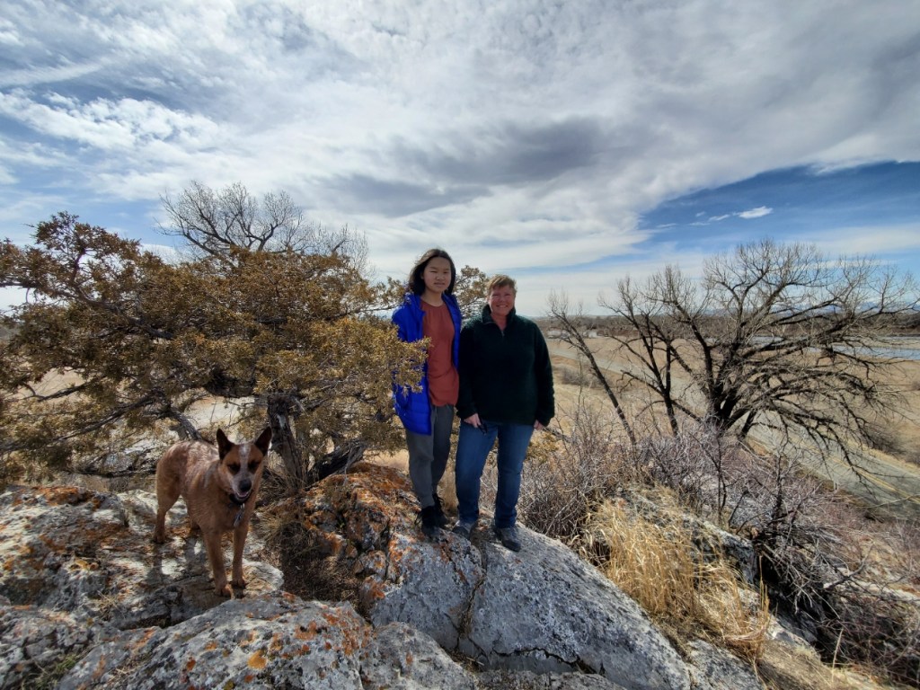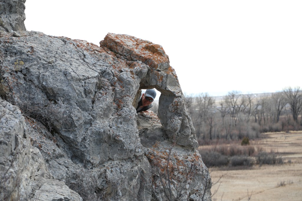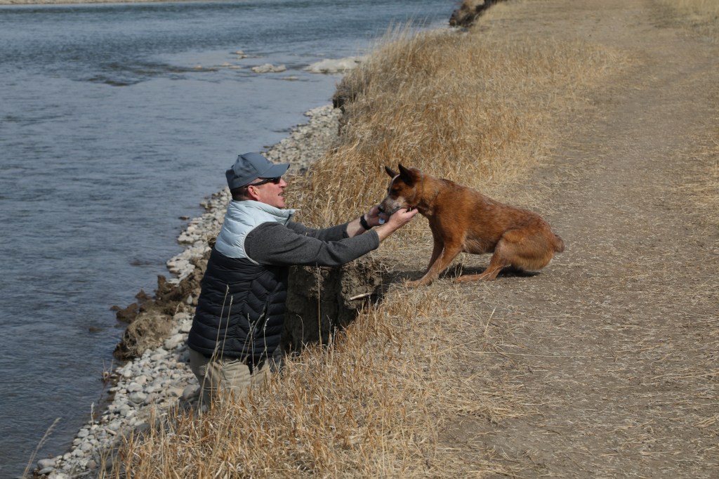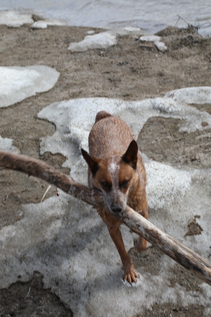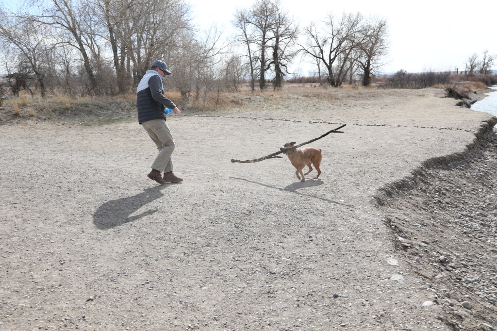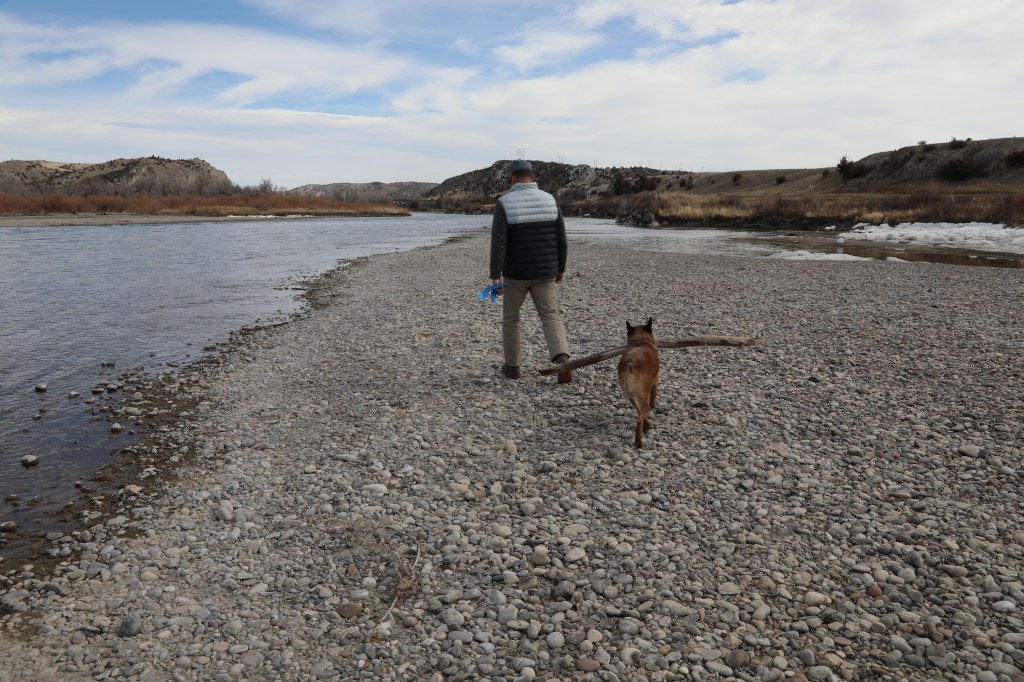 Oh my goodness, we had fun here! It was super windy but warmish (low 60’s maybe – it’s all relative) yet there were some piles of snow still in shady areas. We had been in the car forever at this point (this was day 3 so we were all itching to get out and play – us and the dog). Tallinn was a great traveler. He needed to be out and running though for a bit. He has never been swimming. He loves to cool his toes in but has never really been in the water. Tallinn is a bit neurotic…he gets very fixated on things like balls, toys, sticks, and rocks. Rich skipped a rock across the still very cold and quickly running Missouri River and Tallinn went after that rock with gusto. Right into the strong current. He got about 30 feet out, realized he could no longer see the rock and he was in over his head….literally. He turned around and we all saw the whites of his eyes as he panicked a bit trying to swim to shore. That was his indoctrination to swimming. Ever since we have had to try and keep him out of the water! Oh, and the bigger the stick the better for Tallinn! He enjoys thwacking Rich on the back of the knees with his “stick” so he will turn around. Tallinn then drops it at his feet and waits impatiently for him to throw it for him. He is a strange little fellow but he sure did give us a lot of laughs on the trip!