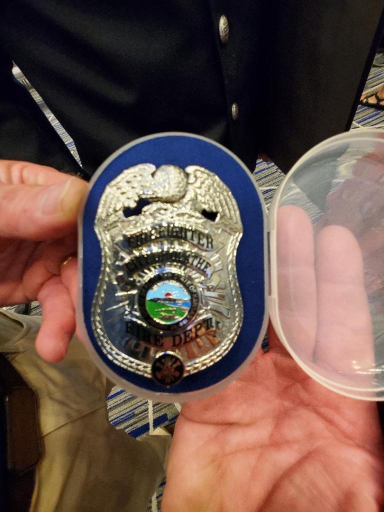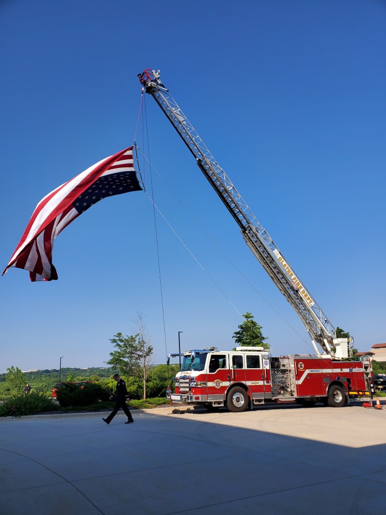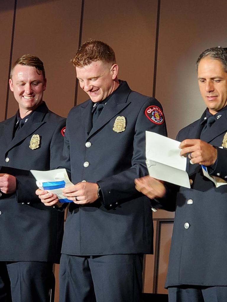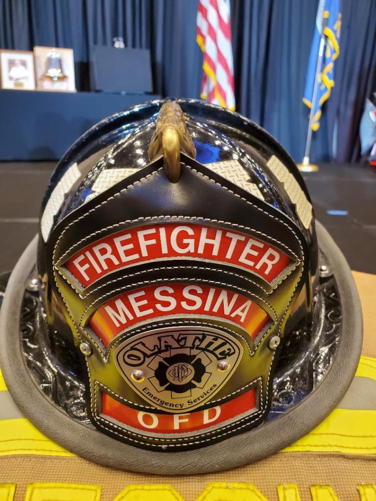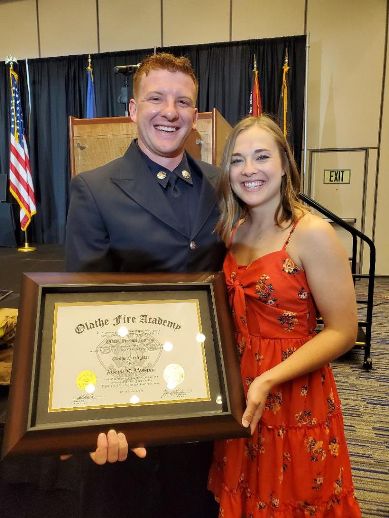 We met Michelle, his wife, at the graduation and sat together as the ceremony started. I also handed her Joe’s keys and said, “Tag! You’re it!”. The American and Kansas flags were brought in by firefighters carrying axes before and following. The color guard was led in by a Scottish bagpiper and drum duo. It’s the kind of thing that makes goosebumps pop up on your arms. It was really cool. We then said the pledge of allegiance. All the while, all 10 of the recruits’ gear were lined up across the stage. We learned there are a LOT of chiefs in the Olathe Fire Department and most were there. Not only is this a graduation, but it is also an assignment night (which is more exciting for the recruits….to find out who their fire chief will be, what station they will be assigned to, and what shift they will be on). The OFD chaplains were there and prayed over the recruits giving them the advice to seek the Lord for strength when they need to. Each of the recruits had a family member pin on their OFD badge (a special one for the year 2021 because they are celebrating their 50th anniversary as a fire department this year) and received a framed diploma. Joe was recognized as being a military member. Five out of ten of the recruits have military service. Joe was also recognized as having legacy fire service. This means he has a family member who also serves as a firefighter. This would be my brother, Craig Neitzke, who is a LT in the Cy-Fair Fire Department in Houston, TX. Joe was given a special coin by one of the chiefs to give to his Uncle Craig from the Olathe Fire Department. Four of the ten recruits had this honor. The Captain then swore them in. They then were given envelopes (they were taped under their chairs) to open in front of everyone on stage with their assignments. After cake and photos, Joe got to sign his firefighter’s oath of office and Michelle witnessed it for him. A copy went to him to keep and the other goes into his file. We then went out to dinner and had a great rest of the evening catching up with Joe and Michelle. They left this morning to head to Ft. Chaffey, Arkansas, so Joe could catch up with his Army National Guard Unit before they go to Fort Polk, LA (yes, my old stomping grounds – where I graduated from high school) for 4 weeks of training at JRTC. He will start his job at OFD on shift A, station 1 (the big house), under Chief Simmons. Joe will be learning a lot in such a big station and is really looking forward to getting his career underway with OFD!