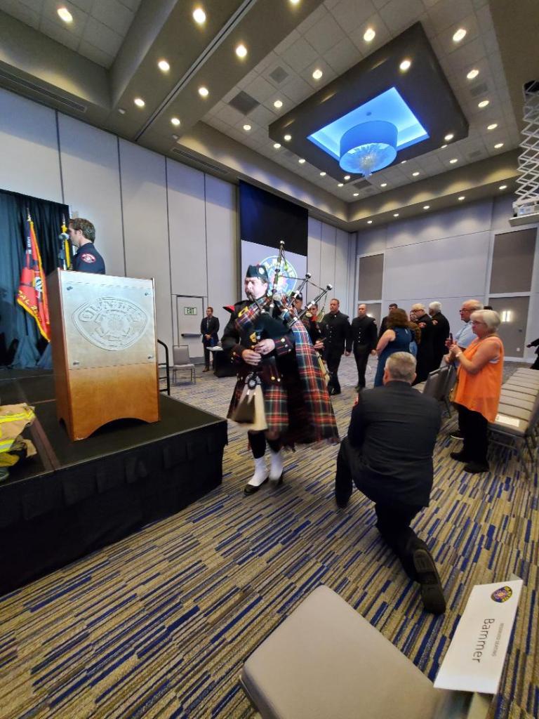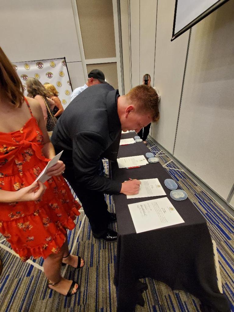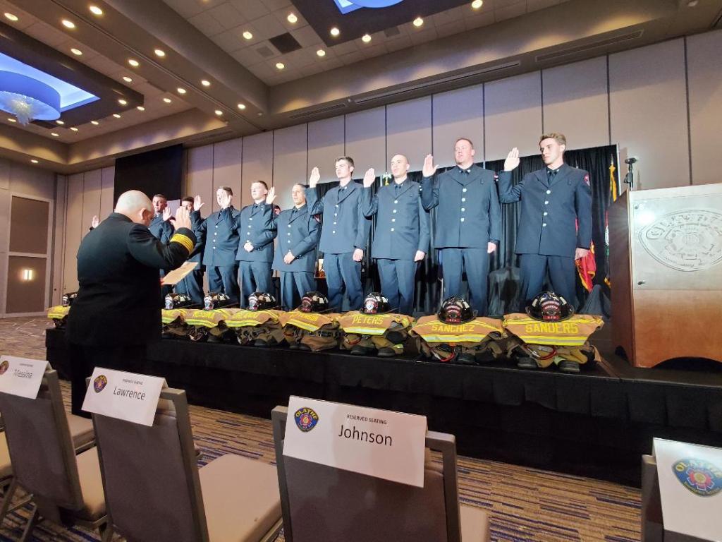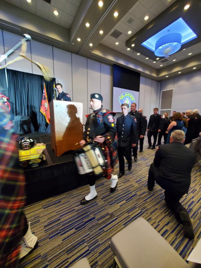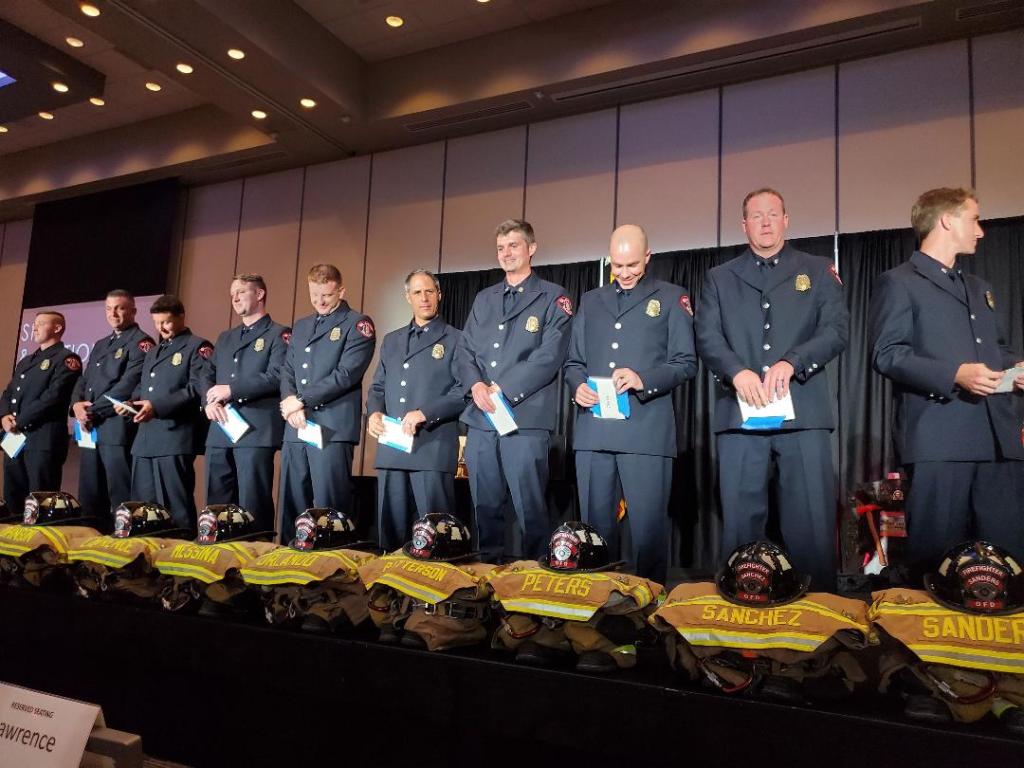 We met Michelle, his wife, at the graduation and sat together as the ceremony started. I also handed her Joe’s keys and said, “Tag! You’re it!”. The American and Kansas flags were brought in by firefighters carrying axes before and following. The color guard was led in by a Scottish bagpiper and drum duo. It’s the kind of thing that makes goosebumps pop up on your arms. It was really cool. We then said the pledge of allegiance. All the while, all 10 of the recruits’ gear were lined up across the stage. We learned there are a LOT of chiefs in the Olathe Fire Department and most were there. Not only is this a graduation, but it is also an assignment night (which is more exciting for the recruits….to find out who their fire chief will be, what station they will be assigned to, and what shift they will be on). The OFD chaplains were there and prayed over the recruits giving them the advice to seek the Lord for strength when they need to. Each of the recruits had a family member pin on their OFD badge (a special one for the year 2021 because they are celebrating their 50th anniversary as a fire department this year) and received a framed diploma. Joe was recognized as being a military member. Five out of ten of the recruits have military service. Joe was also recognized as having legacy fire service. This means he has a family member who also serves as a firefighter. This would be my brother, Craig Neitzke, who is a LT in the Cy-Fair Fire Department in Houston, TX. Joe was given a special coin by one of the chiefs to give to his Uncle Craig from the Olathe Fire Department. Four of the ten recruits had this honor. The Captain then swore them in. They then were given envelopes (they were taped under their chairs) to open in front of everyone on stage with their assignments. After cake and photos, Joe got to sign his firefighter’s oath of office and Michelle witnessed it for him. A copy went to him to keep and the other goes into his file. We then went out to dinner and had a great rest of the evening catching up with Joe and Michelle. They left this morning to head to Ft. Chaffey, Arkansas, so Joe could catch up with his Army National Guard Unit before they go to Fort Polk, LA (yes, my old stomping grounds – where I graduated from high school) for 4 weeks of training at JRTC. He will start his job at OFD on shift A, station 1 (the big house), under Chief Simmons. Joe will be learning a lot in such a big station and is really looking forward to getting his career underway with OFD!