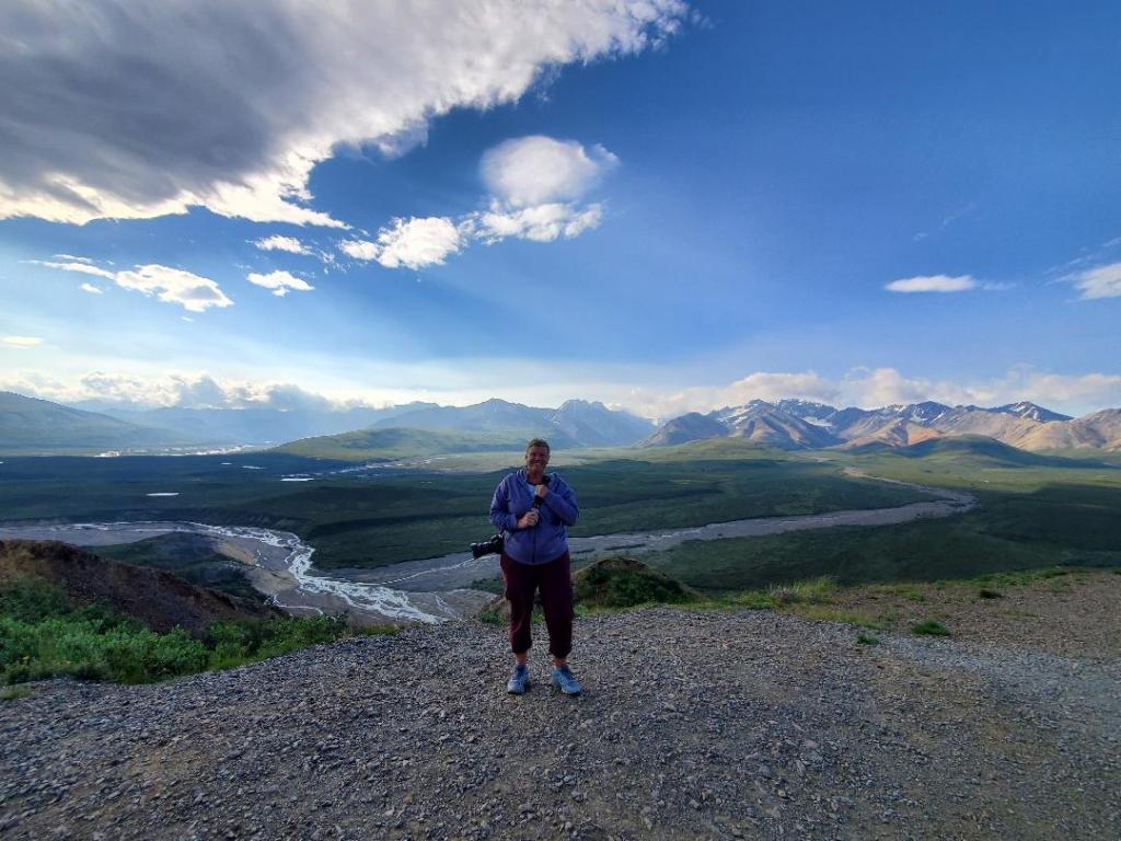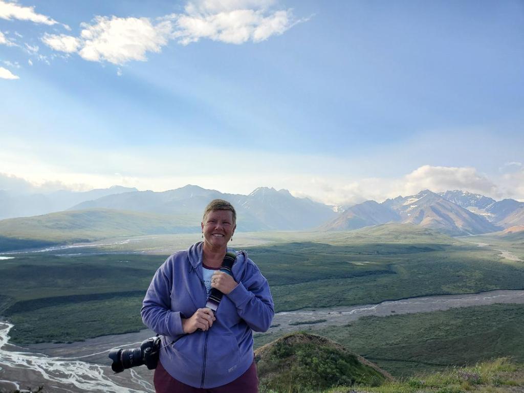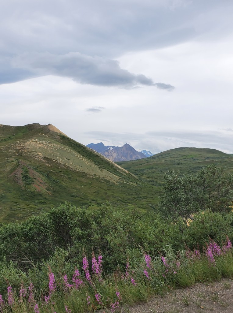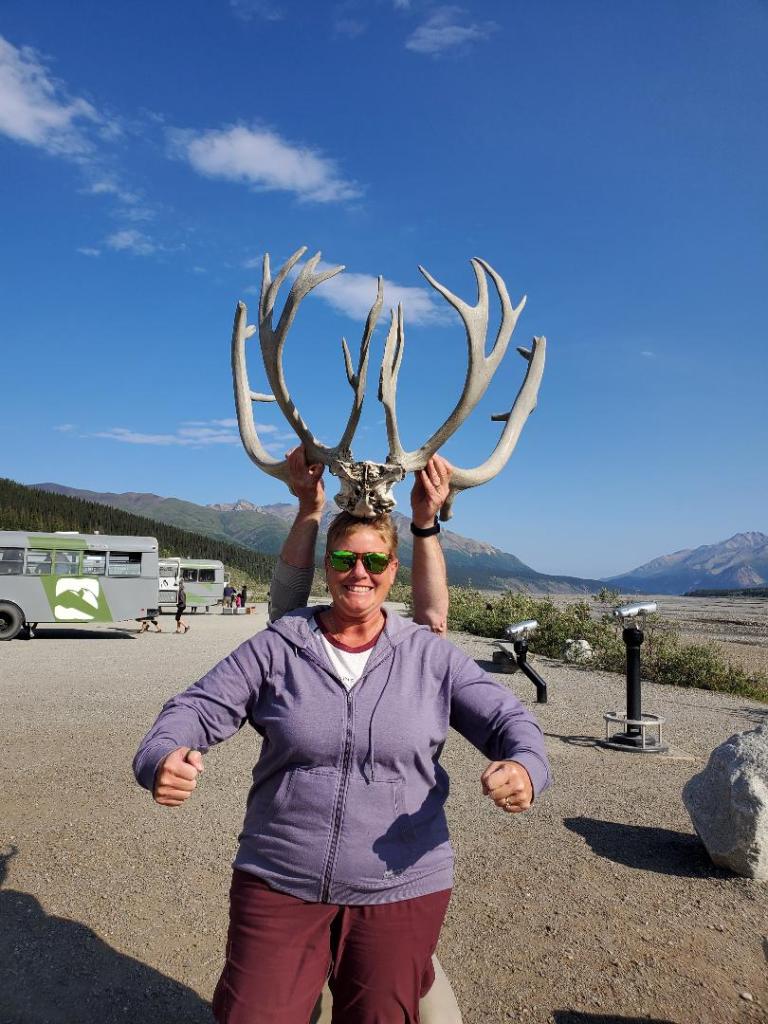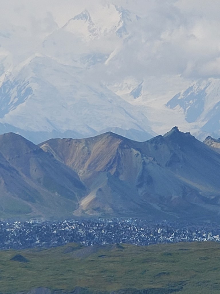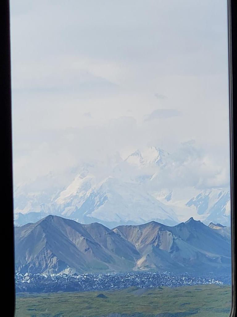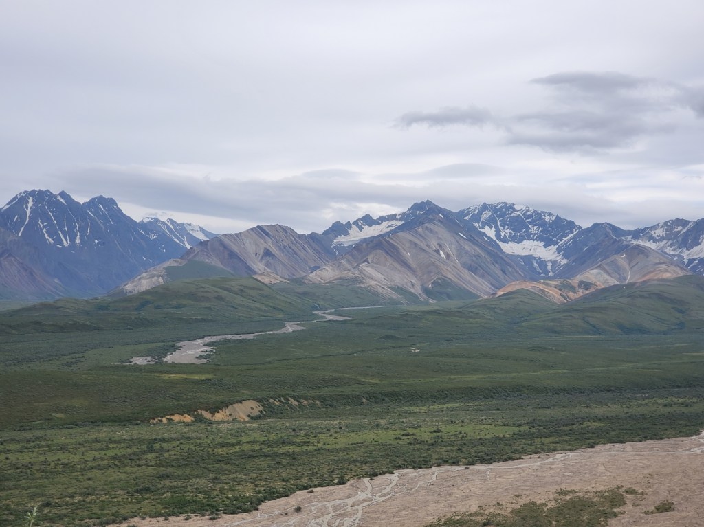 Sorry folks! I have been crazy busy trying to catch up at home and even put a short trip in to Colorado…but that’s for another post! Our last full day in Denali was spent on a 13 hour bus tour that took us 92 miles into Denali National Park. It is the furthest you can go on a tour bus and it did not disappoint! I know what you are thinking….how can a 13 hour day on a bus seem like any fun at all? Well, I have to say that God was certainly shining on us that day…not that He doesn’t everyday…but this day was extra special. First off, it wasn’t a school bus. You may laugh but 13 hours on bumpy roads on a school bus sounds kinda miserable to me. We had bucket seats in a school bus shell. Second of all, we had a fabulous driver! His name was Erik. He is originally from Washington state, but lives his winters in Colorado…near the mountains in the cities of Breckenridge, Telluride, etc. Swanky ski towns. During those winters he drives school buses for the local elementary school kids. He had a shirt on that simply said, “Listen to Erik” It was his only rule for the day. Of course a lot of rules can stem from that simple concept – this was not lost on me. I would say that Erik was in his 30’s, and man, does he love his job. First, he told us about his job as a school bus driver in Colorado. He knows each of his student riders by name. He goes to their sporting events and goes to their music concerts. They, in return, sounded like they were enamored with him Erik”. They would organize days where the whole bus would wear their shirts and he would come in and eat lunch in the school cafeteria with them. He had a long school bus-esque rectangular rearview mirror to keep an eye on all of us. We, in turn, could see his face as well. There was a time when we were all ogling at a big grizzly bear that was only a few yards from our bus and he said what was even better than watching the bear was watching all of our faces as WE watched the bear. Erik spends his summers driving tour buses in Denali National Park and he really knows his stuff. He was able to talk about the flora and fauna of Alaska, history, the wildlife, rock and mountain formations, and hiking techniques for those who try to summit Denali. (About 5 years ago they changed the name of Mt. McKinley back to Denali-meaning the ‘great one’). He has climbed Mt. Rainier in Washington state in the hopes of someday getting a chance to hike Denali. So Erik was enthusiastic about what he was sharing with us and he went the extra distance to help each side of the bus get good photos and opportunities to see scenery and wildlife. We were very fortunate that we were able to see Denali that day. The smoke from wildfires were in the air much of the time we were in Alaska, but we had a couple of clear days that we got to see Denali, so we are in the 30% club….because that’s about the percentage of people who get to see her when they come…30%. I would be remiss if I didn’t mention some pretty scary roads we had to traverse in order to get to the lodge at the end of the road. After 15 miles into the park, the farthest you can go in a personal vehicle with a park pass, the road becomes a gravel/dirt road and the further you go, the skinnier it gets. When there are only tour buses and a few park rangers/scientists/road workers, it gets a little dicey…especially if you are doing hairpin turns around the sides of mountains. I was very very very impressed with Erik’s ability to drive that bus, even if my stomach dropped to my knees a few times when I was sitting on a ledge that was a sheer cliff drop off.