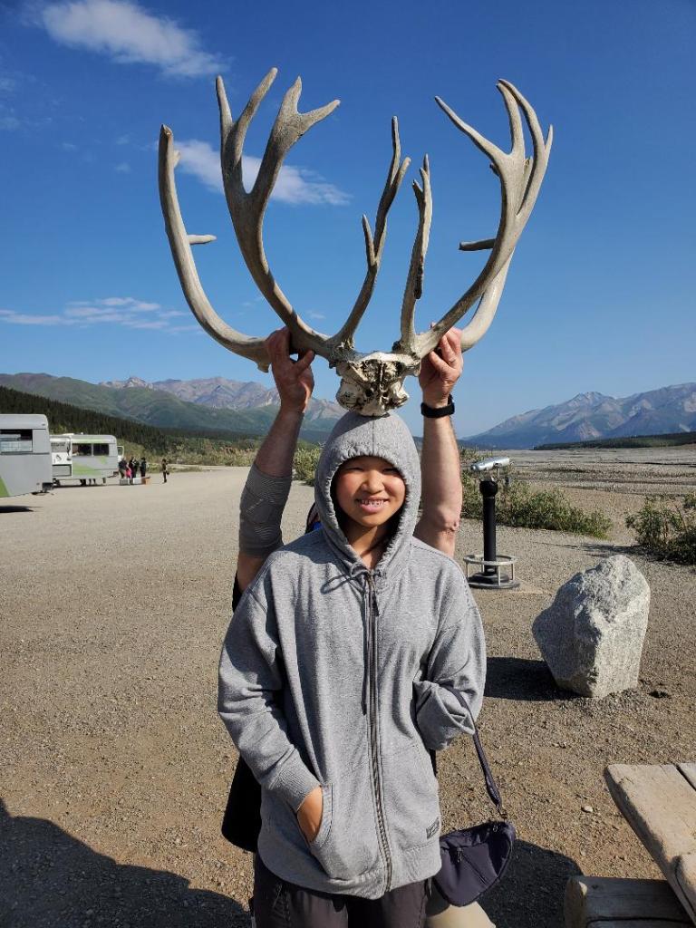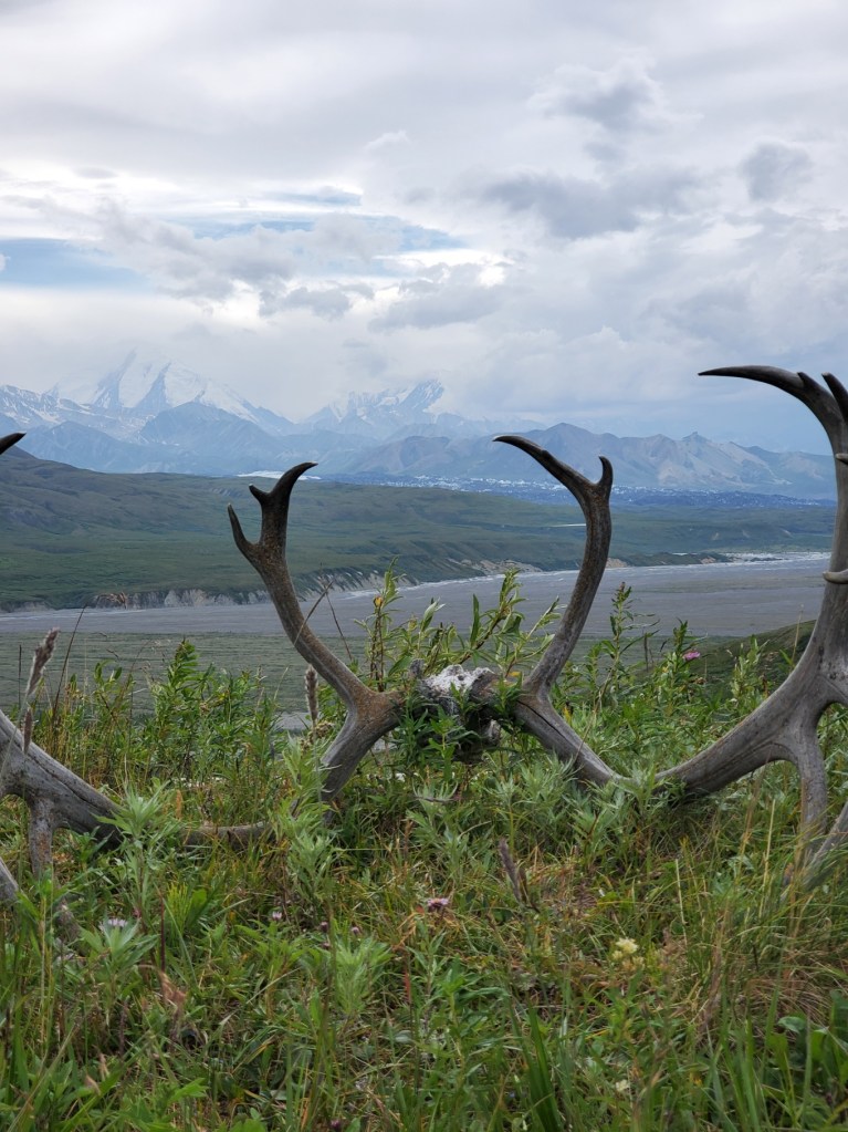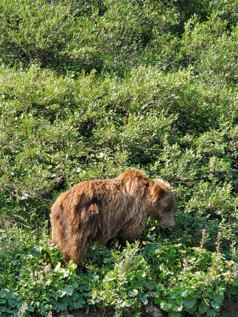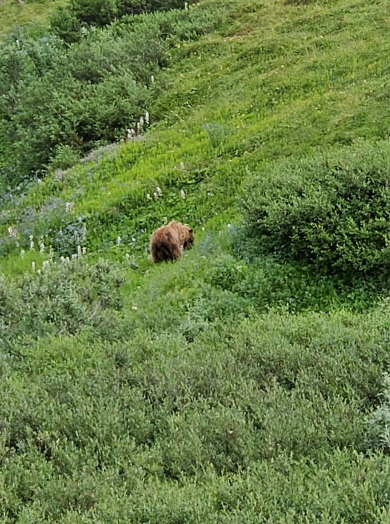 If you have been following along with our Alaskan adventure, you know that we haven’t seen a ton of wildlife. We saw a moose that was 1/2 a mile away whilst on the train. We saw a porcupine (that I thought was a large, wide cat) about 20 yards away – it was dusk….and I figured it out before I went to pet it, a couple of eagles seen from the train, a very industrious beaver couple building a dam across the river from our hotel, and a lynx slinking on the same side of the river as the beaver couple, which caused them to disappear for awhile. So really, it was nothing real close (except for the porcupine – which was I think an oddity all the way around for Alaska). We weren’t seeing Moose walking down Main Street or bears munching on blue berries. (another 2 weeks and the blue berries would have been ripe and maybe it would have been different). Remember way back when on TV there was a show called Northern Exposure? I loved that show! Anyhow, we weren’t seeing the animals I thought we would see frequently. Locals talked about them, but it was just too warm for them to be out and about for us to see. Even Rich, who has been to Alaska several times, was shocked at the lack of wildlife. However, our luck changed on our bus ride. We saw 7 moose, 6 arctic ground squirrels (which Erik called “bear burritos”), about a dozen caribou, 4 dahl sheep (although they were very far away), a whole brood of ptarmigan, and 8 grizzly bears….including a momma and her cub. We got to see a grizzly bear and a caribou up close and personal because they walked around our bus as it was pulled over on the side of the road. I had my nice camera with me and have not had time to go through those photos yet. These will be all the ones from my phone. But they aren’t too bad!