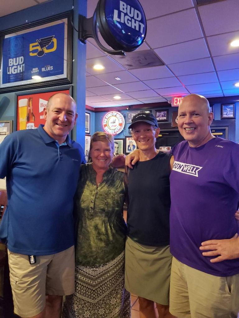 We left Morgantown, WV and made it to Dayton, Ohio. We had dinner with my cousin, Bill Neitzke, and his wife, Lori. We were stationed together a couple of decades ago at Grand Forks, ND. We ate at a British Pub restaurant and it was really good. Rich even had the fish and chips. (when in Rome…) It was great catching up with them and what their kids were up to….along with different branches of our family tree. Even though we have the same last name (Neitzke is my maiden name), we figured out that our great grandfathers were brothers….at least I think that is what we decided. We then drove a few miles out into the countryside to Xenia, Ohio, to stay with good friends, Matt and Lorraine Bonavita. Our two boys are the same age as their two oldest boys. We lived on Hawaii Street some 20 some odd years ago on Grand Forks AFB, North Dakota together. I have always just loved this couple….we always had so much fun with them. That has not changed. We were up until midnight talking like the years had never been there. We had planned to spend several hours at the Air Force Museum showing Lily around, but we just stayed and visited with them. It made my whole week for sure! We drove from Ohio to just outside of St. Louis on Tuesday. Rich had contacted a whole bunch of people he had connected with on LinkedIn that he used to work with in Grand Forks AFB, ND 20+ years ago. A lot of them were working as civilians at Scott AFB, IL. This is also where our oldest son was born….so we drove by our old house as well. We got together with several folks for dinner and drinks from the 906th tanker squadron. There were boom operators, pilots, the commander at the time, orderly room personnel….a mishmash of people that all worked there in the mid to late 1990’s. We had 11 folks there at one point. It was a lot of fun. We also got to reconnect with Chaplain and Shannon Howard from our time in Norway 11 years ago. (I can’t believe it has been that long ago already!) It was awesome catching up with them and finding out how their kids were doing. They went to the International School of Stavanger with our kids. We stayed the night in western Illinois (the photo of Rich in the corn was from there…figured we were getting closer to Nebraska if we saw corn this high!) and then took off across Missouri on Wednesday to get to Kansas City in time to have lunch with our fabulous daughter-in-law, Michelle. Joe wasn’t due back from his month of fun in Fort Polk, LA with the Army National Guard until the following day, so we had her all to ourselves! After a nice lunch and even better company, we put Lily behind the wheel and had her drive 3 hours home to Omaha.