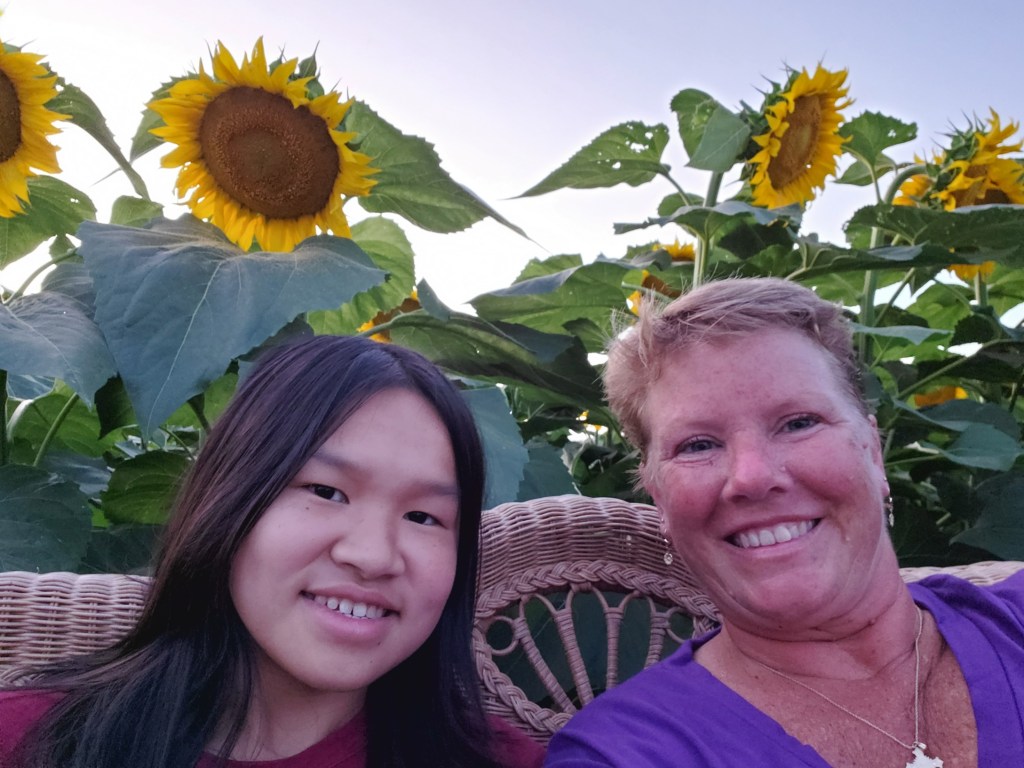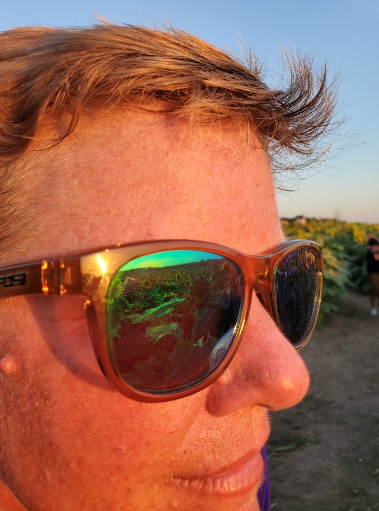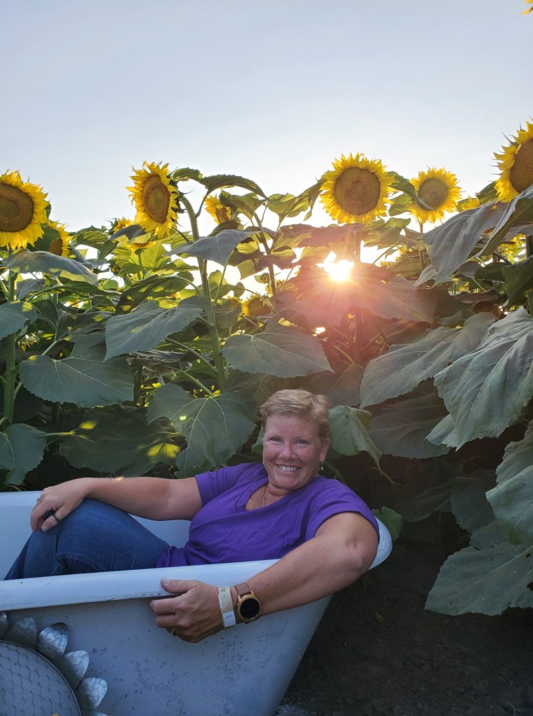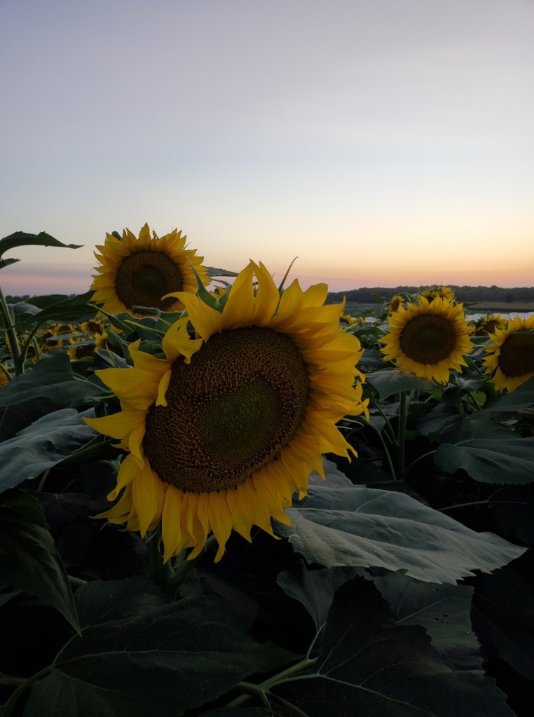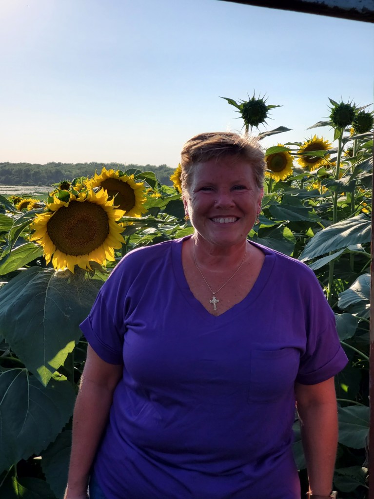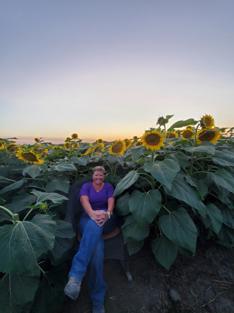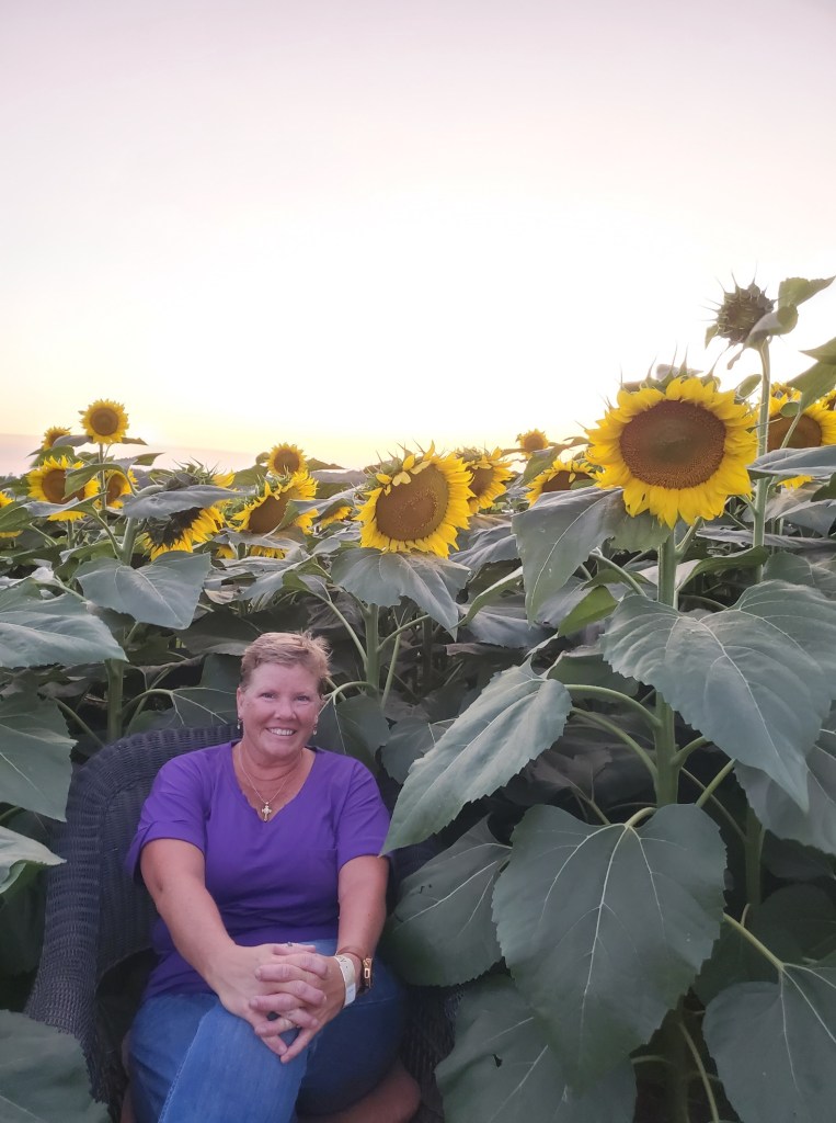 Yesterday I turned 50 1/2 years old. I figure no one really counts half years unless you are under the age of 18, over the age of 80, or have a terminal illness. Well, I fall into one of those categories so I made it to my half birthday! I celebrated by doing something I absolutely LOVE doing….taking photographs in sunflower fields with Lily. We went out to Nelson Farms in Valley, Nebraska again. This is my third year going and I absolutely love it. They set aside a few nights a week to be open during sunset hours for photographers. Lily and I tromped around the sunflower fields until it was dark last night. These are only my phone camera shots. I have yet to go through my good camera shots yet. I have been busy going through the nearly thousand photos I took in Alaska. (I would say I am blushing shamelessly stating that, but wow, it was just so much to take in while we were there!) Those photos will come soon. Until then, here are some sunflower photos with Lily and me. I wore my purple shirt as Leiomyosarcoma’s symbols are the sunflower and a purple ribbon. I decided to just embrace it.