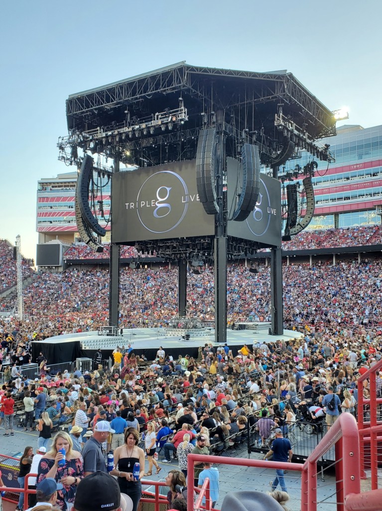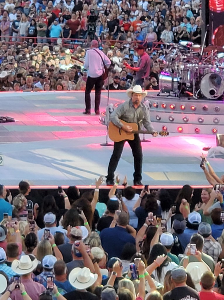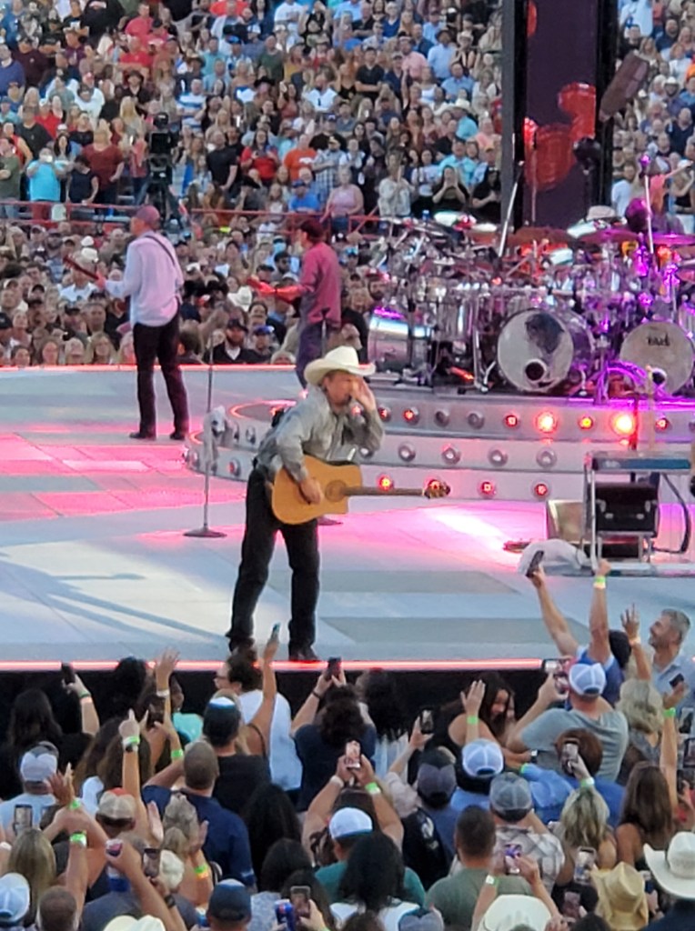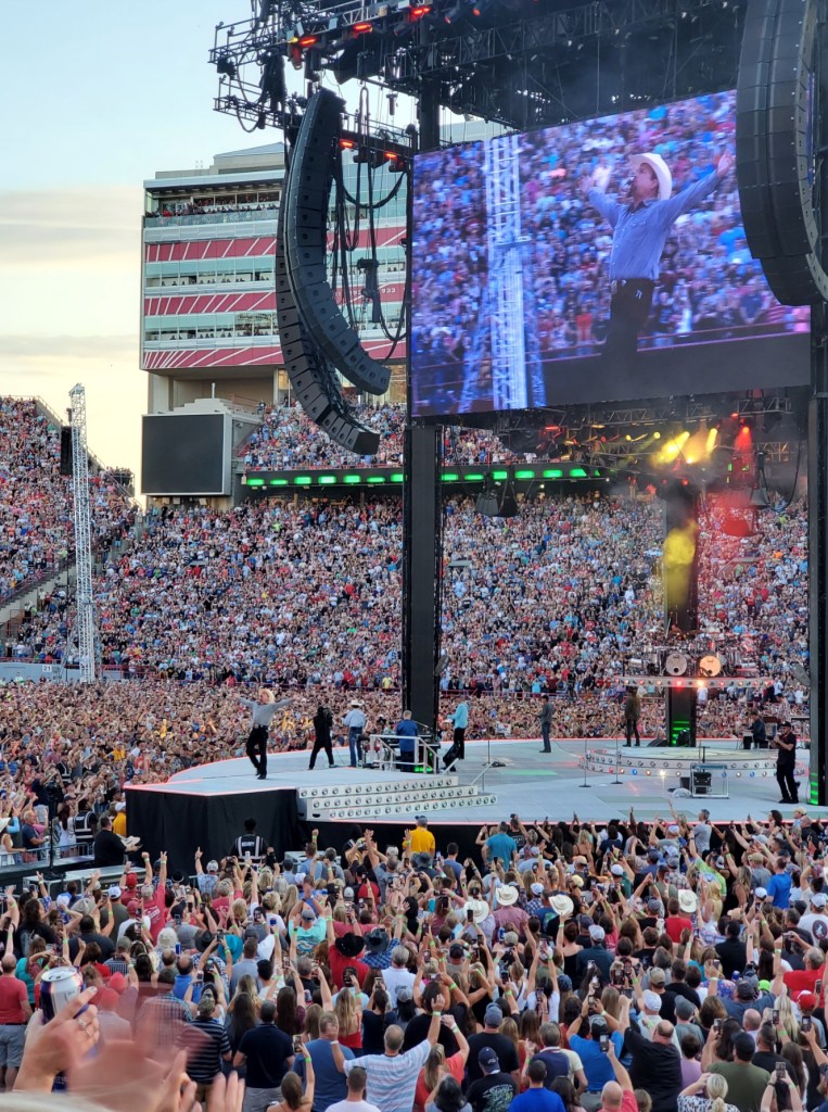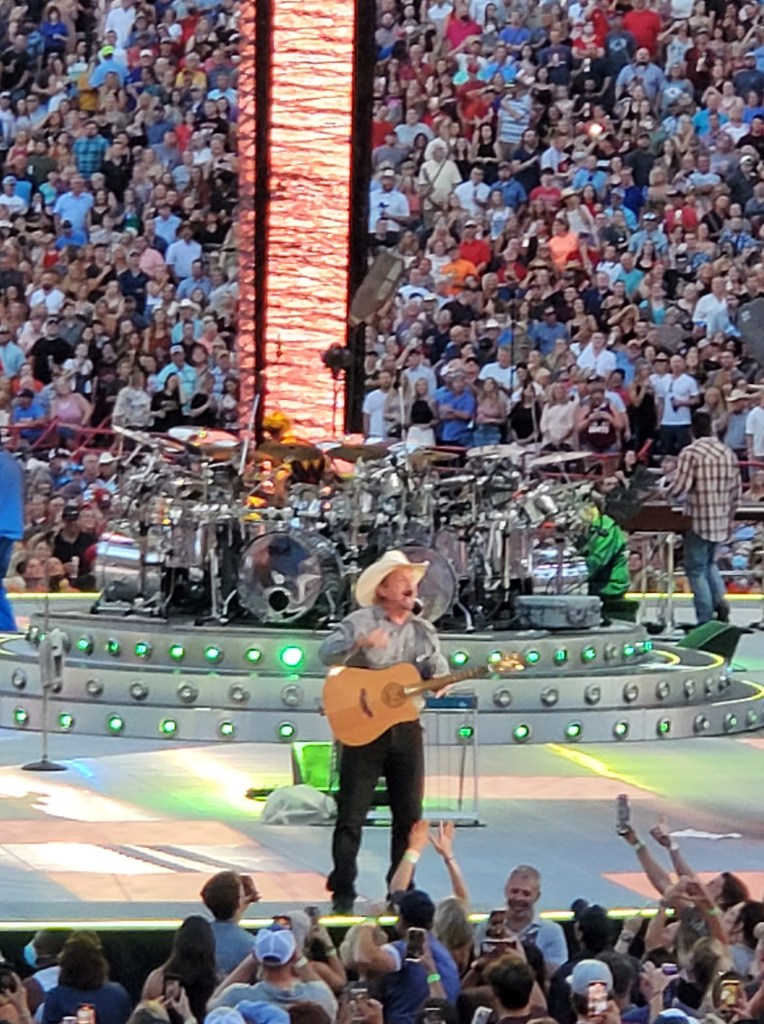 On Saturday, Rich and I were able to go see Garth Brooks on his stadium tour in Lincoln, Nebraska. He played at Memorial Stadium, home of the Huskers football team. The last time there was a concert there was 34 years ago during Farm Aide. Our stadium rivals most pro stadiums and holds about 91,000 people in the stands. However, the floor of the field was also opened up, so I am guessing there were over 100, 000 people there. I have to admit when I saw that crowd, it made me nervous. I don’t like huge crowds to begin with. Add me having stage IV cancer and COVID running rampant…well, it added to my anxiety spike. By the grace of God, I was on the end of a row…a row that was blocked off and just had open space between sections. There aren’t many spots like that in Memorial Stadium, but I had one. I wore a mask. Not many people did. I needed to try and protect myself as much as possible yet still live my life and enjoy myself. Garth Brooks was floored by the huge crowd that sang each of the songs right along with them. I wish I could have heard what it sounded like a block away in the Bottoms, where Tim used to live. 100,000 people singing “Friends in Low Places” had to be phenomenal. It was inside the stadium. This was the biggest concert Garth had ever put on. If you have ever been to a Garth Brooks concert, you know he gives 110% and will just keep on singing. He sang for over 3 hours…and it was glorious. Most songs I knew…some were new to me. It was almost as fun to watch the people around me reacting with pure joy when he started singing their favorite song. There was a young man in his early 20’s with his girlfriend a few rows down from me. He had on his cowboy boots (as did I) and his cowboy hat and he sang every word to every song with this pure joy on his face…like he couldn’t believe he was there in that place….as if Garth Brooks was singing with him and not the other way around. Were there hiccups? Yep. Trying to get people into certain gates became a huge mess. We waited almost an hour in line to get into our gate. Some people were really drunk. Not my favorite. I worry about them. The stadium concession stands ran out of food before the concert even started. Yikes. That needs to get fixed before they open for Husker games! Added perks….the weather was phenomenal. It was a clear summer night with lower humidity. I wore jeans and wasn’t sweating. There was a nice, cool breeze. Garth’s wife, Tricia Yearwood, came on stage and sang several songs with him. She, too, was blown away by the “motherhusker” awesomeness of it all (Garth quote). I think half of Nebraska was there. Seriously.