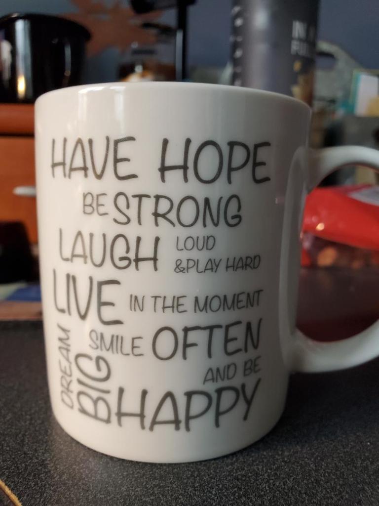 I am a member of a chronic cancer support group through A Time To Heal. We meet every other week and have only been meeting via zoom for the last couple of years. These people are such an inspiration. They are all stage IV cancer and have been surviving and thriving with their cancer for years. It was exactly what I needed – this group of wonderful men and women. Some of the members have been around since the group was founded in 2010…which is inspiring. We have 3 moderators who are either former oncology nurses or psychologists. They are more like friends and a part of the group though. Those three moderators are retiring this month…so it will be a whole new atmosphere in January as our group will be merged with another group as well. The outgoing moderators went to each of our homes and left a box on our doors. We opened them together during our last zoom meeting together last week. We each got a beautiful mug filled with candy. I loved the message on the mug so much that I wanted to share it with you. Whenever I start to get overly anxious about my upcoming scans and it threatens to overshadow my Christmas season, I glance at this mug and adjust my attitude. I think that you don’t have to have stage IV cancer to get a good message from this mug – so I am sharing it with you all!