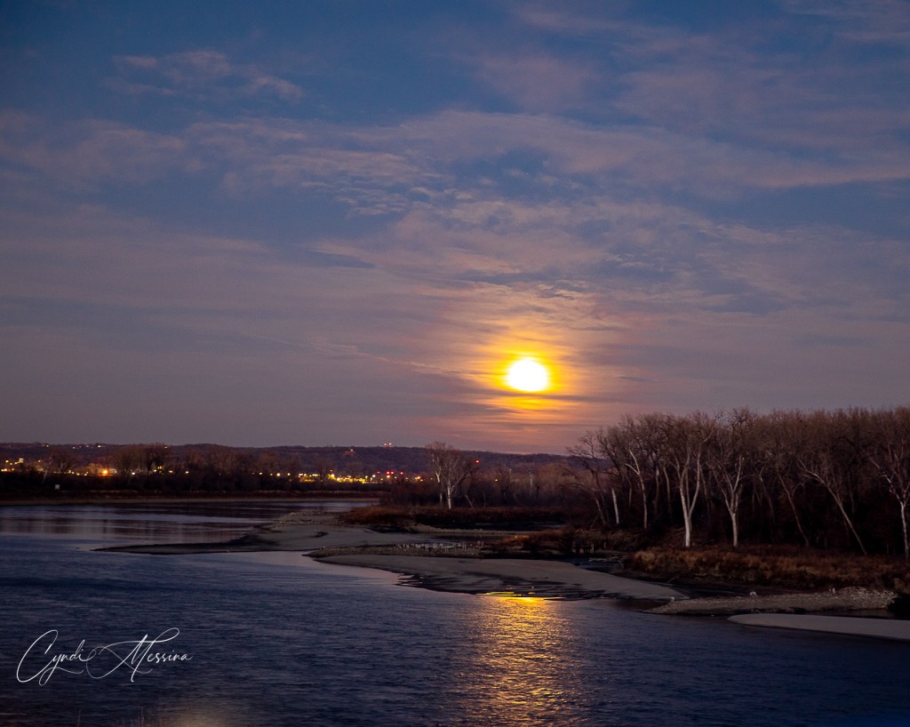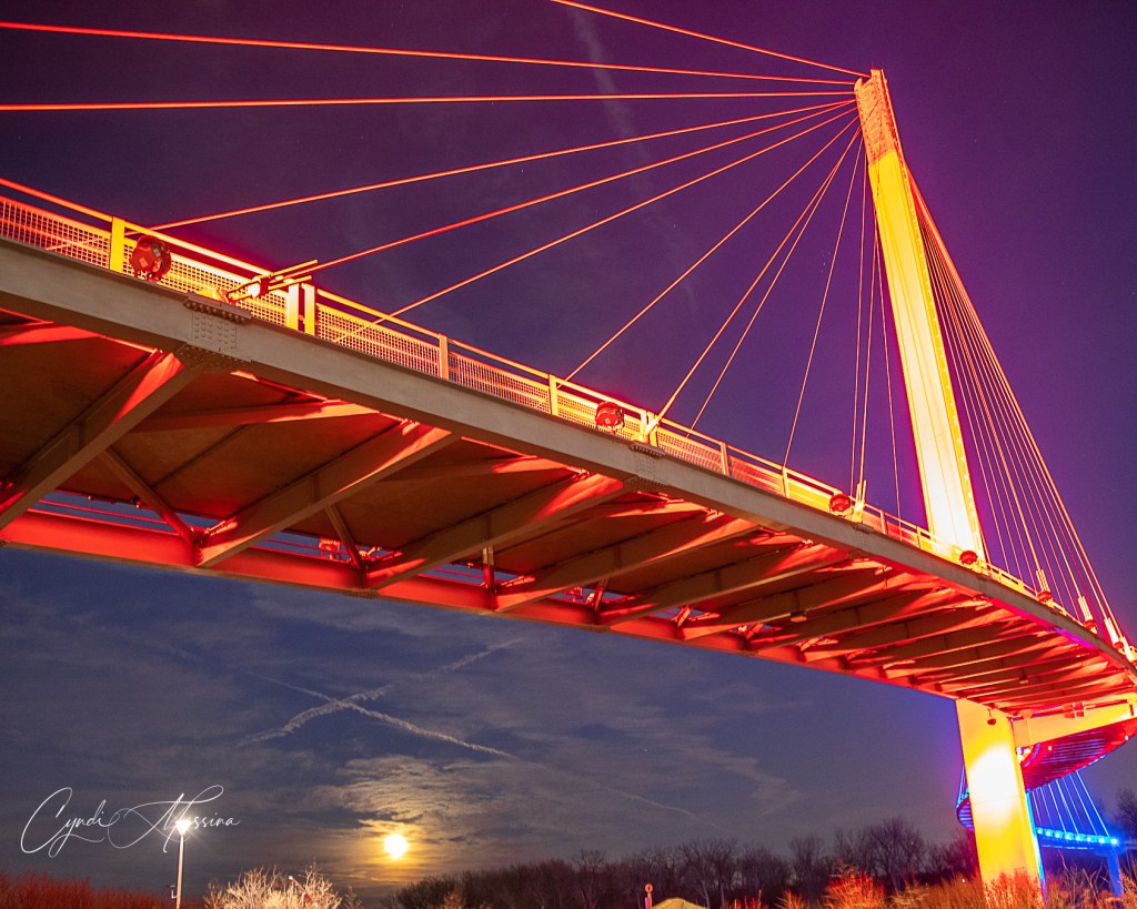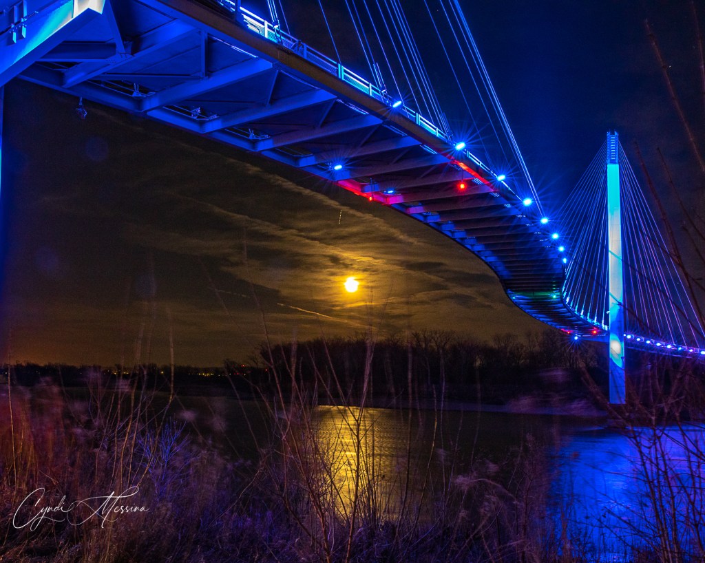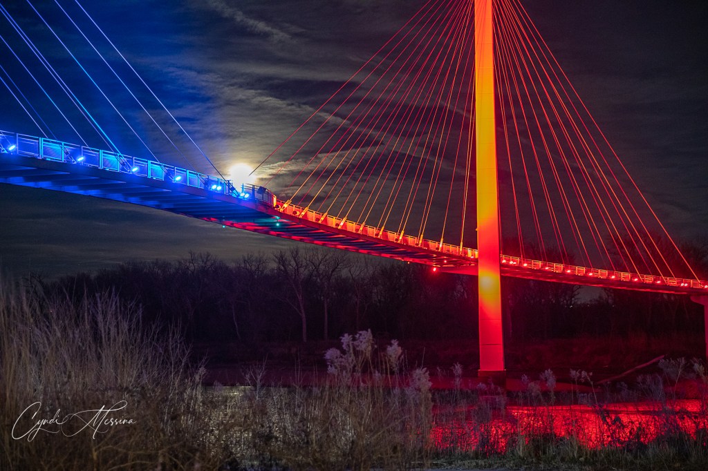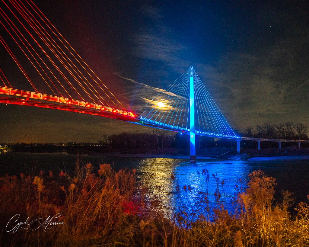 This past Sunday, Rich was a real trooper and took me to a couple of places that were on my Nebraska bucket list to photograph. The first stop was the Omaha National Cemetery. It is the military cemetery in the area and has been decorated with wreaths for the Christmas season. The second stop (after stopping at the mall to sign a permission slip for Lily to FINALLY get her ears pierced) we went to the Boby Kerrey Pedestrian Bridge. For those of you NOT from the Omaha area, this is a lit pedestrian bridge between downtown Omaha, Nebraska and Council Bluffs, Iowa….over the Missouri River. There was a full moon and the sunset was pretty spectacular as well. I was able to get some really good city scape photos of the Omaha skyline. This is a bit out of my comfort zone as taking photos as it is getting dark is a challenge. Plus, the wind was blowing like crazy! The photos from on the bridge were hard even on a tripod because the bridge was vibrating in the wind. The suspension cords were shaking so bad it sounded like a freight train. I also want to mention how COLD it was…and with the wind…it wasn’t a lot of fun. Thanks to Rich who stuck it out and only said once or twice….”Are you ready to go? I can’t feel my feet!” The Troll, Omar, lives under the bridge.