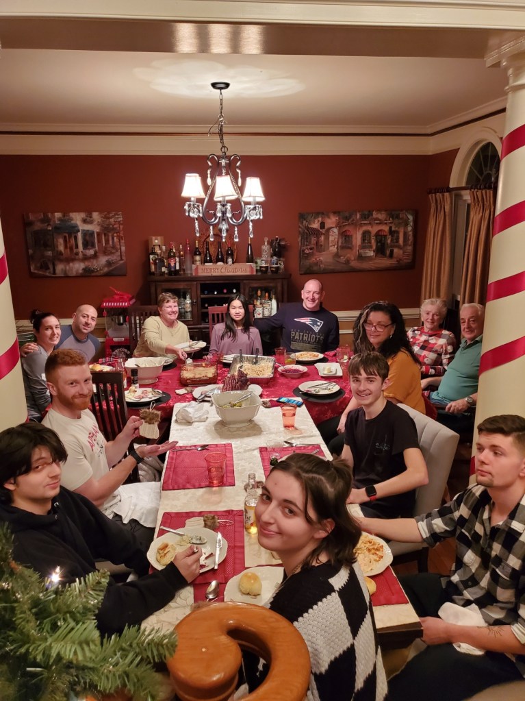 If you think this sounds like a crazy comedy movie….well, it could be! Lily, Rich, and I flew to Washington, D.C. on Christmas day. I felt bad for the people having to work at the airport and I mentioned that to the gentleman at SW that was checking us in. He told me not to be sorry – he was making quadruple overtime! So I just said, “Merry Christmas!” and went on my way to the gate! We were visiting Rich’s brother’s family: Joe & Heather Messina and their kids. Rich’s parents were already there from Destin, Florida, and so was Rich’s sister, Tammie, from Palm Harbor, FL along with her two adult sons. Our son, Tim, was able to join us from West Virginia, just in time for dinner on December 26th, which was the big Christmas dinner. Joe managed to pull off the Italian tradition of serving 7 fishes as well as lasagna and ham. We had 18 family members at dinner that night and it was delicious! (Good thing, because we were eating leftovers for the remainder of our time there – so, so good!) We did a gift exchange and taught those who had never played before how to play “the game” (Settlers of Catan). I love that Heather just learned the game and won twice! Those Messina boys weren’t too happy about that! It was nice to be able to spend time with Rich’s parents, siblings, and our nieces and nephews and their dogs.