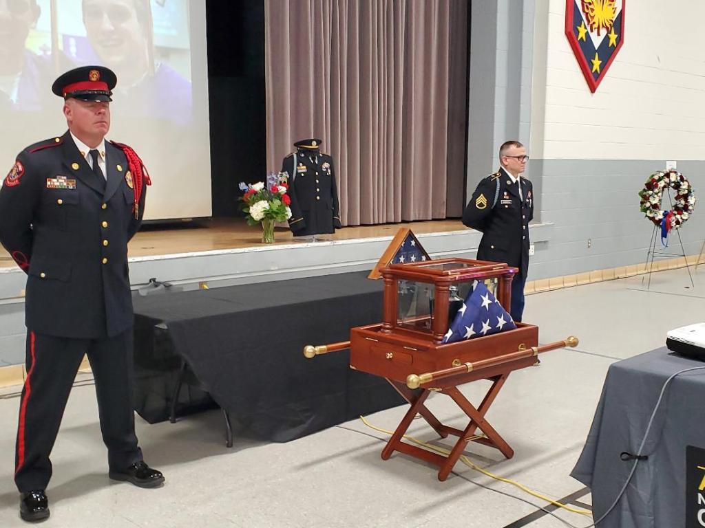 I can’t begin to tell you how last Friday and Saturday went down in Kansas City. The Olathe Fire Department and the Missouri National Guard pulled out all the stops to send Joe off in true style. There were so many soldiers there….so, so many firefighters….so many Delta Chi alums…and so many friends and family from all over the country who came to help us mourn and celebrate a life well lived. We were there a couple of hours early each of the days because we wanted to be present when Joe’s ashes were brought to the armory. They left the mortuary in a hearse, but they were accompanied by Joe’s crew on the firetruck with his bunker gear neatly folded in his spot on the truck. They led the way with lights going, leading Joe to us. There were also firemen in their dress uniforms as honor guard at the armory, creating a corridor to the entrance to the armory. They saluted Joe’s ashes as he was brought in by his crew and received by his family. It was incredibly emotional both days. Friday there were almost 100 people there….Joe’s family and closest friends and colleagues there to welcome him. We each took our turns paying our respects to Joe…which was hard….how can a man so full of life be reduced to ashes in an urn? To be quite honest with you, Rich and I just sobbed uncontrollably in front of that urn…as did his silblings. My heart shattered anew watching Michelle stand there with her hand on the top of the urn…speaking words to her soulmate in her heart. Watching my mom kiss her fingers then place them on the urn of her oldest grandson…gutted me. There were 250 well thought out photos Michelle and Joe’s friends help pick out for a slideshow that played in a loop during Friday night. Although the actual visitation didn’t start until 5, we decided to start receiving people at 4:15 as there were already so many people there. The line lasted for two and a half hours. First off, this was a long time…a lot of people. They figured we had 550-600 people there on both Friday and Saturday. The army got one keg donated and others were brought by Apex Realty…the company Joe worked with prior to becoming a firefighter. We ordered food. Never really saw any of it. The firefighters picked up the tab…which was sizeable. They really were so kind and made sure we were taken care of in every sense of the word. The funeral home picked up 95% of the tab because Joe was a veteran and a first responder. They did a wonderful job helping Michelle do all the things that a 28 year old should never have to do. When we went to pay for the rest of the bill, the firefighters with us told us it was already taken care of. We literally just had to show up and grieve. Michelle and I had brought scrapbooks and photos and things that were just “Joe” to put on display for people to look at. I think that helped some people see other sides of Joe, which was nice. There were lots of wreaths and flowers. There was even a spray of flowers from a bunch of people in Europe who had gone to school with Joe at the International School of Stavanger. It took my breath away when I read the card in the flowers….the last time he saw these people was at the end of his 9th grade year. I don’t know how to thank them…so I am doing it here. You touched me so much by that…after all this time. So many teachers of Joe’s reached out to me…especially from ISS. Most of his former rugby coaches have reached out to me as well. I have had nothing but love and support from literally all over the world…and that goes to show how one goofy guy with a huge smile and even bigger heart could touch so many people. Michelle, Rich, Tim, Lily, and I hugged and cried our way through the long line that seemed to never end. Lily is not a hugger…she is not one that likes to show emotion. We have been joking with her that she hugged more people that weekend than she had in her 17 years combined. She was a good sport about it though, and it was a good thing for all of us. I got to meet some people I only knew by name and reputation…Michelle got to meet some of our parish family from Omaha, who graciously travelled to Kansas City to support our family and celebrate Joe’s life with us. I saw some of Joe’s high school friends I hadn’t seen since he graduated in 2013. Military friends from all over the country travelled to support us, even though they hadn’t seen Joe in years. It was overwhelming and touched us so very deeply. We are just sorry we didn’t get to spend as much time with everyone as we wanted to. We did get to share stories though. I think there is a Joe story for every day that he lived. Goodness, he did not live life carefully…but full throttle with an emphasis on fun. People from all walks of life came up and shared Joe stories…some funny, so more serious on how Joe had affected their lives. At one point, the Goosenecks (Joe’s company in the army) came up and presented Michelle with Joe’s combat helmet. He had taken that to Qatar on deployment and then to St. Louis, when they were activated to keep peace on the streets during riots.