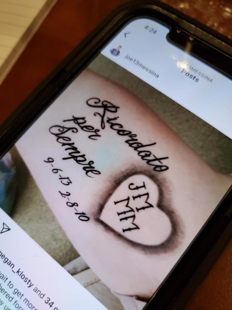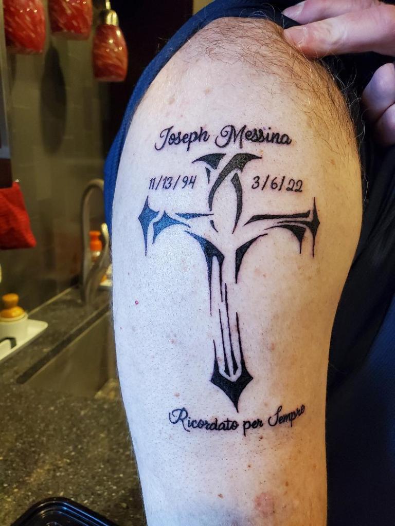 My brother and sister-in-law, Joe and Heather Messina, arranged to have Tim fly out from California to Omaha the day Joe died. I cannot thank them enough. What a relief to have my children under by wing and held close! My sister-in-law, Tammie Revallo, fly out here from Florida a few days later. It was great to have her here. She got pretty good at finding the nearest tissue box when one of us had a wave of grief crash over us. Tam did so much more than that, including spending time with Lily while the rest of us went down to Kansas City to be with Michelle as she organized Joe’s services at the mortuary. She went shopping with Tim and me to get him a suit for the Celebration of Life and some more business casual clothes for the visitation. Evidently when you are 25 years old, you high school suits tend to run a bit on the small side. He knocked it out of the park. I have never seen him looking so professional and handsome. He was the first one up to speak at the Celebration of Life, reading his older brother’s life history in his obituary written so eloquently by his wife, Michelle. Tammie then went back with me later that day with Lily for us each to get dresses for the Celebration of Life. We quickly found what we wanted and I took up our dresses to the register to be rung up. The lovely woman behind the counter said, “Oh aren’t these beautiful! You must be going to a festive occasion! What fun!” My face crumpled as I told her they were our funeral clothes for Lily’s brother – my son. I totally lost it right in the middle of Von Maur. She felt horrible, God bless her….she stepped out from behind the counter and enveloped me in a hug and then quickly found me a box of tissues. Welcome to my new reality. I thought after I accepted my cancer diagnosis and moved on to accepting my impending death that the tears would stop flowing so easily. Wrong. I have cried a river…and I am not sure I knew that a human body could produce so many tears. We came home and Rich was there. He had had an appointment of some kind that day and was unable to help me pick up Lily from school, which doesn’t usually happen. However, he looked at all of us (Tammie, Tim, Lily and me) and said, “You are either going to gasp or cry.” I ended up doing both. It is not a secret that Joe had a lot of tattoos. He loves the art on his body and was always planning the next one. He had just finished his second sleeve with a large Valkyrie. More on that in a sec. Rich hates tattoos. Joe had his first tattoo for 18 months before Rich found out about it. He was mad! He is so anti-tattoo – it was a big point of contention between the two of them. Anyhow, Rich had been going through a lot of Joe’s files on his laptop, trying to help Michelle get into accounts in his name, etc. He found a drawing that Joe had done with he was about 14 or 15 years old of a cross that he had drawn himself. He wanted it to be his first tattoo. By the time he was in college and started getting tattoos, he never got that cross. He had elaborate tattoos of St. Michael the Archangel, La Sagrada Familia Basilica in Barcelona, Japanese masks, olive branches, two roses for each of his siblings, quotes in Fijian on his ribs, a stone angel, a remembrance tattoo for his great grandparents, and a Valkyrie – but he had never gotten this cross. Rich found a tattoo artist who tattooed Joe’s cross exactly as drawn on his arm. Rich also put Joe’s name, the date of his birth and death, and then “remembered forever” in Italian…which was also part of a tattoo Joe had. The magnitude of this act Rich did floored me. There was also a call for all of his soldiers going to drill the weekend after his death to wear the “Messinastache”. Joe loved that corny moustache he wore. Every 4 weeks he had to shave off the downward growing hair on the sides of his mouth in order to be within regs of the Army for drill weekend. As soon as drill was over, he would start growing it down again. He called them his “little firefighters”. I have to be quite honest with you. I couldn’t stand that cheesy moustache and gave him a lot of gruff about it. However, Rich grew his out for the visitation on Friday night in KC. So many people were giving him double takes and saying how much he looked like Joe. Rich said the tattoo never gave him any discomfort. He hated the moustache though. He shaved it off within 5 minutes of getting back to the hotel from the armory on Friday night.