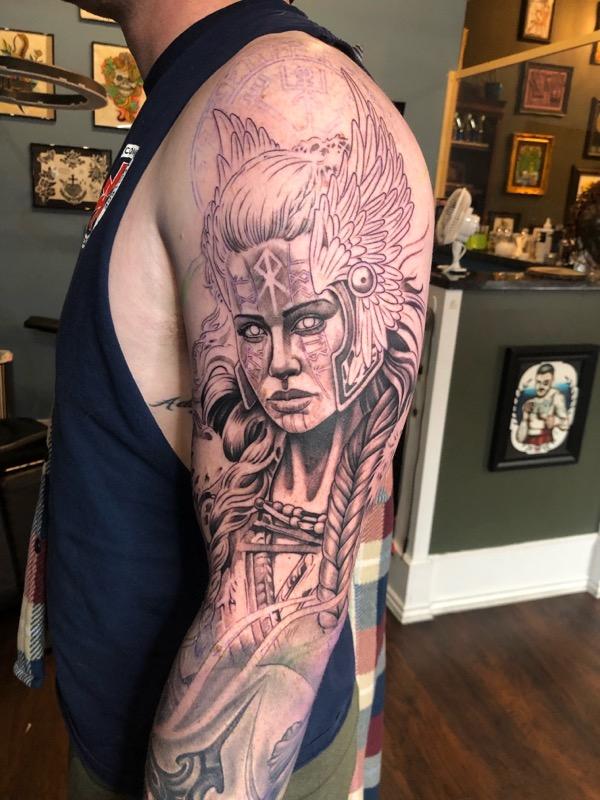 Rich’s tattoo is stunning – nice job, Dad. Really nice job. It’s a beautiful cross. Absolutely perfect. The initials on Joe’s remembrance tattoo are so poignant, aren’t they? That Valkyrie is fierce – wow. Rich does so look like Joe with that ‘stache – haha! I’m glad you have a picture of it.