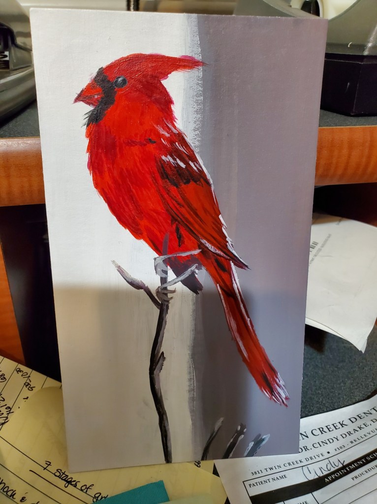 On to Lily. Rich didn’t realize it, but Lily had taken one of my photos of a cardinal I had taken recently and painted it during her free time at school. It turned out amazing! I am putting a few of her other paintings on here for you to see as well, because we think she is pretty talented. She was selected to go to an art camp for high school juniors at Hastings College this summer. We are so happy for her! Joe was always amazed at her artistic ability, as am I!