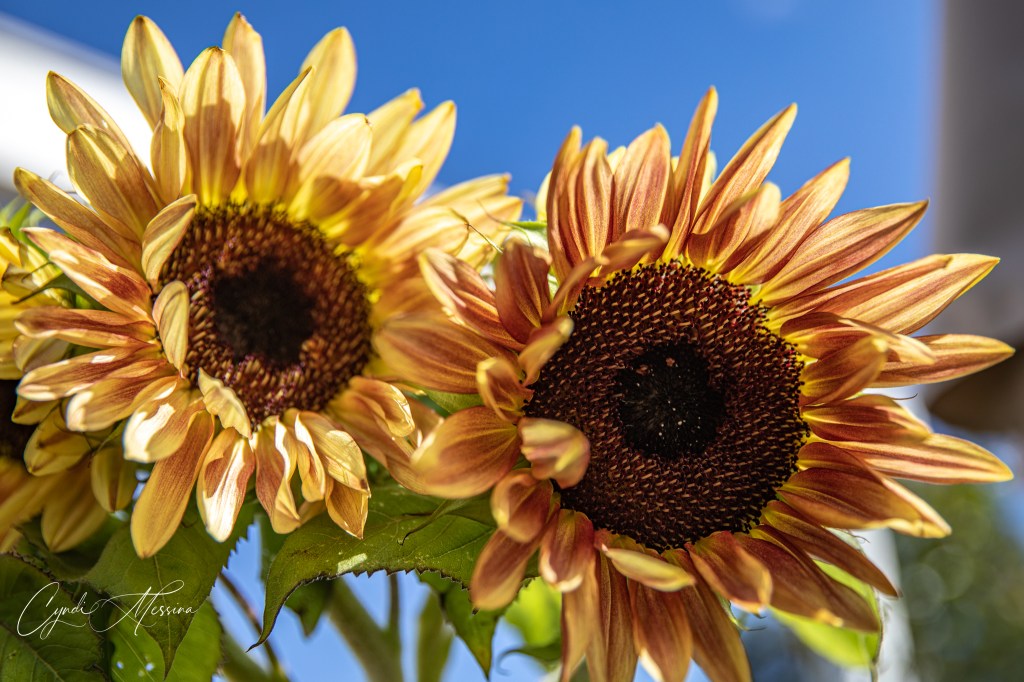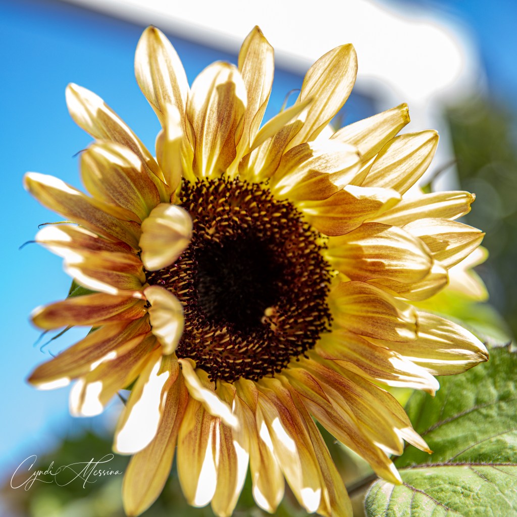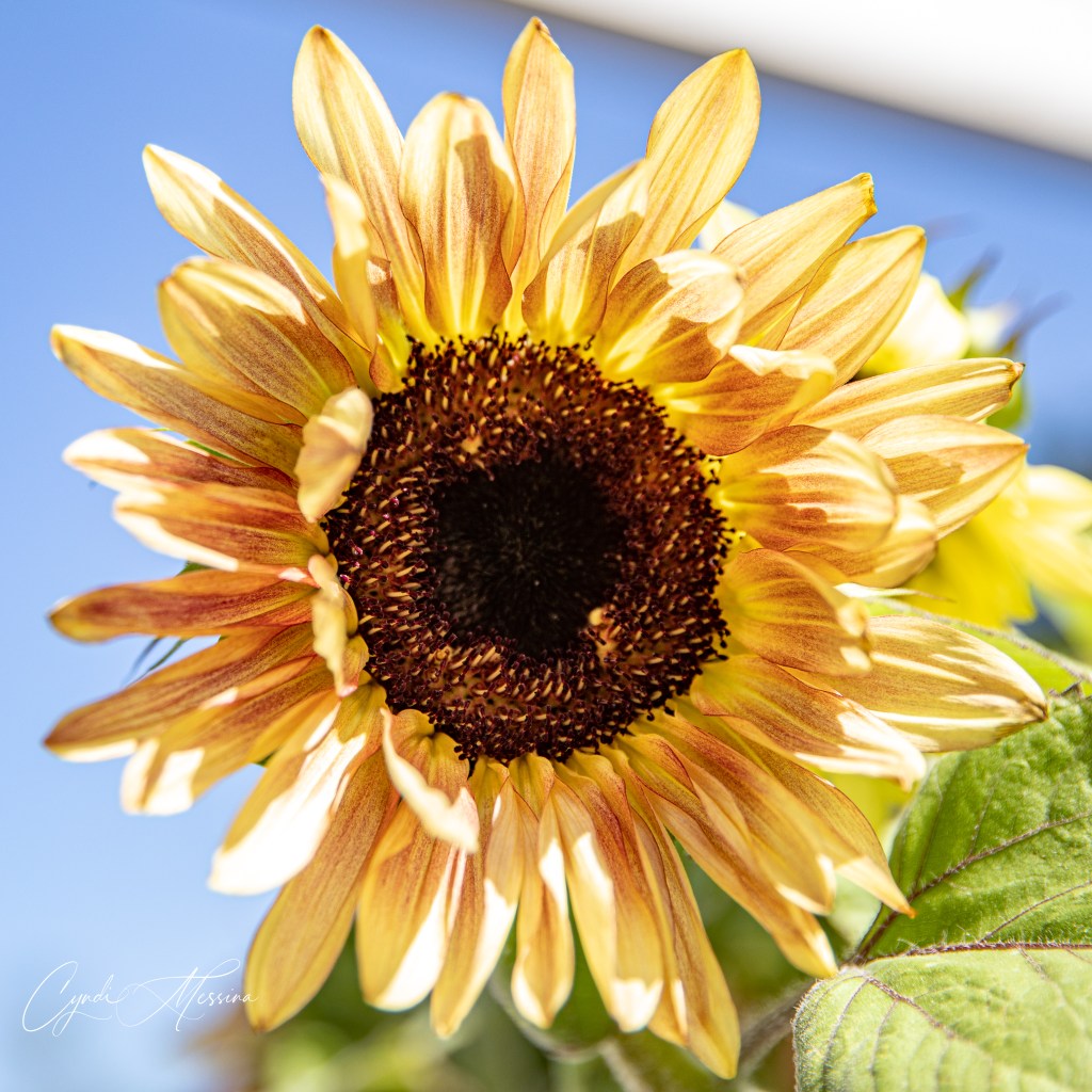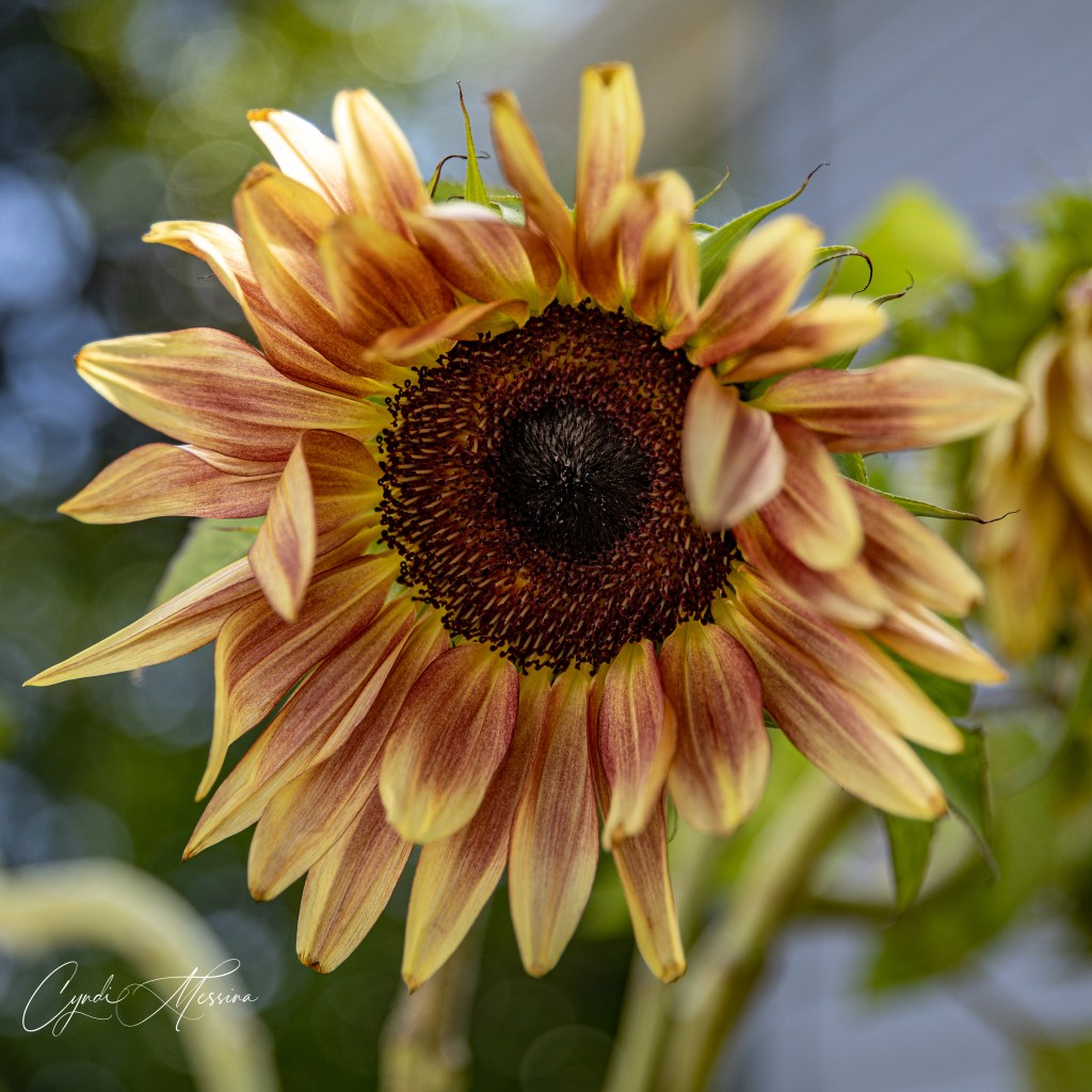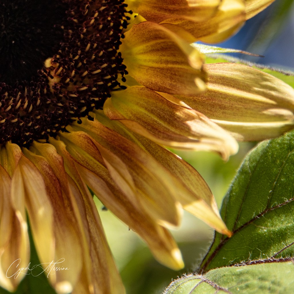 I like to spend a few hours every day on my back porch. Even in the horribly hot weather we have right now, I enjoy sitting out there watching the birds, feeling the sun on my face and the breeze through my hair. I have a set of windchimes on my porch given in memory of our Joe. It is relaxing for me to sit back there and listen to an audio book or write letters to Joe and listen to them gently clang in the wind as I sit under an umbrella. I am a big lover of sunflowers and a dear friend, Emily Ryan, more of a big sister, really, brought a few to me a couple of weeks ago. They lasted a long time for cut flowers and I was testing out a new lens and took them onto the back porch to get a few photos of them.