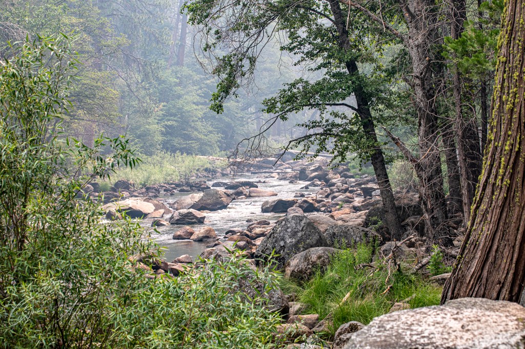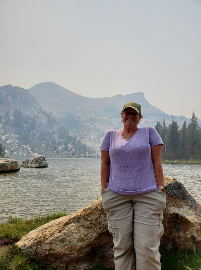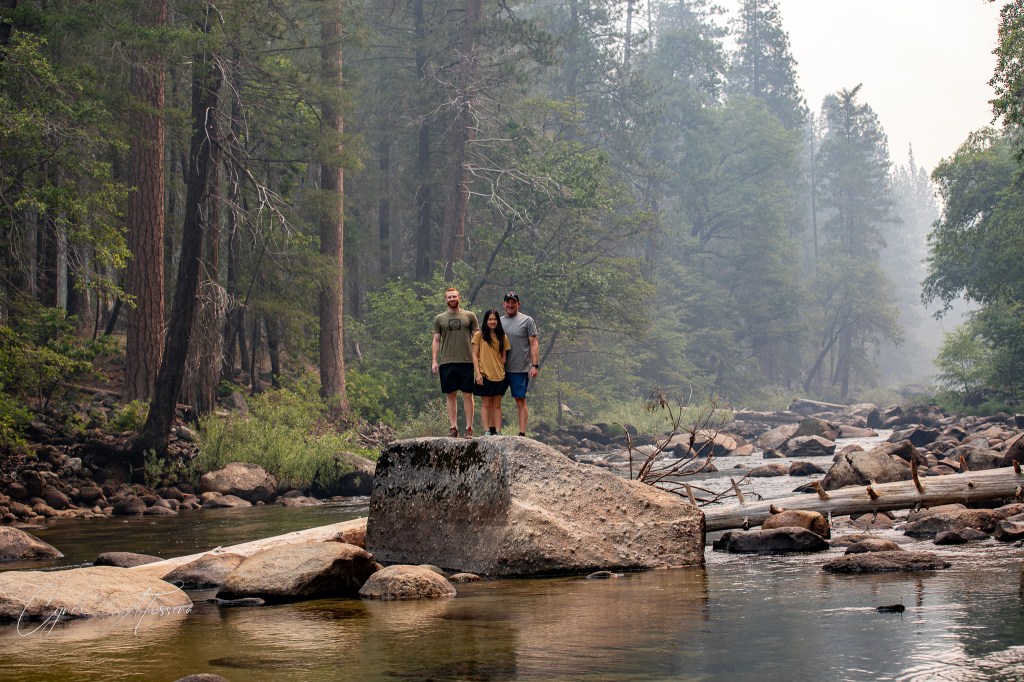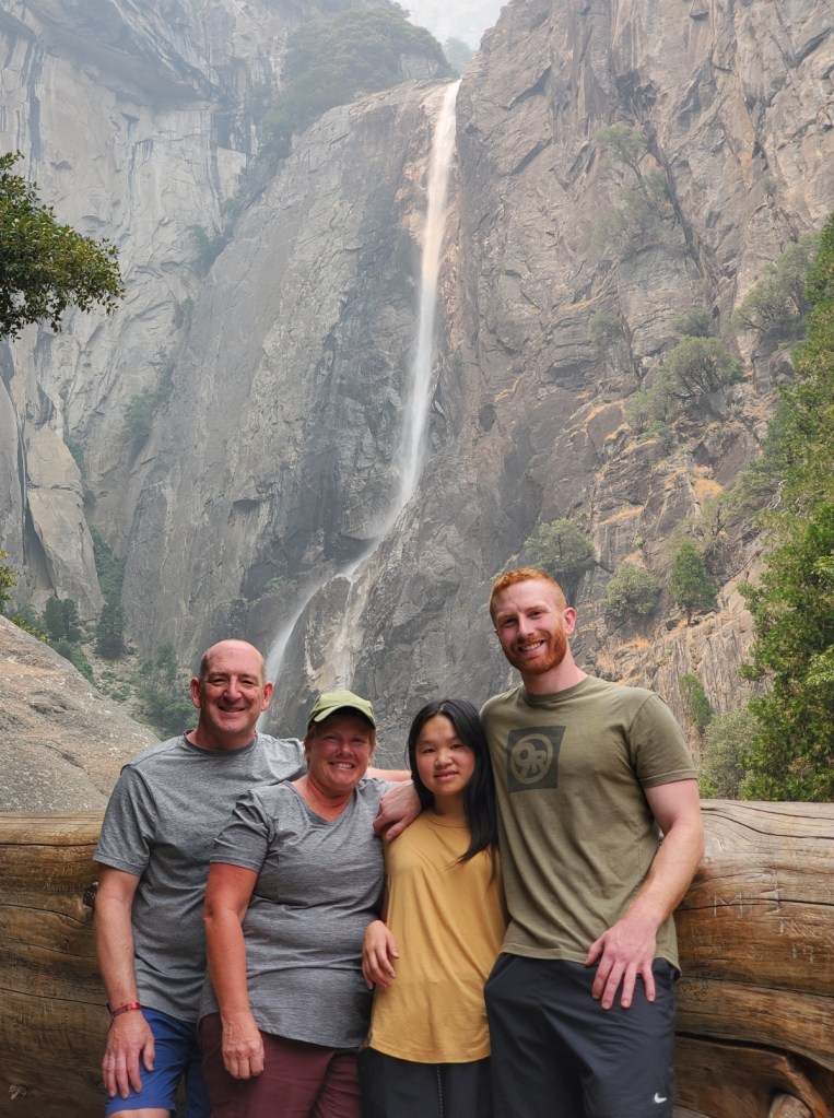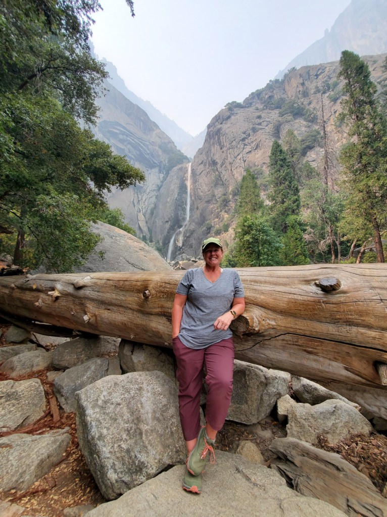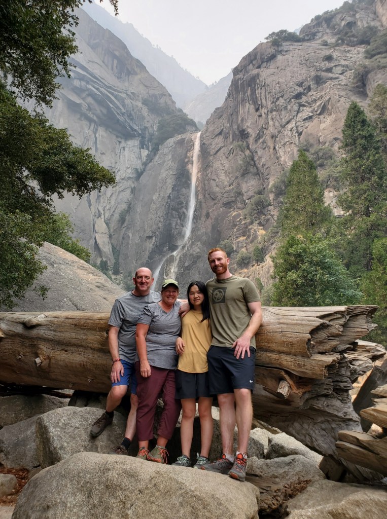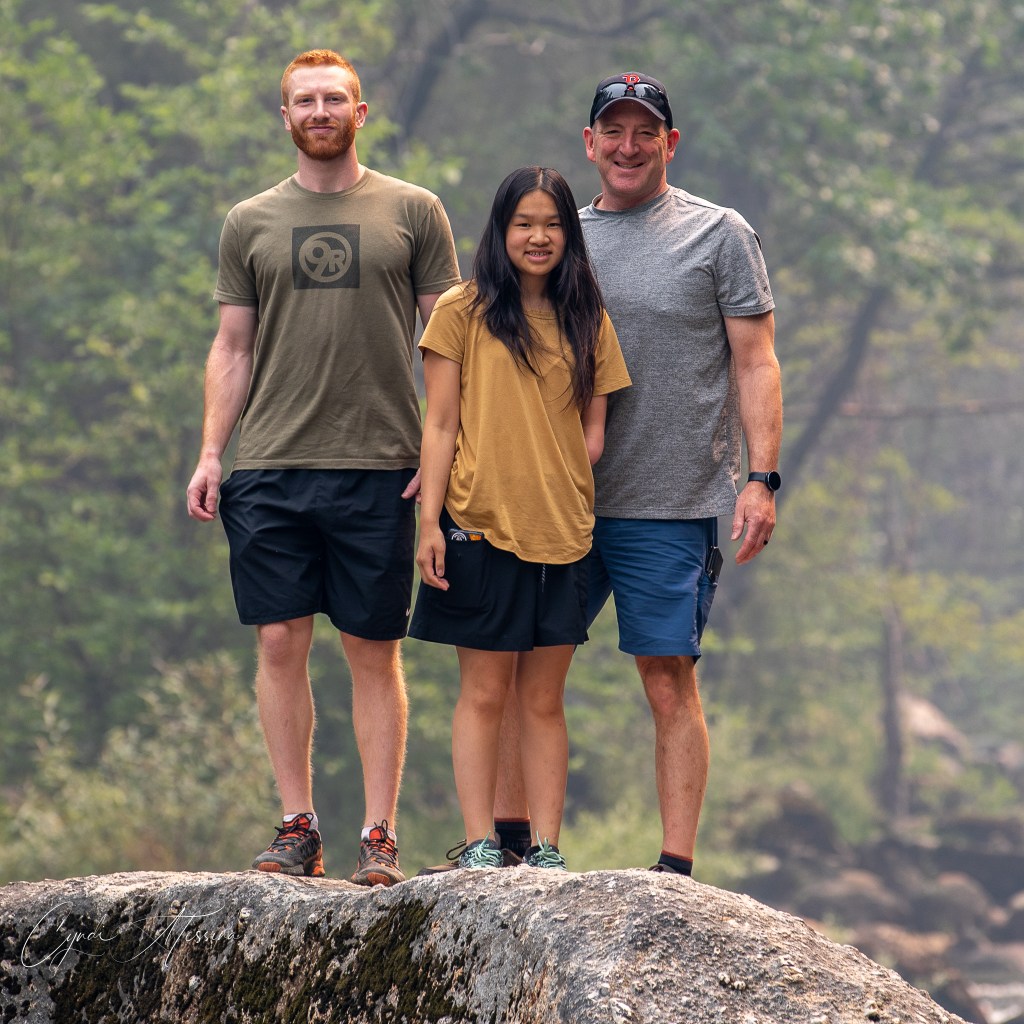 The first day in Yosemite was Sunday, July 10th. We went to the valley in Yosemite National Park and it was pretty smokey. I was almost rethinking our plan when we arrived as the smoke was pretty thick. You will see it in the photos. It isn’t that I developed them to look moody and dramatic. That was the smoke hanging in the air. In several photos I took, I couldn’t even see anything in the sky, but when I pulled the levers in Light Room to process the photos, a mountain would pop out of the soupiness of the gray sky. We did two hikes each day. The first day we went to the valley and hiked the loop. We also hiked to the lower falls. The main road in Yosemite is closed all year for much need reconstruction. That will make it nice for future travelers, but made it a little inconvenient for us. Many sites we could have driven to were relegated to 13-15 MILE hikes in steep terrain. It was triple digits already and the air quality wasn’t great. That was a hard pass for us. We went to the eastern part of Yosemite the second day. The smoke was better because we were further from the wild fire. We were also a much higher elevation. Our second hike of the day was to Elizabeth Lake, a beautiful alpine lake that we saw a total of 3 people on the trail. That hike started at 8000 feet and went to 9200…in the first mile. The second mile or so was flat…just in thinner air. I have to admit, I thought I might die on that hike. It was labelled a moderate hike but I think that is all 4.5 miles averaged together. That first mile just about did me in. I participate in a cardio class at the YMCA maybe 5-6 times a week. Zumba did not prepare me for this elevation. I was breathing but it was like there was no oxygen in the air for my lungs to latch onto. I felt like a fish flopping on a dock, stunned and trying to breathe. I had to gently remind myself that I am not a spring chicken. I am on lots of meds. I have stage IV cancer, to include spots in my lungs. I was going to make it to that lake if it killed me (and it almost did). I also envisioned that if I had a heart attack or a stroke and was unable to walk down, that none of my family could carry me. I could just see Rich with one of my legs, Tim with the other, pulling my body down the mountain trail with my head bouncing on the rocks as they try to get me to safety. That would be awful for all involved. So I took a breathing break every 100-200 yards. It made it slow going up, but I was still upright and conscious. That was my goal at the end of that first mile. Going done? Piece of cake! I could feel the oxygen flooding my lungs with every step down. It took about 1/3 of the time to go down compared to going up. I ended the day with 27,000 and change steps. Long day, great views, even better company. I love watching my kids interact now that they are adults. Lily was only in the 3rd grade when her youngest brother left the nest and made her an only child at home. So it is fun to watch them banter back and forth because she was pretty little when Tim left home and he is shocked at her being a senior now. Joe’s name was mentioned a lot because of course we felt a piece of our family was missing. It was good to talk about him…to tell stories of random ridiculous things he did as a kid (or better yet, as an adult).