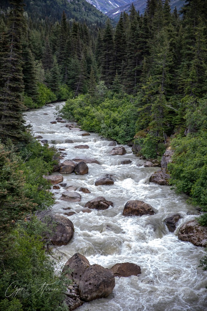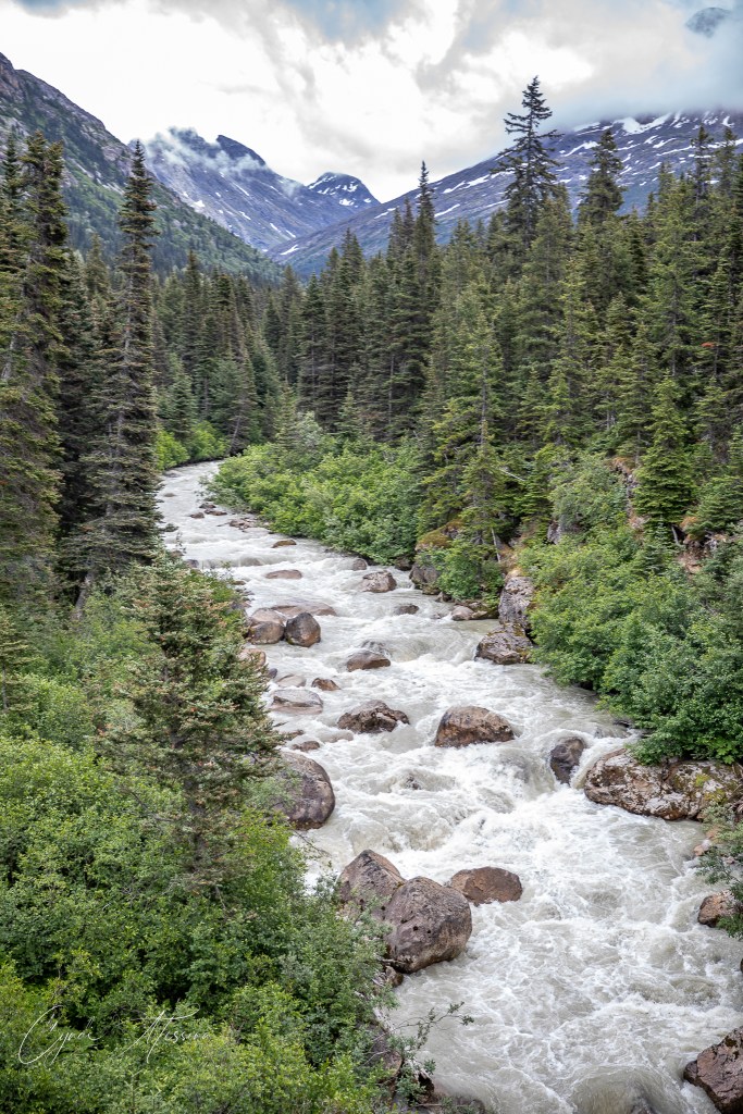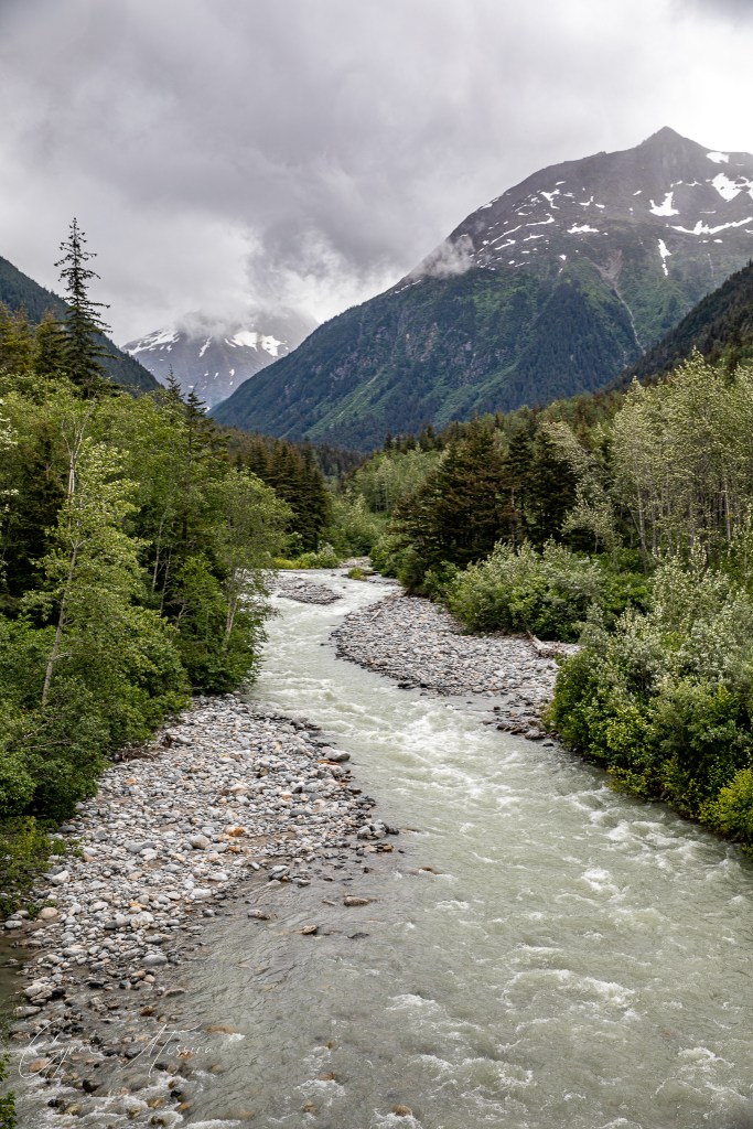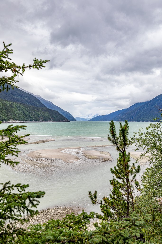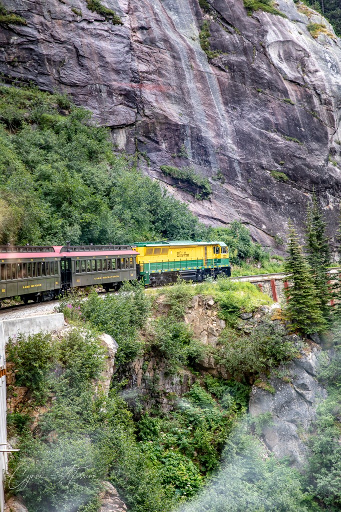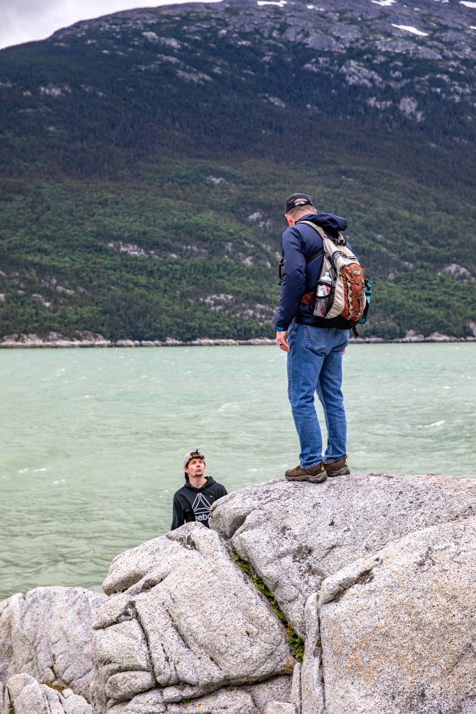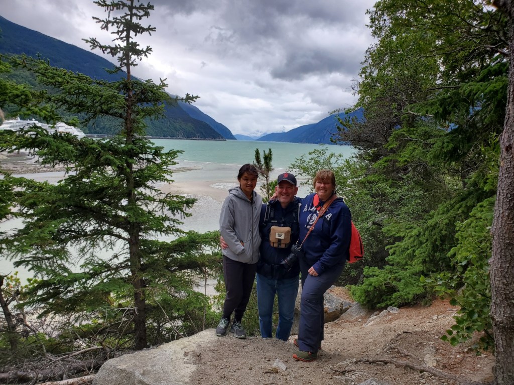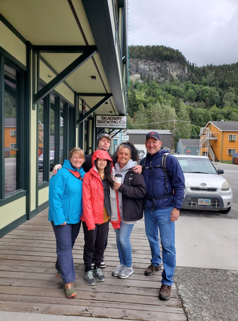 Skagway is a little Alaskan town that looks like it stepped out of the wild west. We had one of our longest stops in this little town, and some of the worst weather. It got pretty rainy and windy throughout the day. However, all this worked in our benefit, because our nephew, Dante, was working there as a seasonal worker in the town. His mom, Tammie, Rich’s sister, was there visiting him as well. So we had a little Messina reunion in Skagway. We went on a hike with Dante leading us along, and then on a long train ride up through the mountains. This town was booming during the Klondike Gold Rush and we followed the train through the White Pass and the Yukon Rout Railroad track along the steep Chilkoot trail. It goes all the way up to the Canadian border. Lily can sleep anywhere…and fell asleep on the train. The second photo of her is the look we get every morning. She is not a morning person. We then walked around the town and had a nice dinner before heading back to the ship.