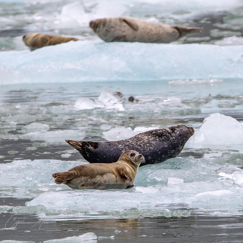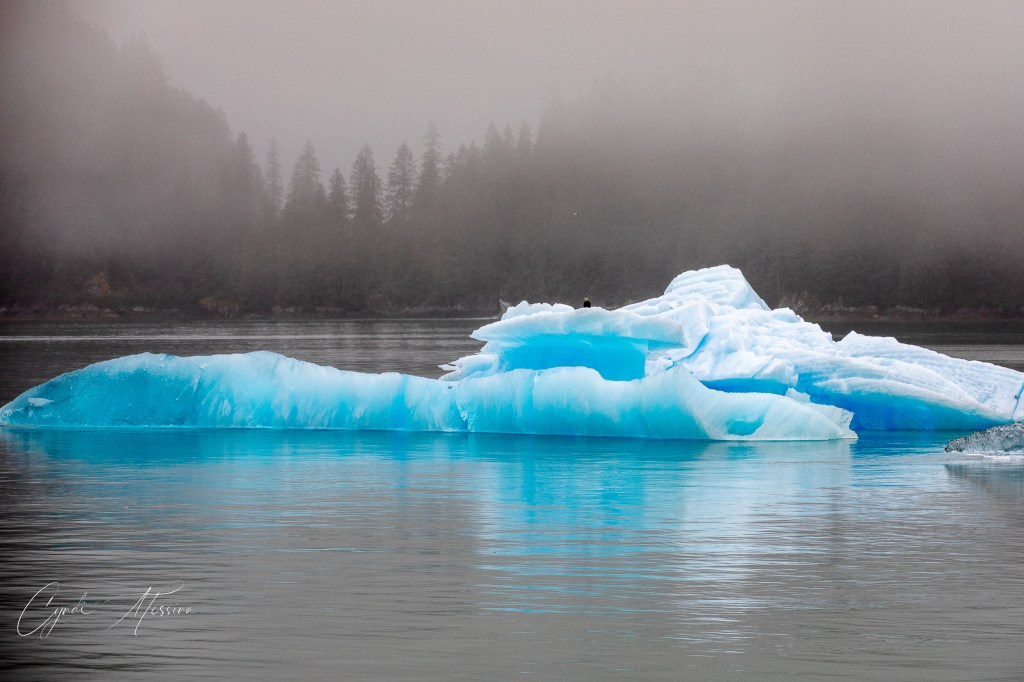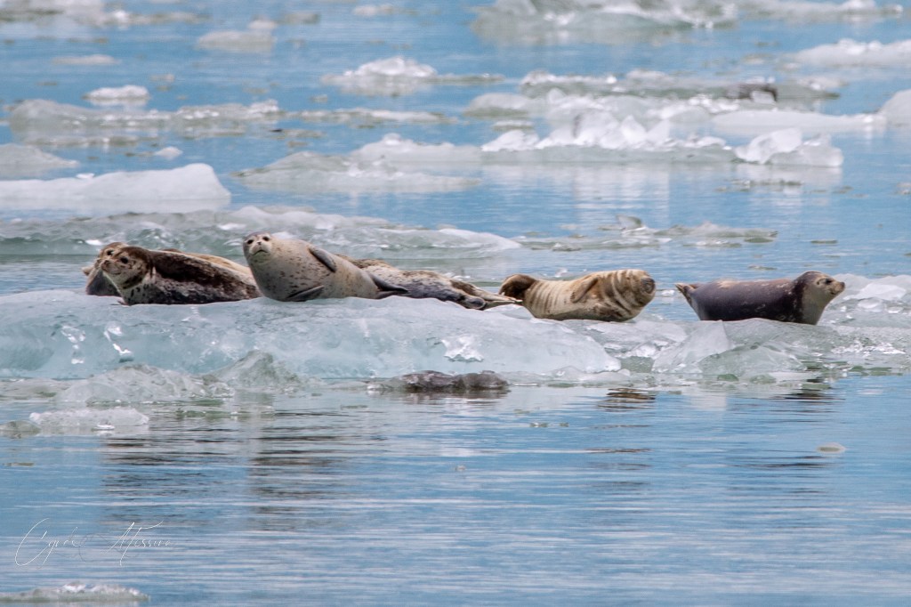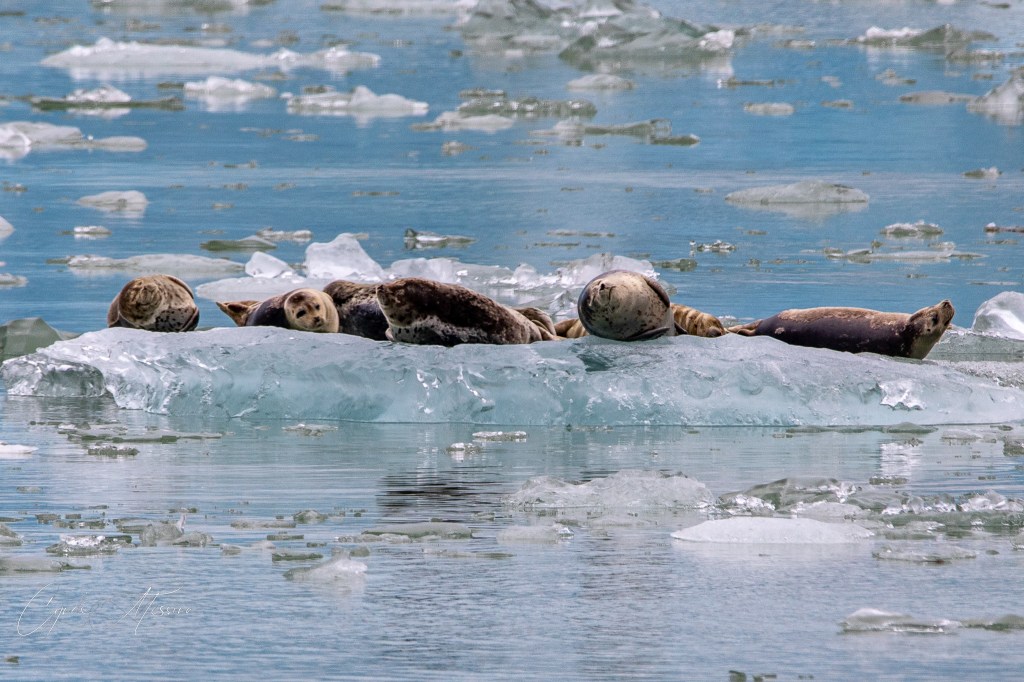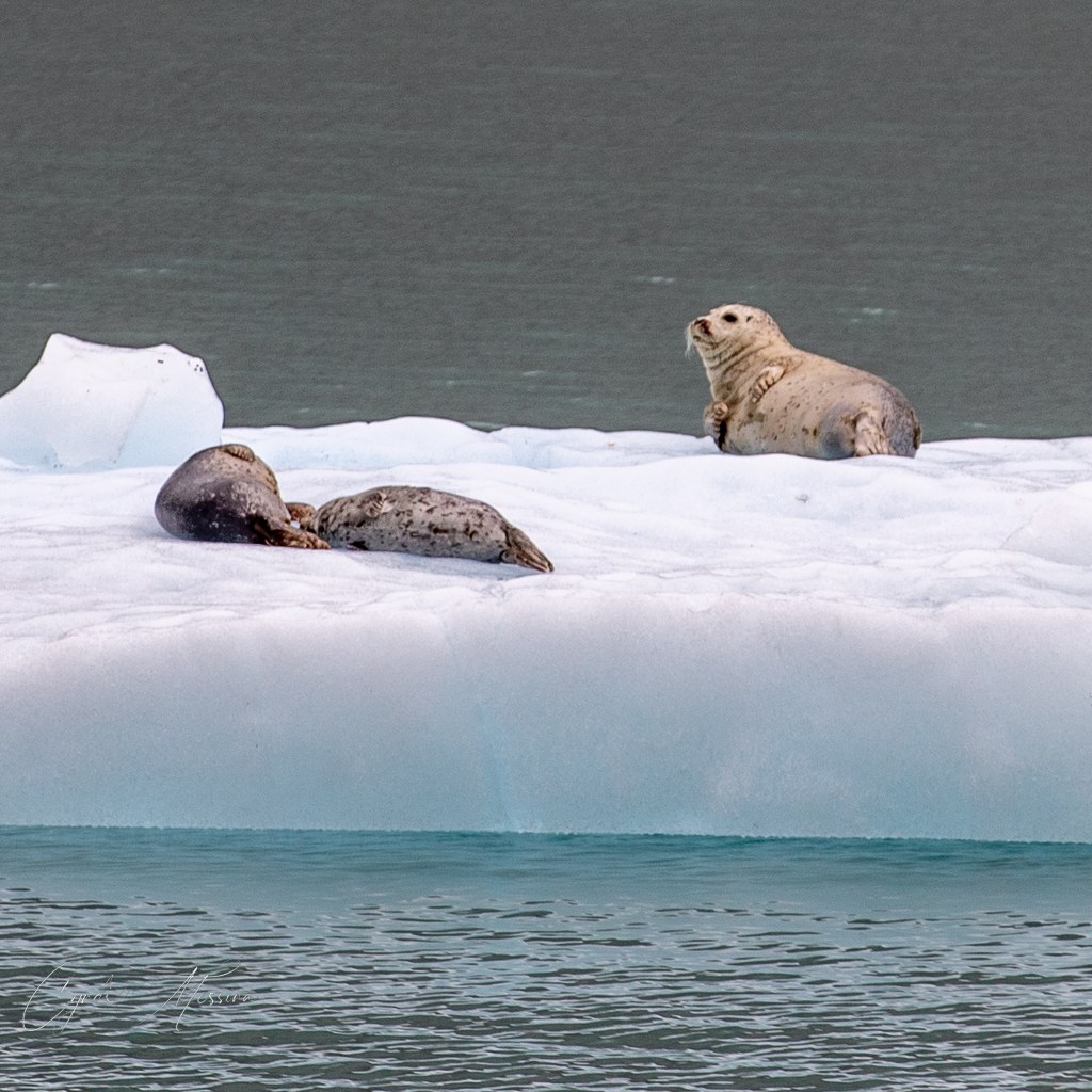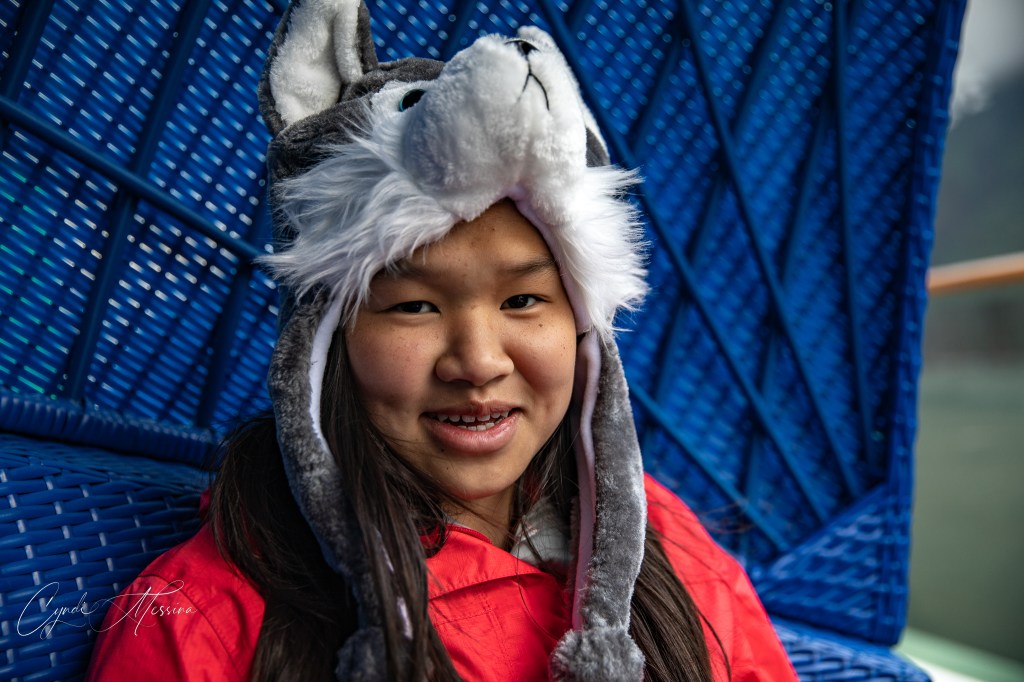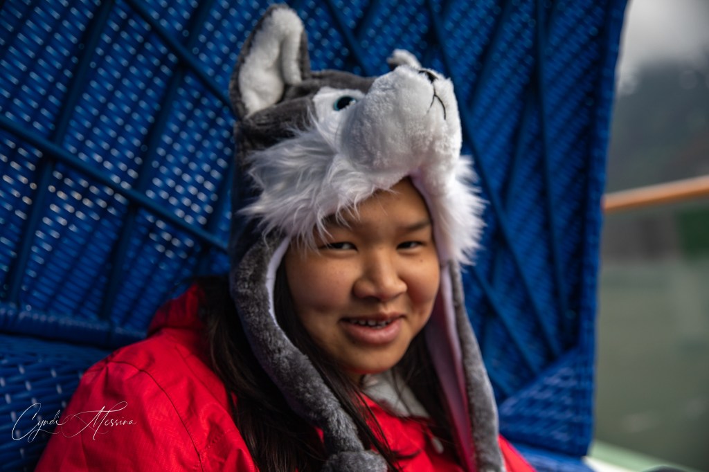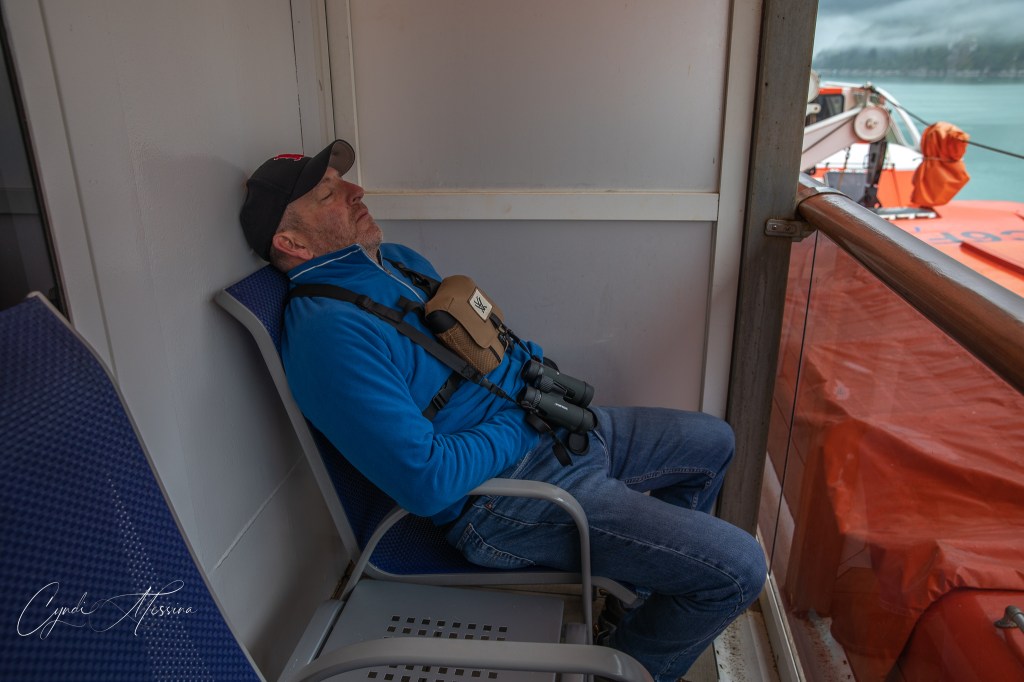 For a few hours we tootled around, traveling to different glaciers in the area and marveling at the bright blue frozen ice everywhere in the mist. We saw a lot of seals and a few bald eagles. Lily couldn’t manage to find a sweatshirt she would like to have because she wanted a plain one…one that didn’t say ALASKA all over it. She did, however, find a hat that she loved to wear. The pictures of Rich sleeping was on our cabin balcony. We were cruising through this beautiful fjord and it was so peaceful. Rich was being my “spotter” in case we saw some wild animals or birds. However, between our early start that morning and the glaciertini (yep a martini made with glacial ice) that was pretty strong on the excursion, he didn’t last long. Considering we didn’t have winter coats, just rain coats layered over our other layers, we stayed relatively warm except for our fingers.