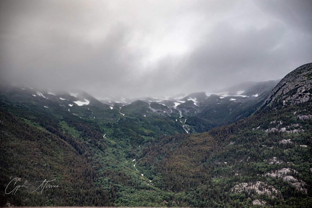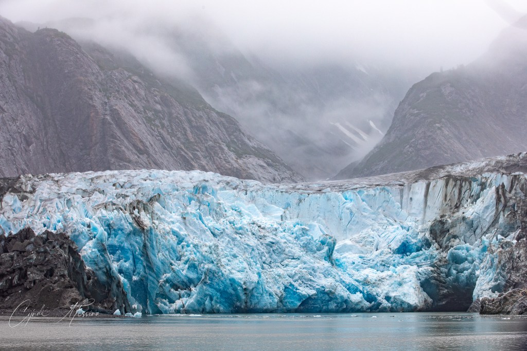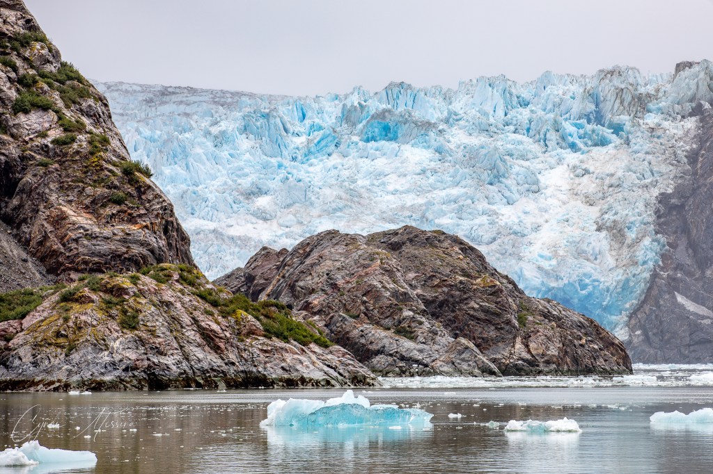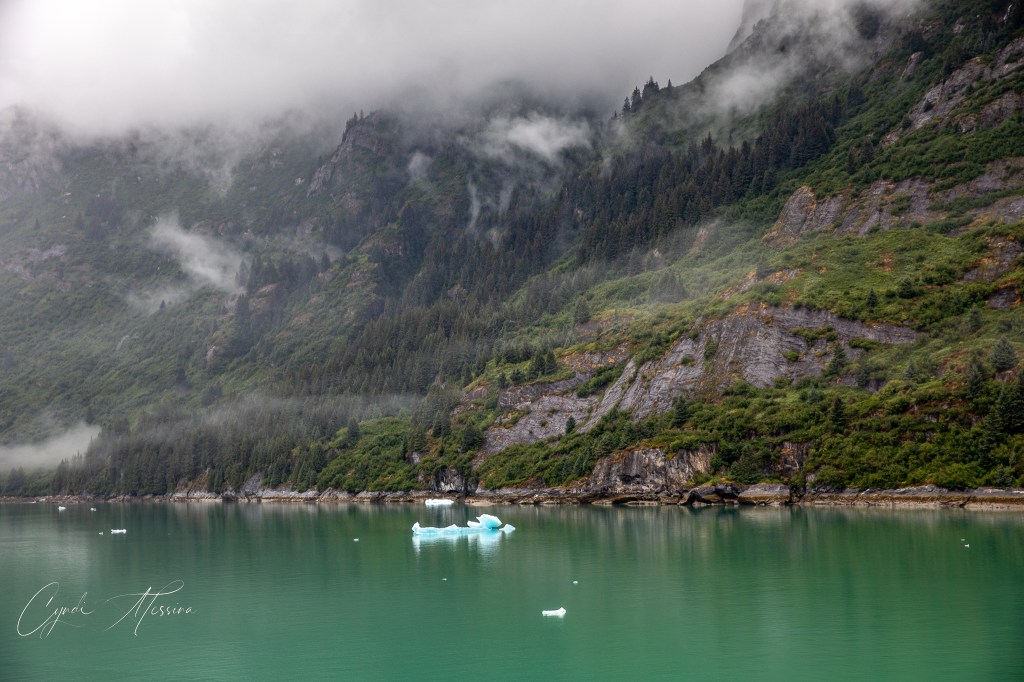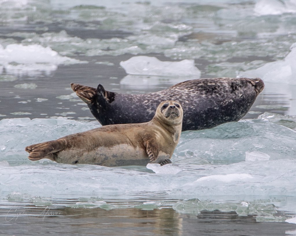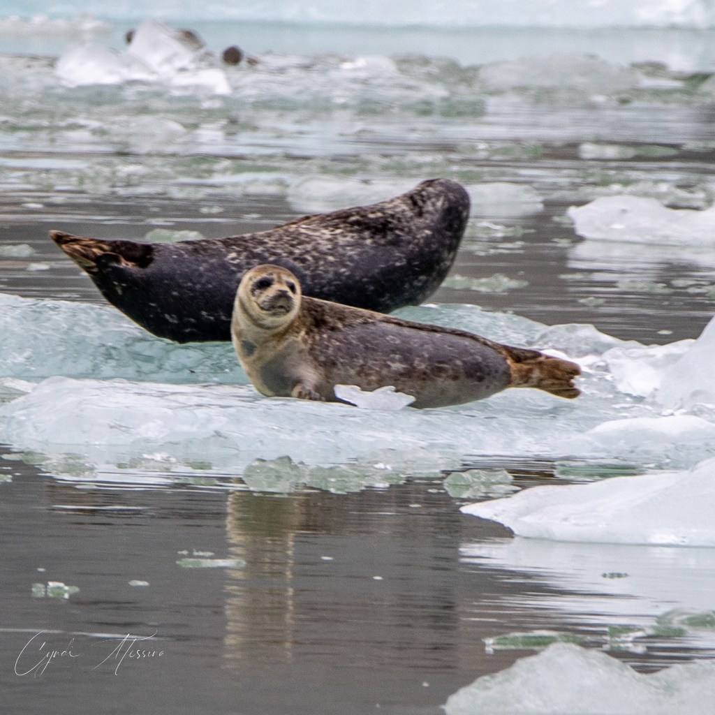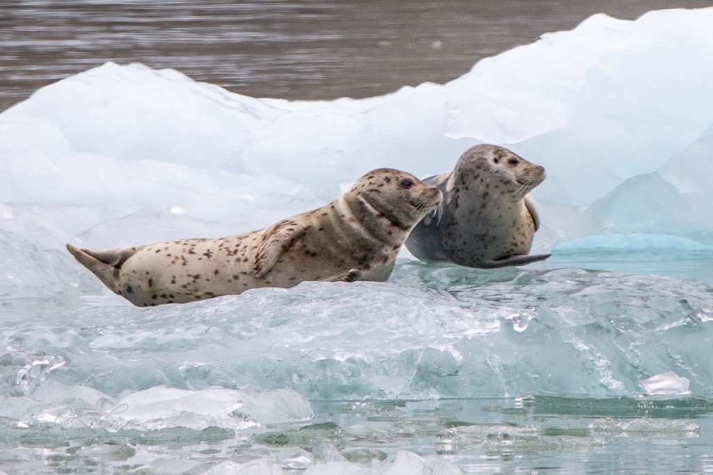 For a few hours we tootled around, traveling to different glaciers in the area and marveling at the bright blue frozen ice everywhere in the mist. We saw a lot of seals and a few bald eagles. Lily couldn’t manage to find a sweatshirt she would like to have because she wanted a plain one…one that didn’t say ALASKA all over it. She did, however, find a hat that she loved to wear. The pictures of Rich sleeping was on our cabin balcony. We were cruising through this beautiful fjord and it was so peaceful. Rich was being my “spotter” in case we saw some wild animals or birds. However, between our early start that morning and the glaciertini (yep a martini made with glacial ice) that was pretty strong on the excursion, he didn’t last long. Considering we didn’t have winter coats, just rain coats layered over our other layers, we stayed relatively warm except for our fingers.