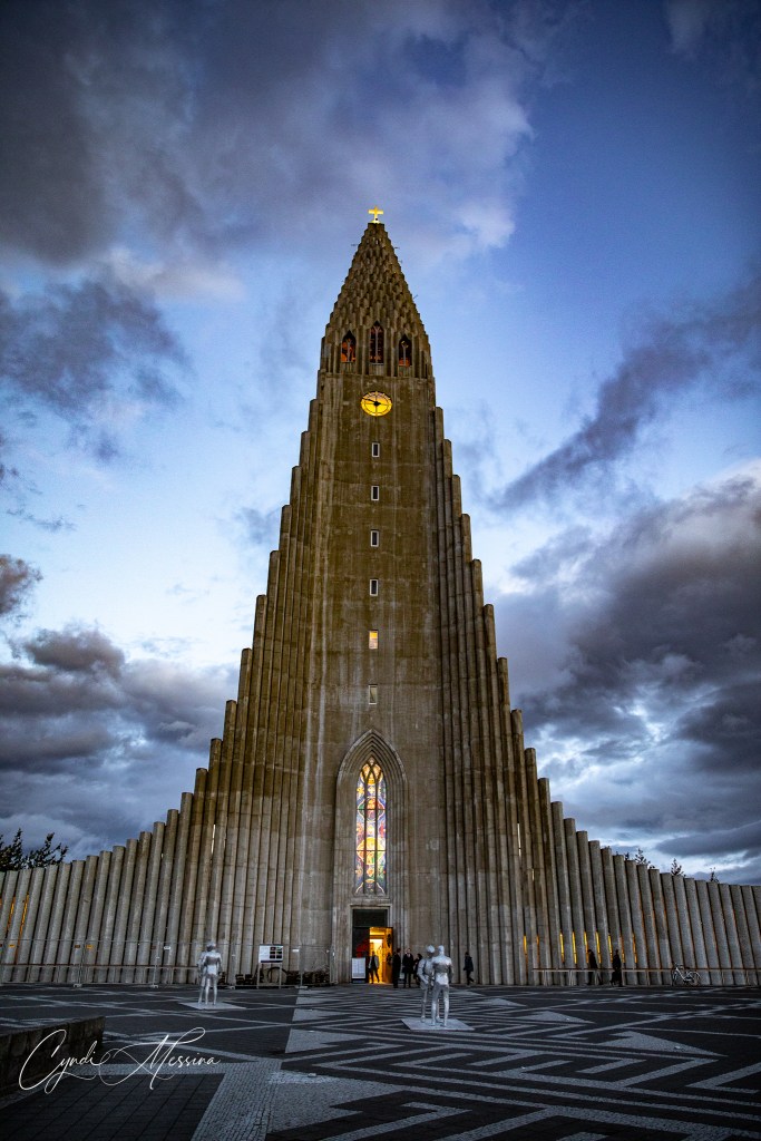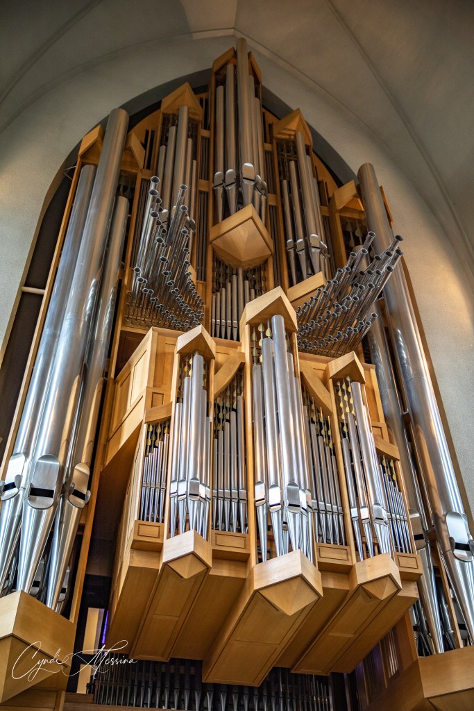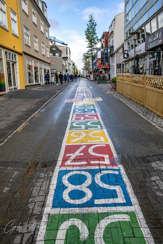 So here are some of the photos of the city. We so enjoyed our time there! There is a huge cathedral called Hallgrimskirkja (the church of Hallgrimur). It is a Lutheran Church and towers at 74 meters tall. It is the tallest church in the country and the 6th tallest structure in Iceland. The architect designed it in the late 1930’s and was inspired by the Icelandic basalt lava columns that are found all over Iceland. The Church was finished in 1986 and has a huge pipe organ that is 15 meters tall and weighs 25 tons! It has over 5000 pipes and easily fills the huge space with music, as when I took refuge from the rain and wind that first day in the church, the organist was practicing. Although a Lutheran church with the stark relief of a Protestant church, it has a traditional Catholic candle lighting area in the back, where I lit a candle for my Joe. I also paid a small amount to ride the elevator to the top and see the giant bell that rings every quarter hour and look out over the city and the coastline. Right in front of the church is a big statue of Leif Eriksson. The sculpture was given to Iceland in the 1930’s from the United States to commemorate the 1000th anniversary of Icelandic Parliament. I actually went a few times to this church to catch it during the daytime and then at sunset…which wasn’t until nearly 10 p.m. when I was there. There are a few shopping areas near the church that has a rainbow road leading to the church and then a giant hopscotch on the pedestrian path that goes on for several city blocks. A lot of the natives who live and work in town ride those electric scooters everywhere..going pretty fast. I was surprised to not be run over by one of these folks.
