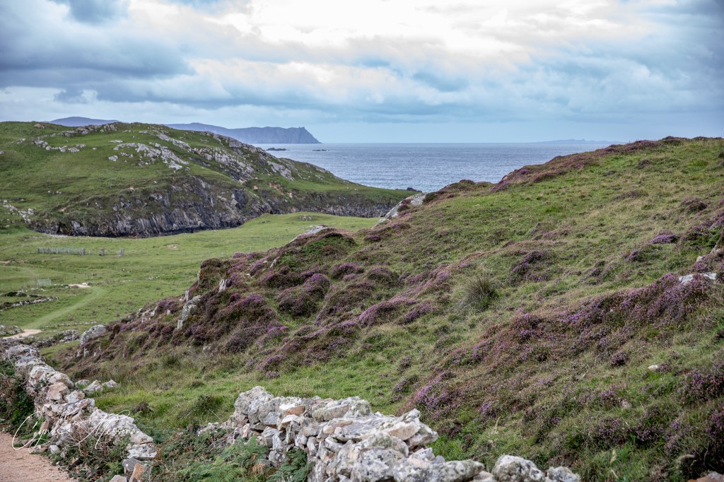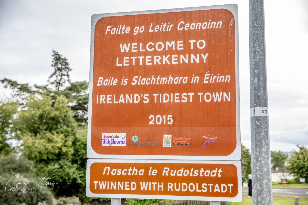 This was a a long day. We saw A LOT. We stayed in a room above a pub in Dungloe in County Donegal in the northwestern part of the Republic of Ireland. We drove to Dunfanaghy and hike up to see the cliffs at Horn Head. It is a peninsula now but used to be an island. There was a lot of heather making the tops of the cliffs appear purple and LOTS of wind. This is part of the Wild Atlantic Way and the roads to get to these far-off places are incredibly narrow. We also trekked to Murder Hole Beach. When I say trekked…well, it included going up a few hundred steps…a few steep sandy hills, crossing a cow pasture with LOTS of cows and sheep in it, and traversing a few sand dunes. The surf was, of course, cold and crashing. We stopped in Letterkenny for lunch at Mr. Chippies, where I had the Irish version of a Cajun chicken sandwich. My Louisiana friends would shudder at trying it. When I think of Cajun, I expect a bit of a kick and some tingling lips afterwards. That is Cajun. This was more like watered down Thousand Island dressing. I was a bit underwhelmed, however, after the sandy climb to and from Murder Hole Beach, I was pretty hungry! I put a picture of the Letterkenny sign because it was something special for my Joe. He loved a show by that name…a slapstick comedy about a Canadian town by that same name. Joe always asked me if I had watched the latest season (it was totally out of my wheelhouse) but he talked about it a lot. When I saw there was a town in Ireland by that name, I wanted to make sure we stopped there and took a photo of the sign. If Joe was alive, I would have done the same thing. It was just a little bittersweet this time.