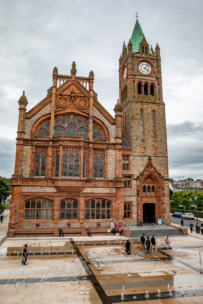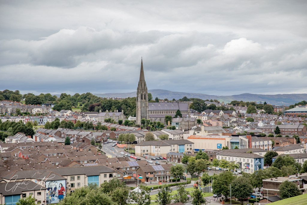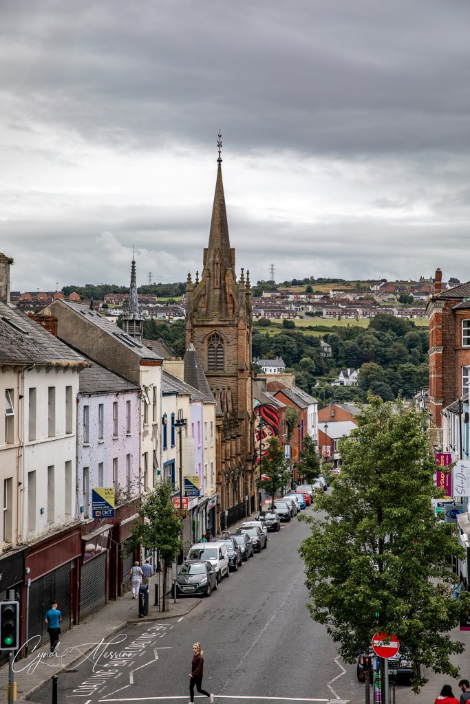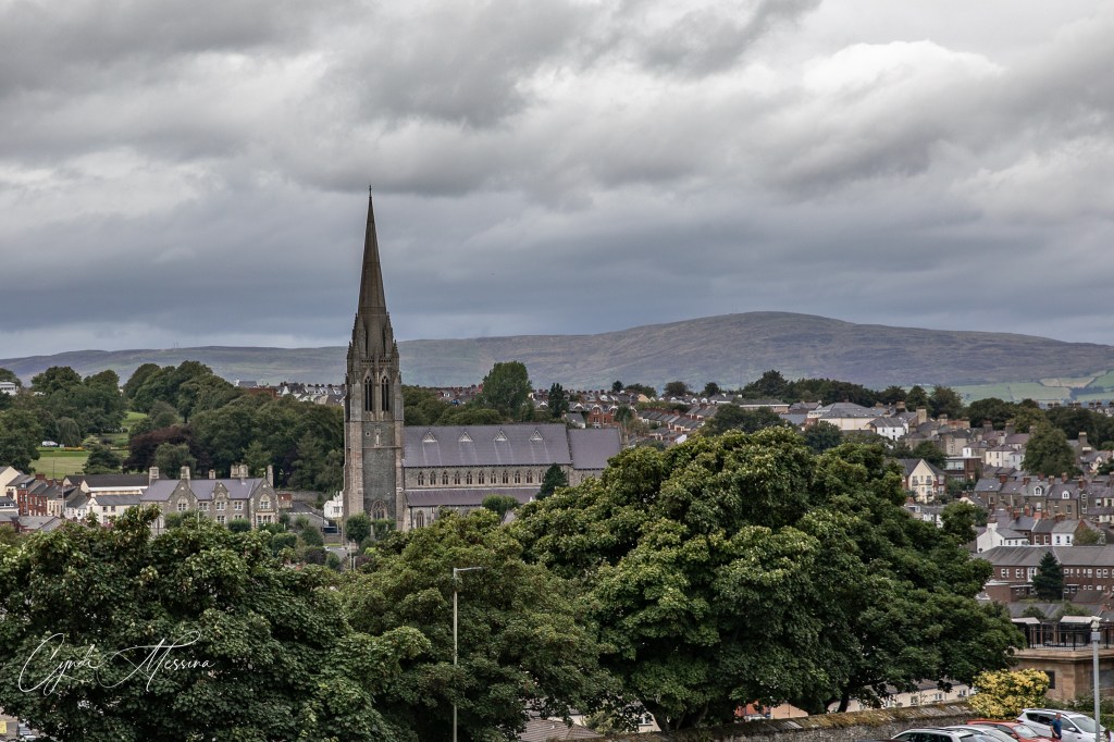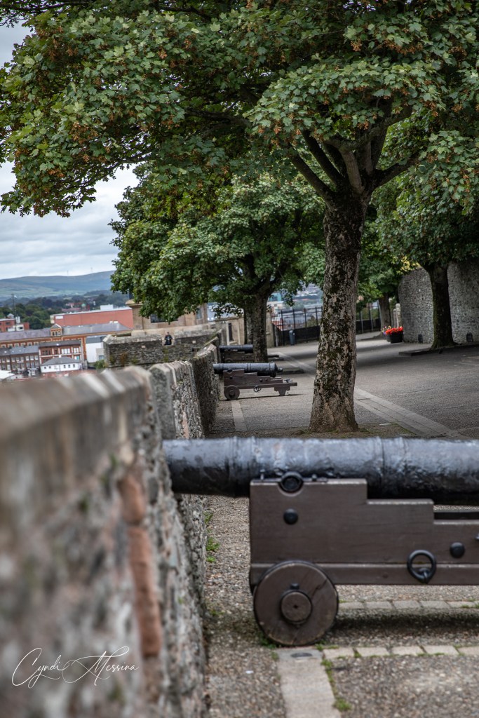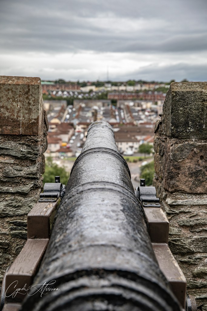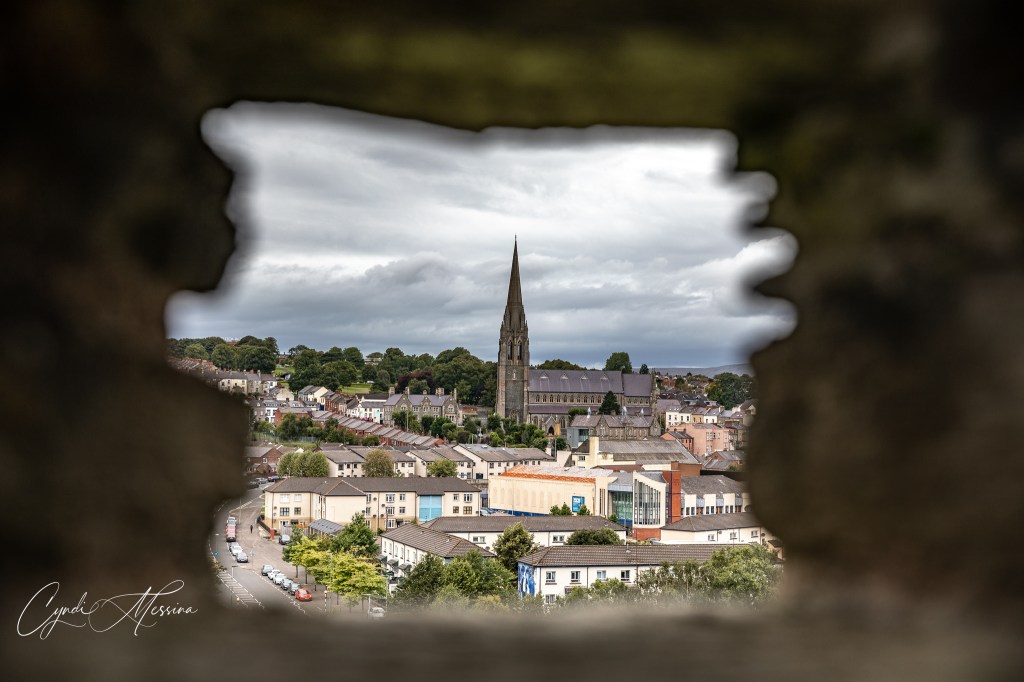 We crossed into Northern Ireland….for those of you who aren’t up on your geography or European history, that is a separate country. The money changes from Euro to pounds and so do the signs…from Irish to English and from km to miles. Northern Ireland is part of the United Kingdom (to include Wales, Scotland, and England). When you think of the “Troubles” – the time from 1969 to 1994 when the Protestants and Catholics were bombing each other and couldn’t live side by side….Northern Ireland is where you are thinking of. Our first stop was in Derry or Londonderry (depends on who you ask as to what they call it). This is an old walled medieval city with canons on the walls. We walked the walls of the city and also toured the old cathedral in town, which they have reverted to the city hall. We crossed the Peace Bridge and took photos of St. Columb’s Cathedral. After spending a lot of time walking in Londonderry, we drove east towards the Giants Causeway. This natural phenomenon is comprised of over 40,000 interlocking basalt columns. There are a lot of myths about how the Giant’s Causeway came into being. The one we heard went something like this: