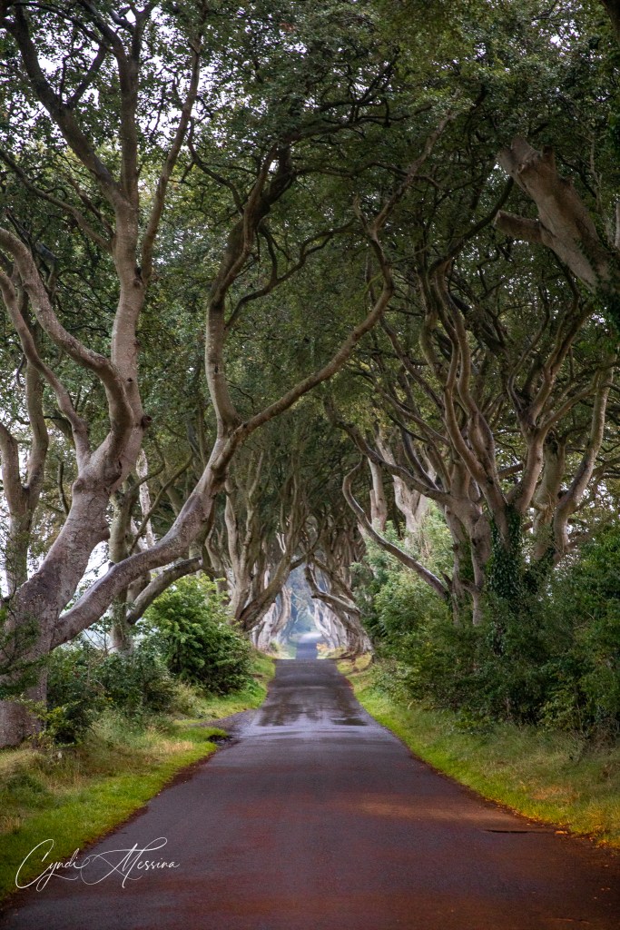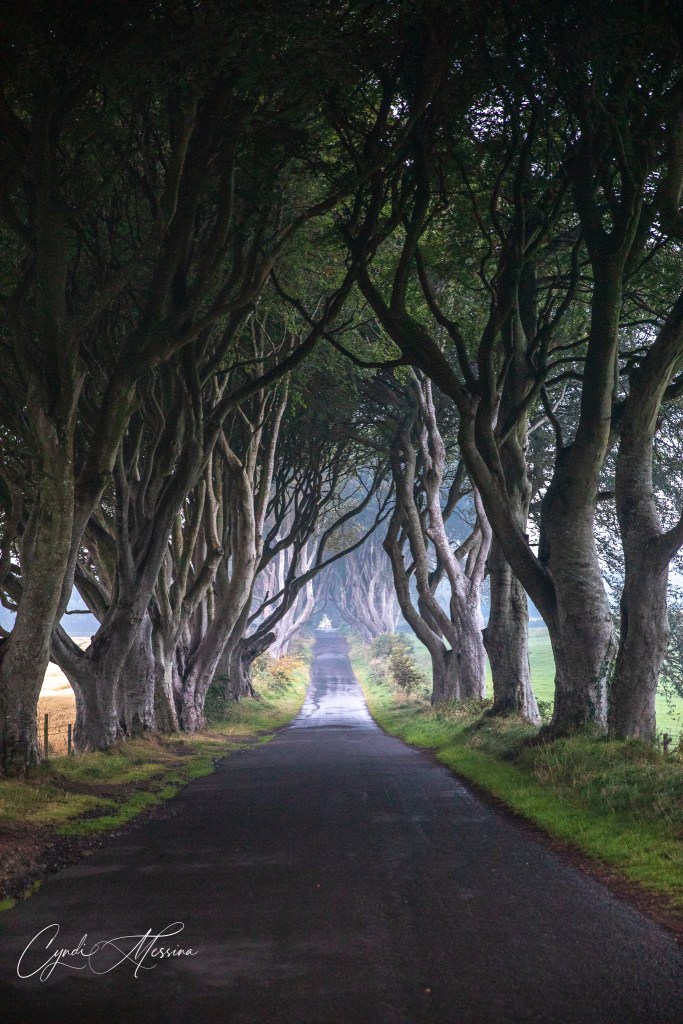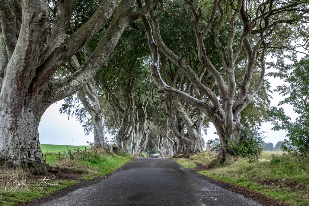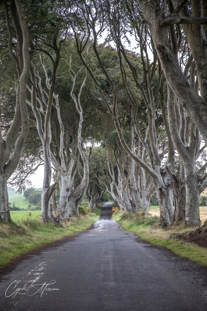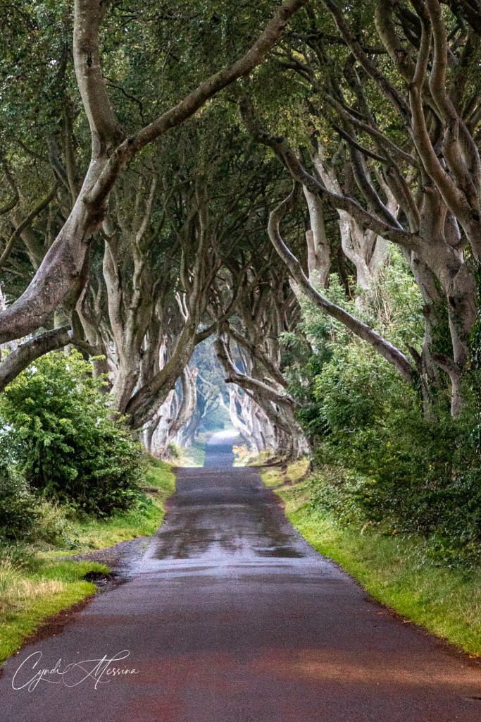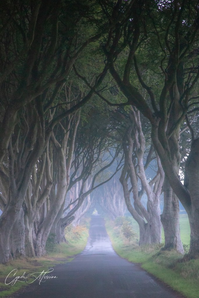 Rich and I agreed that if we hadn’t seen so many of these formations along the coast of Iceland, we would have been in total awe of the Giant’s Causeway. It was spectacular though and we were, of course, in the wind and rain and the sun was just starting to set as we left. However, we made one more stop for me. Ever since I saw a photo of the Dark Hedges online several years ago, I wanted to photograph them. I thought we would have a hard time getting photos in as it is a pretty popular place to go now that Game of Thrones has its stamp on it. However, the weather was rainy and windy. The sun was setting….fog was rolling in. Not many people were there. Photography-wise, it was perfect. If you know me at all, you know I love trees. The more gnarled the better. I loved it!