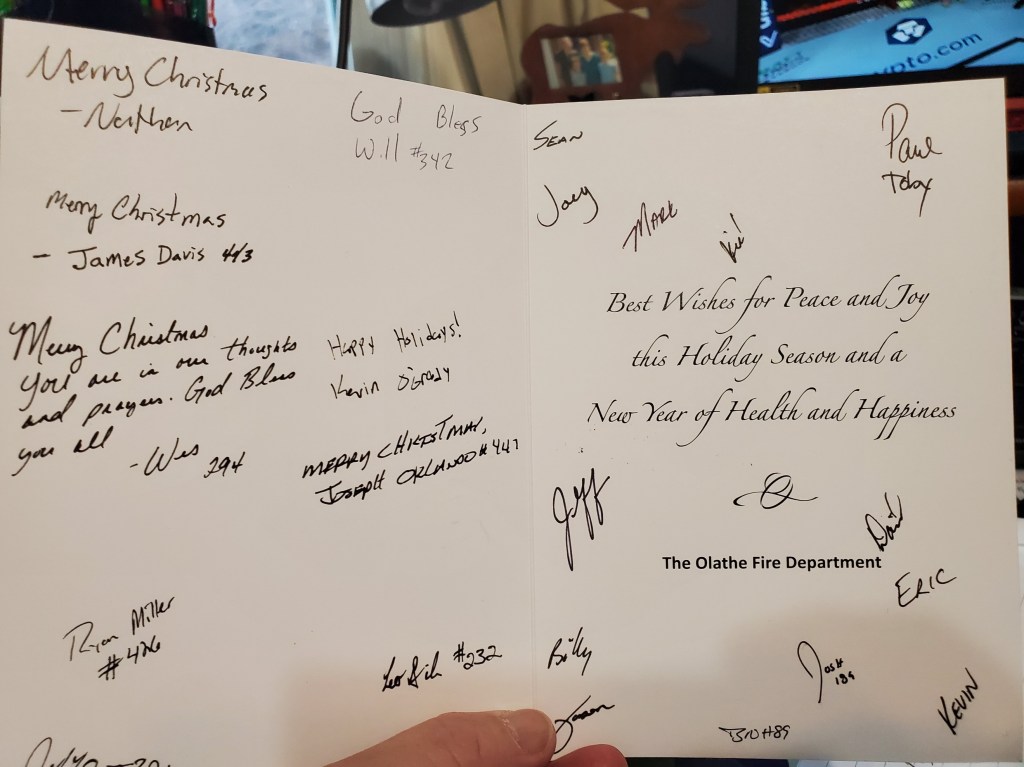 I was in the middle of doing laundry and catching up on bookkeeping from work when the UPS truck dropped off a small package on my doorstep. It was from the Olathe Fire Department. I was blown away by the contents. Love those guys and gals so much. They really step up and do something wonderful when I really need it.