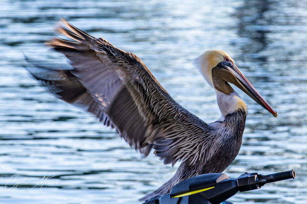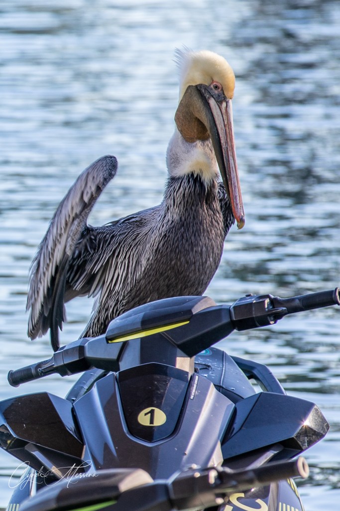 I am playing catch up with photo processing pictures from my good camera. I have been travelling quite a bit so I am just getting some down time to go through some photos. Michelle and I went on a sunset tour on a boat in Clearwater, Florida. It was supposed to be an afternoon dolphin tour, but I had a scheduling snafu and so we ended up on the sunset cruise, which was really spectacular. We did happen to see a few dolphins on our way out to the gulf. Prior to going on the cruise, we took off our shoes and walked in the cool, white sand and dipped our toes in the surf and chatted for awhile. It was a relaxing start to our time in Florida! Something I learned about the brown pelican….which are all over the place in central Florida…..when their heads are stained with yellow, they are in the mating season. Brown pelicans are some of the smallest of the pelican family – and they aren’t that small. The heads are yellow on these brown pelicans…so they are in mating season!
