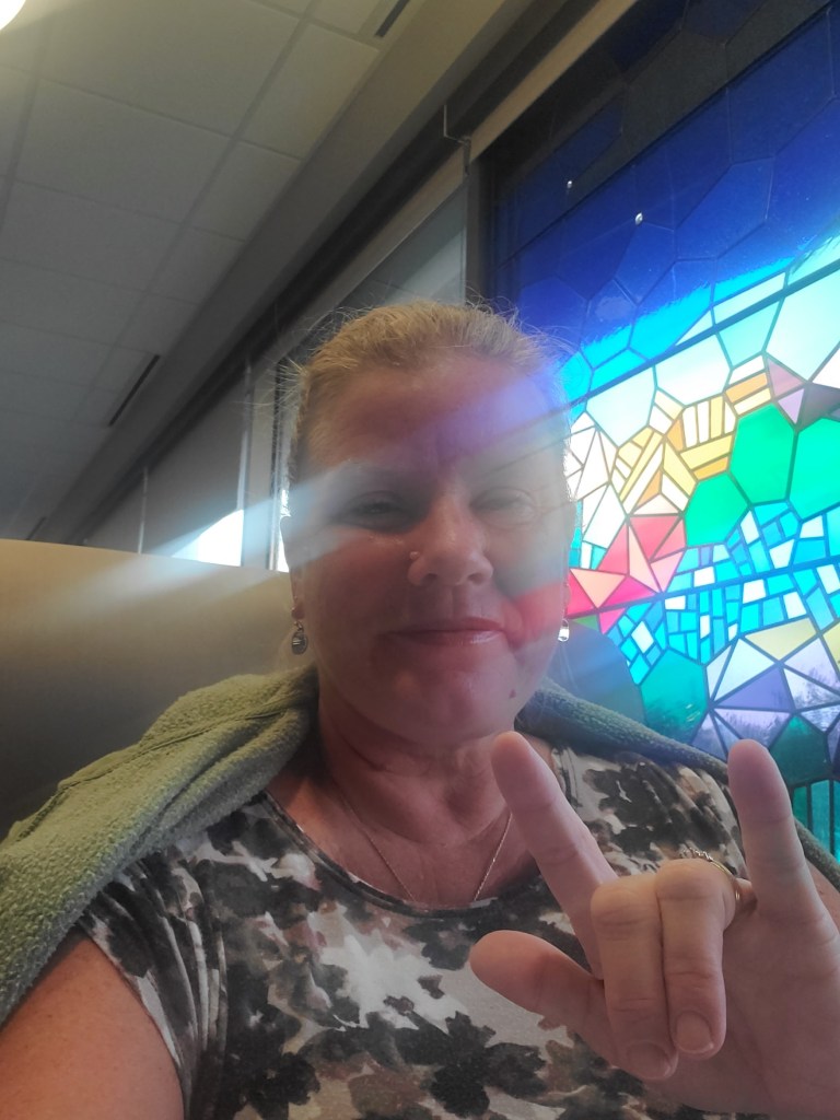 While we were getting ready for Lily’s graduation, a lot of my hospital stuff come due. I had my four month CT scans of my chest, abdomen, and pelvis a couple of days before graduation. For the first time EVER…they couldn’t get an IV started on me. I was poked 3 times, which is really rare for me. I think I had the beginner crew that day. I had not been feeling well and I wasn’t sure if it was grief, stress, or possibly the cancer starting to grow that was causing this icky feeling. I had a zoom call the next day with my local oncologist (Dr. I-can’t-wait-until-you-are-in-my-rearview-mirror). He was prattling on about all sorts of things and I finally interrupted him and asked him about my results. He had forgotten why we were having this zoom call, evidently. He said all was stable. Good news. I wanted to hear what my sarcoma specialist at the Mayo clinic had to say though. So we went through the graduation weekend. A few days after graduation, I had my big treatment. I had bloodwork done, a lupron shot (which I get every month) and then a zometa infusion via IV. The whole process takes a couple of hours even though on paper it looks like it would only take about an hour tops. You have to wait for labs…wait for the oncology pharmacist to mix your drugs…the zometa has to be infused over 35 minutes….you get the picture. The oncologist’s receptionist gave me a big hug. (I had been around longer than she had!) While I was in the infusion center, another worker from the clinic who handles scheduling and insurance for me…someone I really like, came up and found me to give me a hug goodbye. I have had two fabulous nurses who have cared for me the majority of my visits to the infusion center at Bergan Mercy. They have laughed with me, commiserated COVID restrictions with me, talked about raising kids with me….cried with me when Joe died, and rejoiced with me when I found a place in Montana to move to and live. Becky and Nora….they are the best. I would like to think that I am special, but they treat all their patients with that kind of love and attention and for that, I am forever grateful. I remember when I was starting a new chemo drug and it was during COVID and Rich could not be there with me. I had no idea what was going to happen as they pumped that poison into my port…which went right to my heart to pump it out systemically quickly. If I had an allergic reaction, it would get real bad, real quick. As a former nurse, I knew that. I was scared to death about it and they understood that. I have not made it a real secret that I was not fond of my local oncologist, who has the bedside manner of a hemorrhoid. However, what kept me leaving from leaving this hospital system was these 4 women…especially Becky and Nora. Anyhow, there were tears, numbers were exchanged…and I am sure the other patients were trying to figure out what in the world was going on with me. Typically you are ringing the bell because you are done and beat your cancer or you are going to hospice. I wasn’t doing either. I put a photo of me during my last treatment at Bergan Mercy. Many of you know I always take the same photo during each treatment….whether they are weekly or monthly, or every 3 months. I used to tell you all about the fact that the cancer infusion center overlooks the two largest civilian cemeteries in Omaha. Kind of depressing. They recently replaced alternating windows with stained glass windows. It is a big improvement!
