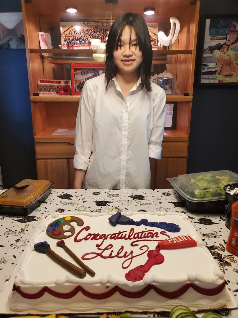 The large painting of the girl in the mask is her best friend, Sam. They are both going to Kansas City Art Institute this fall and will be roommates. Lily took that large painting and gave it to Sam’s mom on their graduation day.