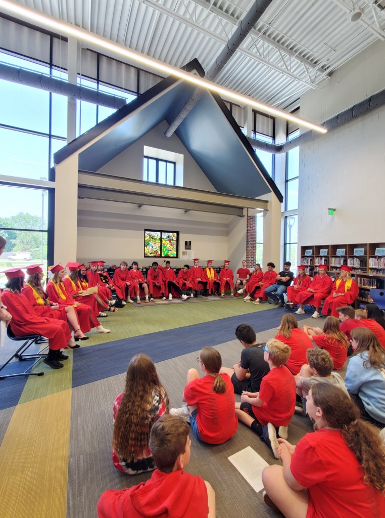 The next elementary school graduation visit was in our current neighborhood at Oakdale Elementary School. Lily went to 5th grade in that building (which was very old). For her 6th grade year, she attended Oakdale Elementary School but it was displaced to a different building a mile or two away while they demolished the old building and rebuilt it. So she went to school with those same kids for two years, but was only in the building for one of those years. It was funny watching all her graduating classmates come to their “old” school to find a new building that they couldn’t even find the front door! Evidently in years past, there have only been three or four graduating seniors that come to do this elementary school walk through. This year, almost all of them came. The principal and teachers were so surprised! They did things a little differently here. They met with the 6th grade class for 45 minutes and got asked questions about middle school and high school. I found it very interesting to hear their answers. Most were really well thought out and oddly mature. They recommended that these 6th graders put down their phones and actually talk to people. They recommended that you do your homework and do it early. They told them to ask for help from their teachers when they didn’t understand a concept. It was oddly refreshing. Anyhow, I think they were only missing about 5 graduating students from their group. After the meeting with the 6th graders, they paraded around the school, getting and giving high fives to all the students. It was funny to watch because the principal had to lead the graduates around because they had never been in the new building before and had no idea where anything was. This man became their principal the year they were in the swing school and the new building was being built.