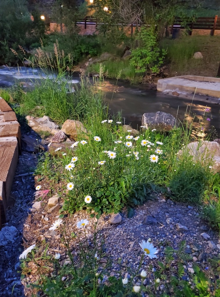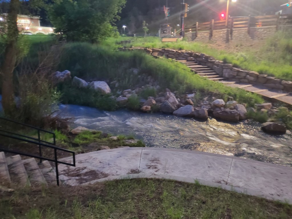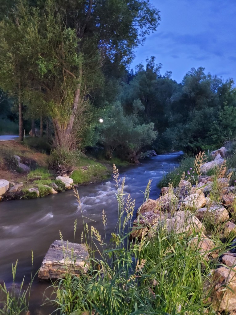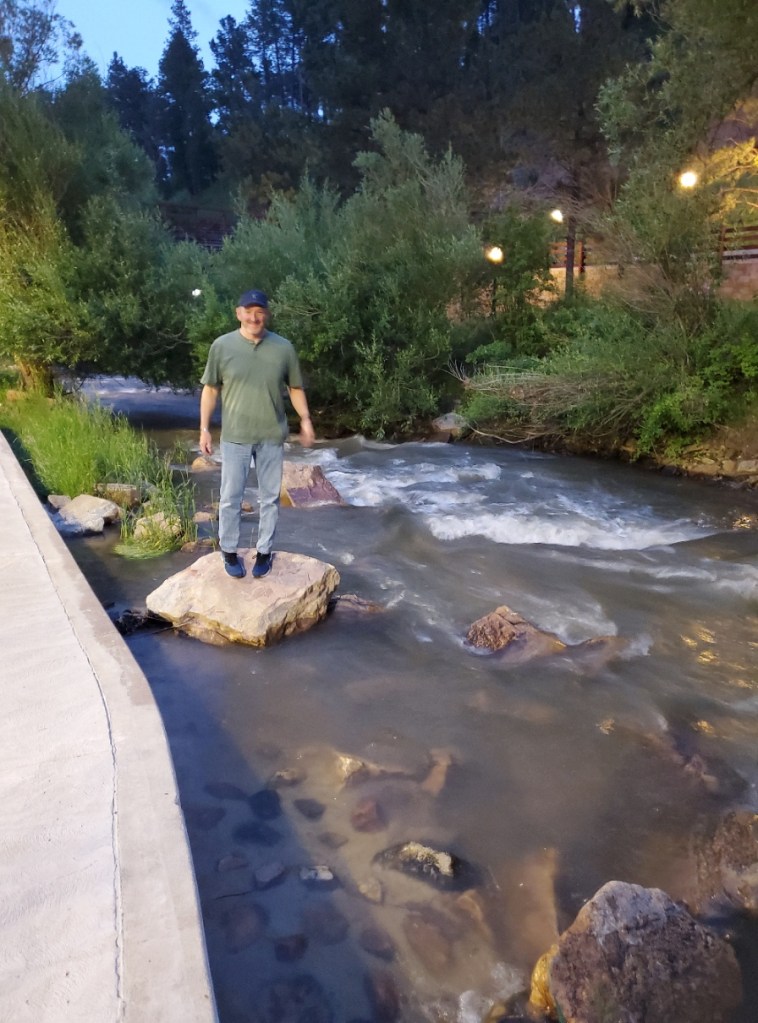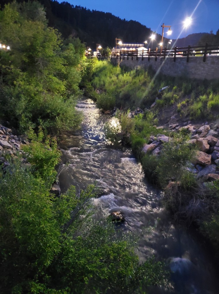 We stopped in Deadwood, South Dakota the first night. We actually made pretty good time because we had left at 0600 that morning. After 12 hours in the truck, we wanted to walk around a bit in the gathering dusk. Here are a few photos from that. There is never a stream where my husband doesn’t attempt to try and fall in.
