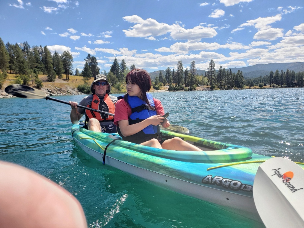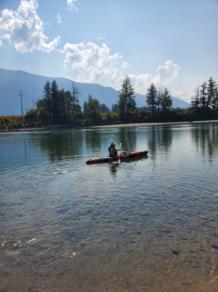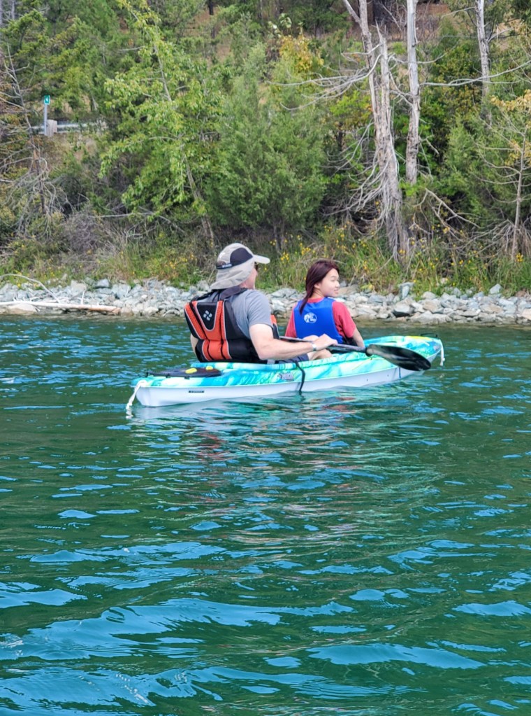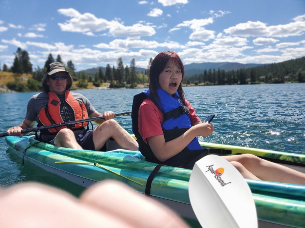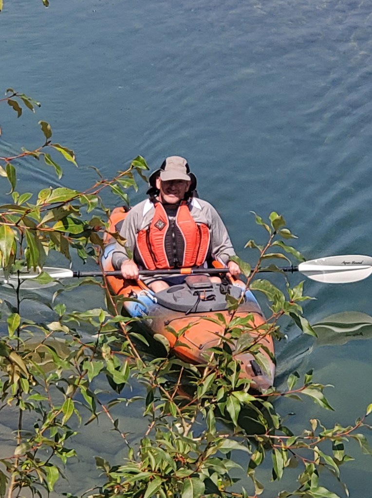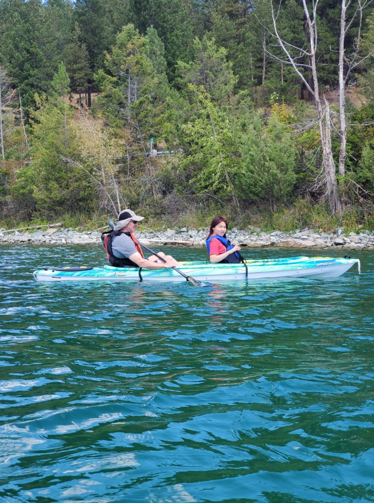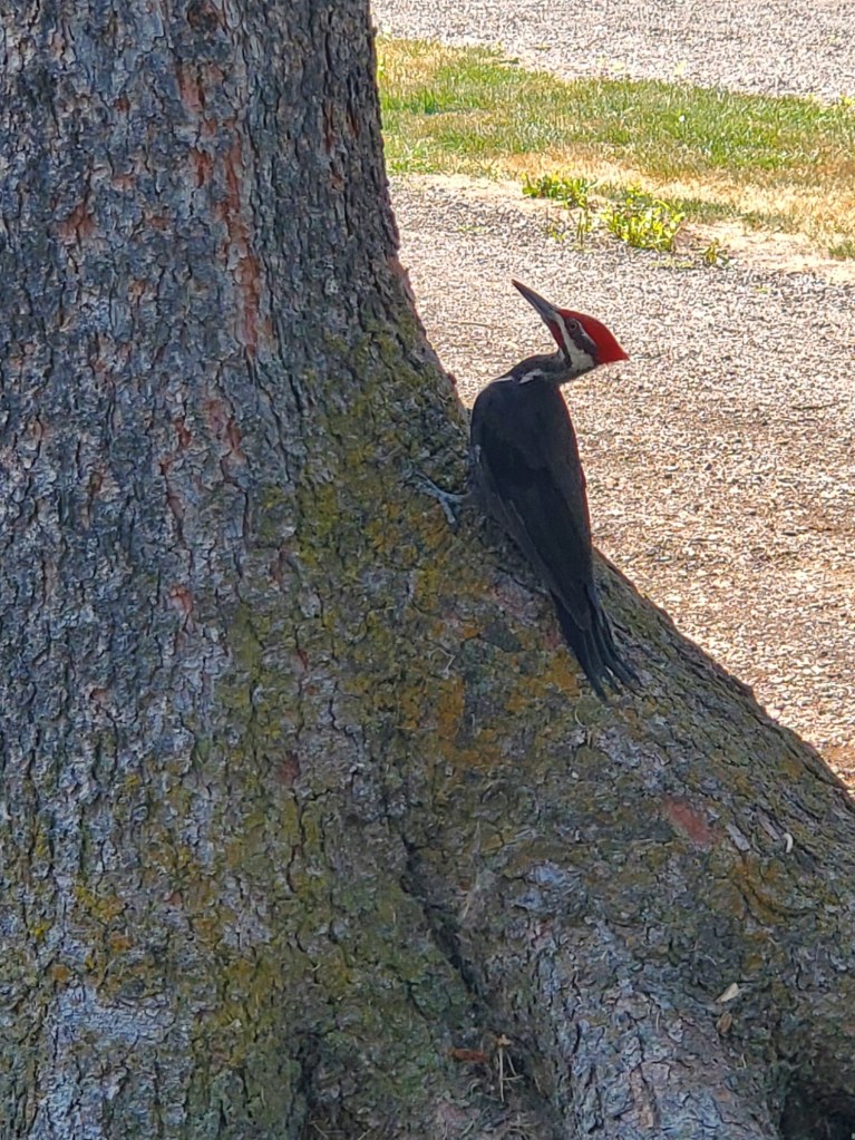 We have purchased a few kayaks since we arrived here. We have a single, where I drop Rich off on a river somewhere and pick him up somewhere else. We also have a tandem, where Rich and I take it out to the lake to paddle around. We took Lily out during the brief time she was here this summer. She and Rich rode together in the tandem and I rode in the single. To quote Rich, “This was a learning experience. Two things we learned: Cyndi paddles stronger on her left side and Lily needs her own paddle!” There is also huge woodpecker we saw when kayaking.