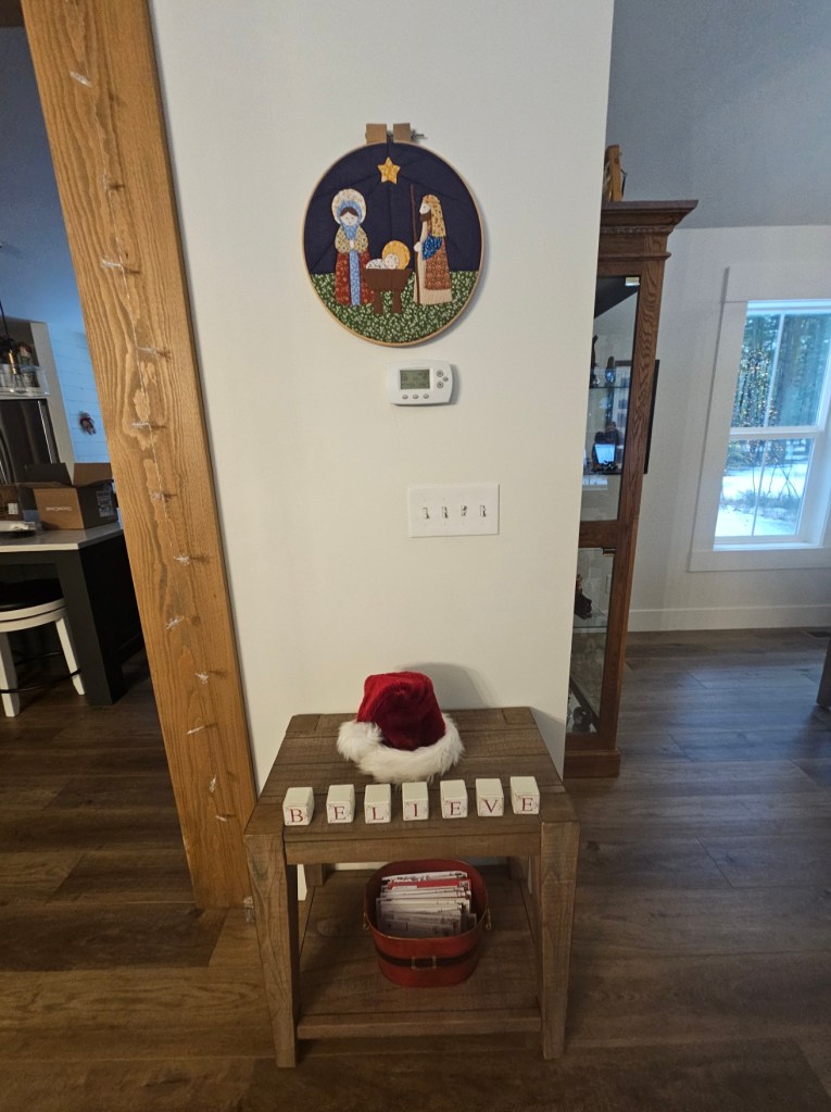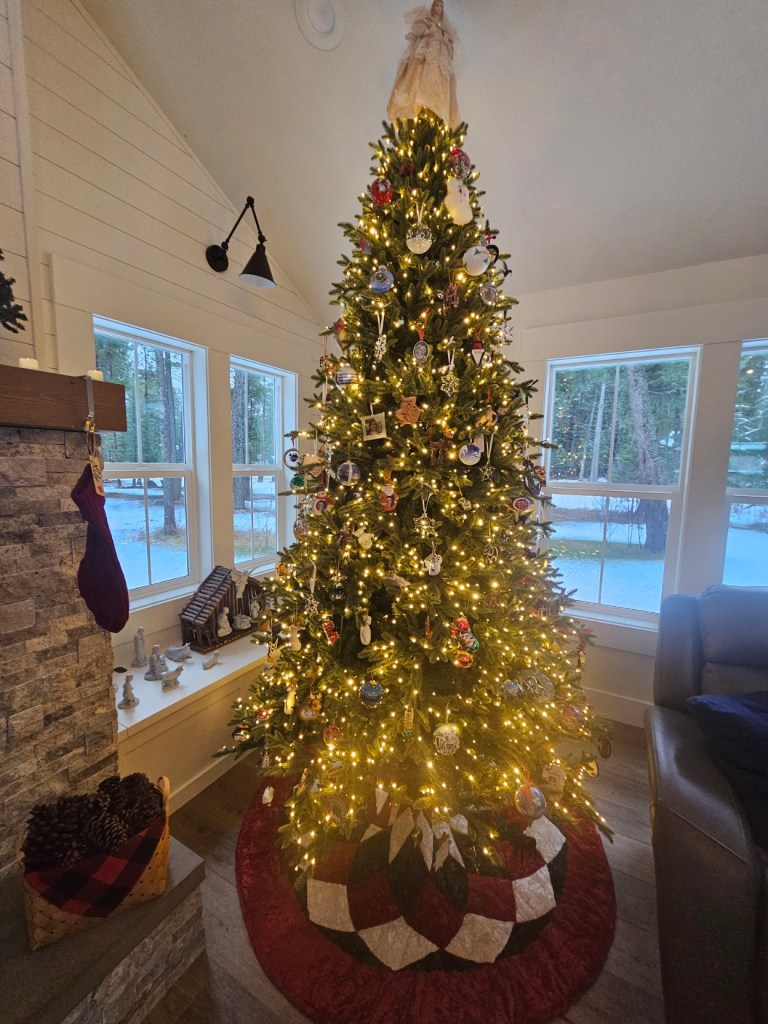 As the year comes to a close, I wanted to share the comfort of my home at Christmas with you. I am not one to leave up decorations for very long and these are now all packed up and put away for Advent 2026. It was a small and quiet Christmas for our family. Lily was the only one home. We didn’t have an open house this year – just a few friends over for dinner. It was a harder Christmas for me this year. I was really missing my Joe and his wife, Michelle. Whenever they would come to our house for Christmas, they would bring their two large dogs with them. It was always a three-ringed circus but it was MY three-ringed circus and I loved making big meals and baking and making candies for everyone to munch on while we played card and board games. Watching the boys get upset because their little sister beat them at Settlers of Catan was fun to watch. The Celtics would be on TV and the noise level was a dull roar. Each year since Joe’s death has become quieter. This year was the first year we didn’t have Tim with us. We have had weird weather here in Montana and there was no snow on the ground. We had a crazy call on Christmas Eve, and a couple on Christmas Day. There was no green bean casserole (Tim’s favorite)….no special mashed potatoes (Joe’s favorite)…no prime rib (a waste for three of us). It was just quiet, and I realize that is probably our new norm. However, I LOVE the way our house feels and looks like during Christmas. I feel like this house was made for the Christmas season. I wanted to share what it looked like.