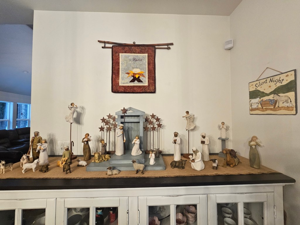 The Willow Tree Nativity with a quilted banner made by my mom and a Silent Night painting given to me by my Grandma Neitzke when I was first married.