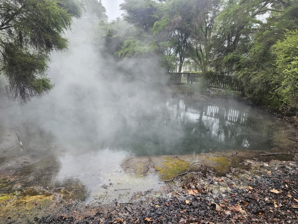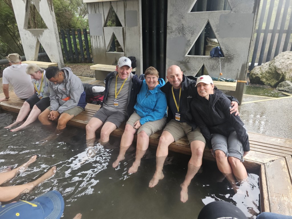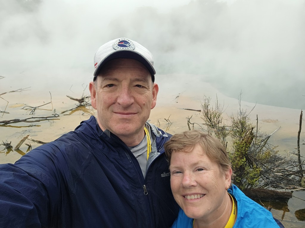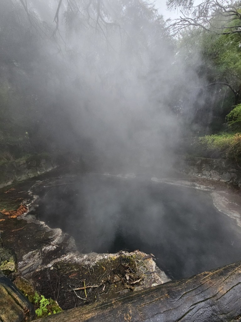 Our first stop of the day was at Kuirau Park. This area of Rotorua is where there is a lot of geothermal activity – lots of boiling mud pits and steaming lakes. There is a public park where you can walk around on a board walk amongst the steam and even a place for you to sit down and put your feet and calves into the warm water. I sat pretty close to an inlet pipe which was allowing the natural hot water into the foot pool. I am pretty sensitive on my hands and feet due to chemotherapy in the past. It was pretty hot for me! Rich traded spots with me and it was much better. He felt it was pretty hot too. We sat for about 10-15 minutes and I was amazed at how good my feet and lower legs felt the rest of the day. We then also stopped at another geothermal park called Sulphur Point on the edge of Lake Rotorua. Rotorua is known for its sulphur smell. Tauranga is the port we docked in and Rotorua is the nearby city. Lake Rotorua is a caldera filled with water. The volcano erupted 250,000 years ago. There are 10 lakes in this area caused by volcanoes. There are currently only 2 active volcanoes in all of New Zealand. The last eruption was on White Island in 2019 and 21 people were killed. There are lots of earthquakes in New Zealand. The South Island, especially, has some major fault lines running through it. There are an average of 14-15,000 earthquakes per year in New Zealand. Most are not even noticed. During COVID, New Zealand had one of the lowest mortality rates in the world. They closed their borders for a year. This was horrible on their economy because they deal mostly in tourism.