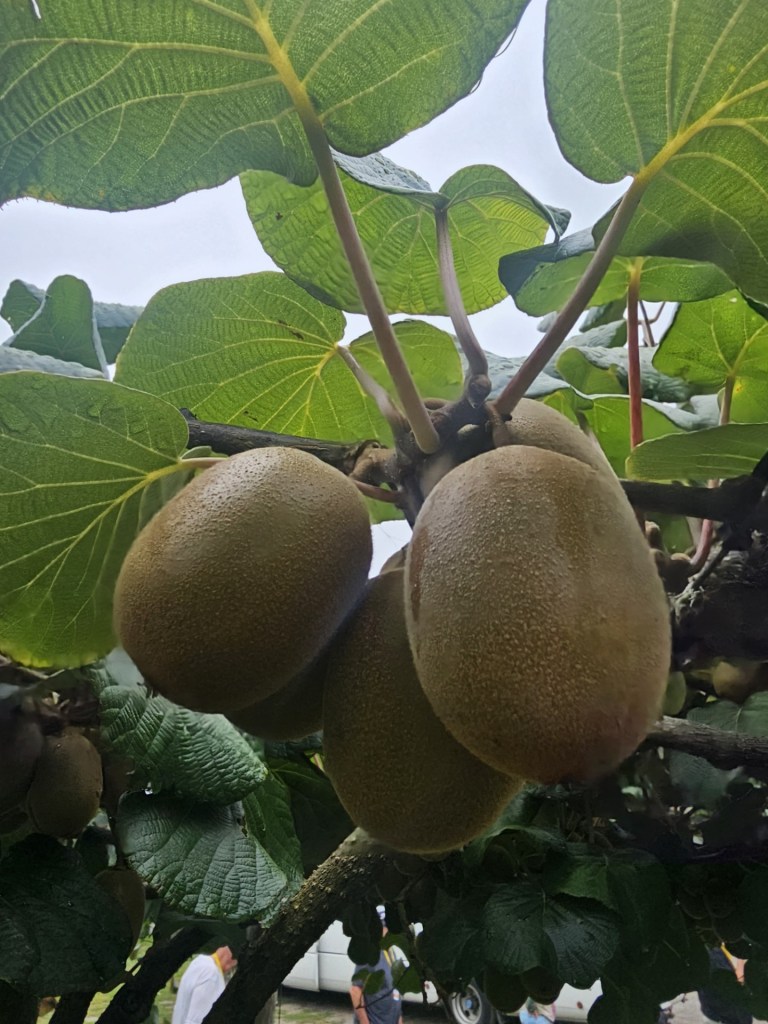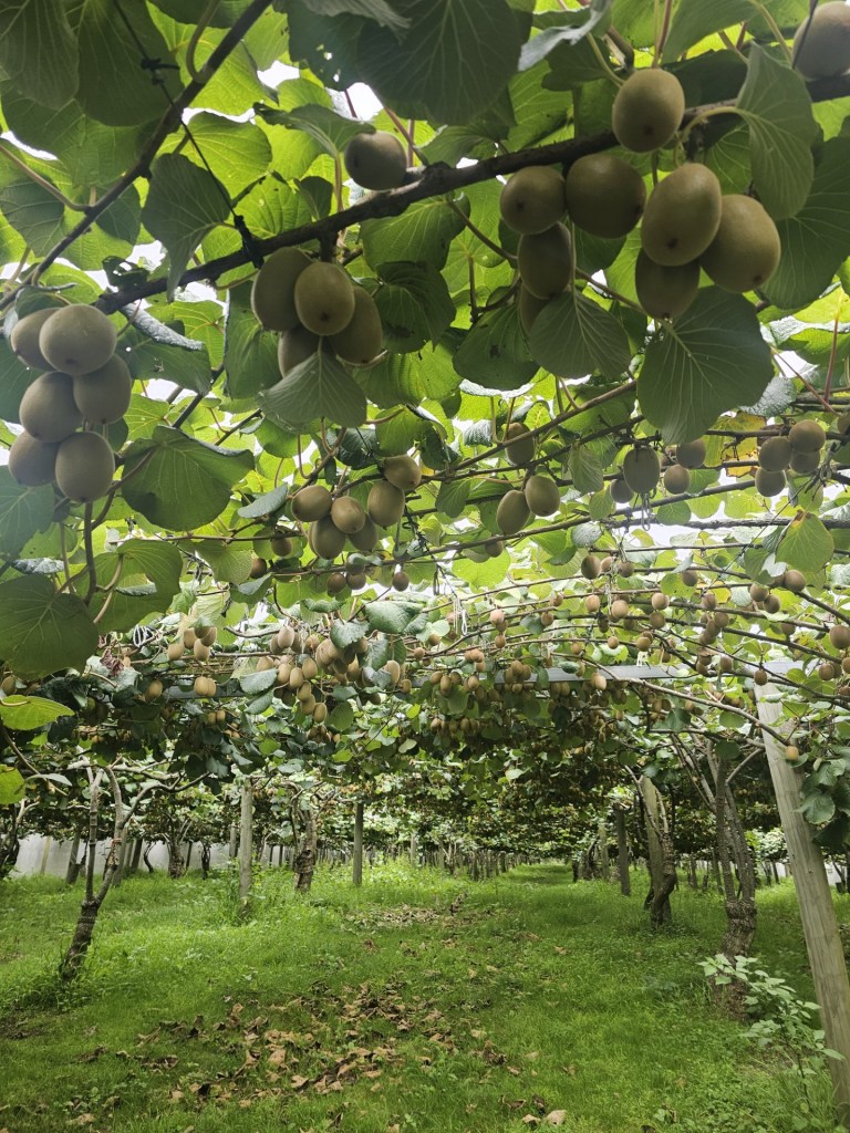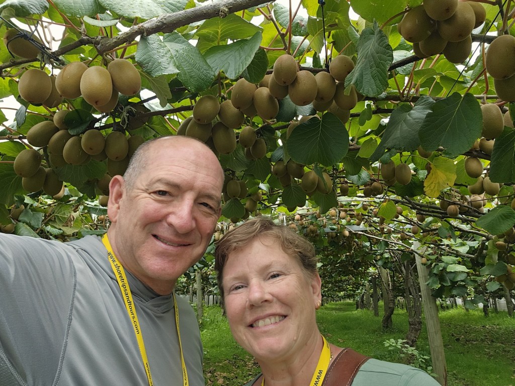 We happened to be traveling through the world capitol of Kiwi Fruit – the town of Te Puke and the area around it. The region produces 85% of New Zealand’s kiwi fruit crop. There were huge hedges about 12 feet tall in large squares. They are windbreaks for the kiwi plants. I always thought they grew on a tree…they do not! they grow on a vine. It was fascinating learning about the whole process. Kiwis were brought to New Zealand from China via Shanghai. The Chinese called them gooseberries. There are over 60 varieties of kiwis but they fall into general catagories such as red, gold, and green kiwis. The red ones will rarely be seen in the U.S. because they rot very quickly and therefore are kept locally. The only time the kiwi fruit is ever touched by human hands is when they are being picked. The gold kiwis are harvested in Mar and April. The green kiwis are harvested in May and June. A quick kiwi secret (both Kiwi people and kiwi fruit). If you want to tenderize a steak, slice kiwi fruit and place it all over the piece of meat. Put in the refrigerator for 1-2 hours. Will tenderize cheaper pieces of steak. There is some enzyme in the kiwi fruit that will do that. If you want to ripen a kiwi, place it in a paper bag with a banana and it will ripen in 2-3 days. They should not be hard.