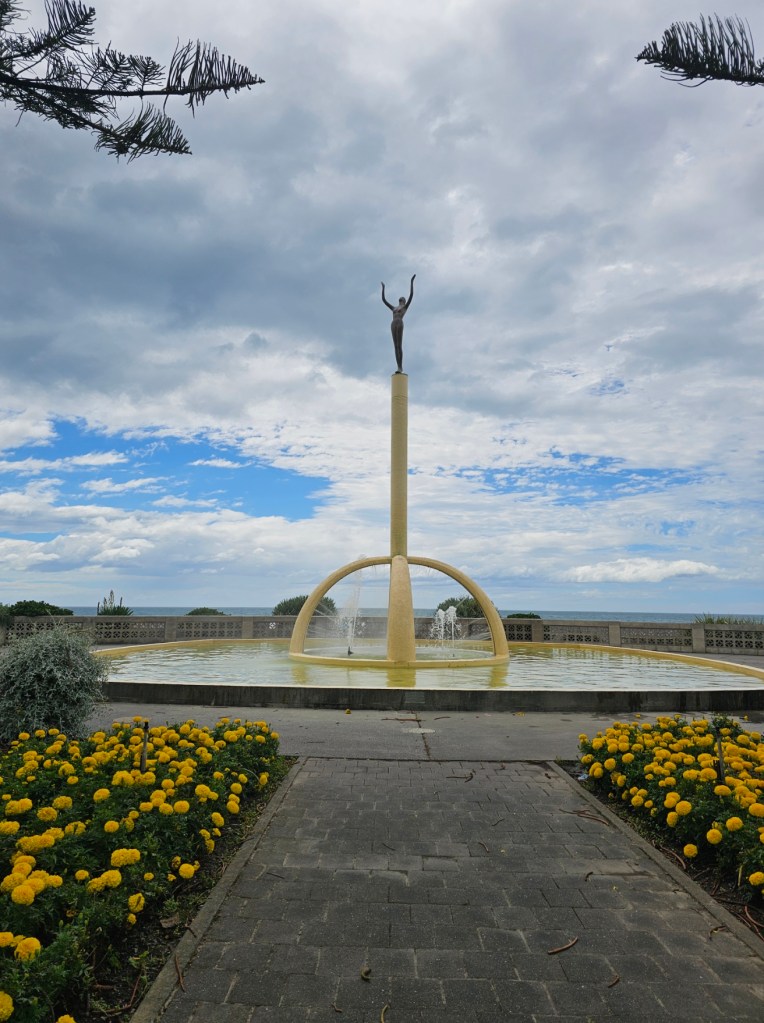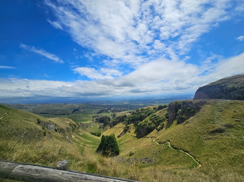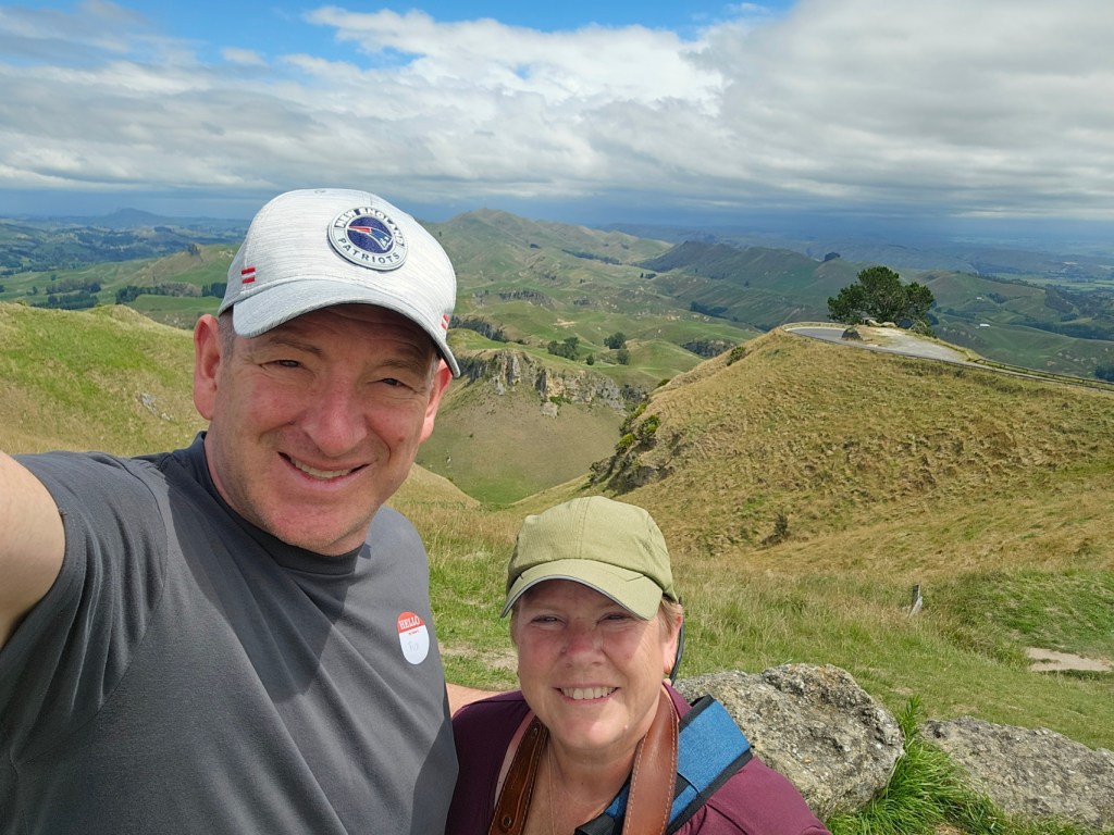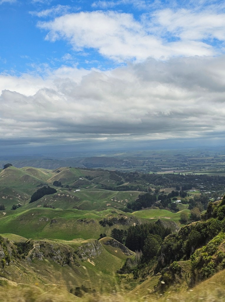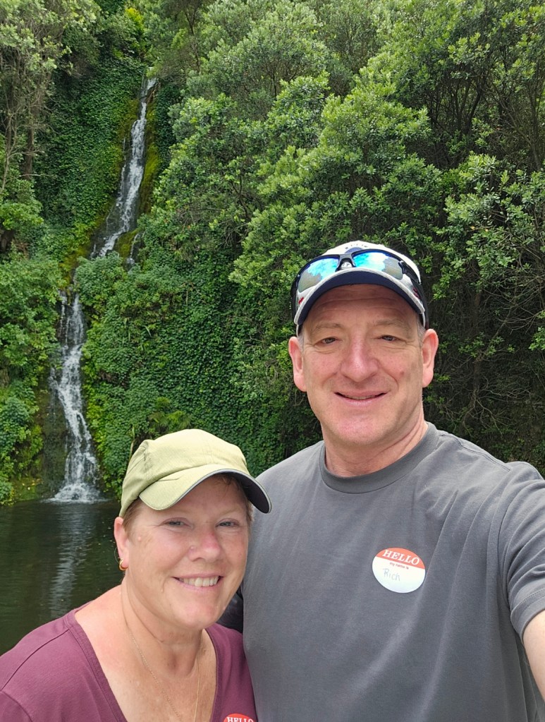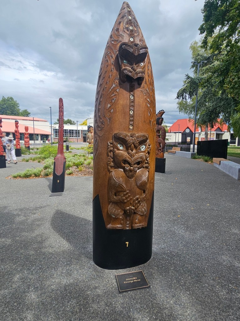 Bernie, our guide for 4 hours, shared with us some things about New Zealand. He said that the three top exports from New Zealand are dairy products, meat, and timber. He said the population of Napier is 66,000. Another big crop beside wineries in this area is the New Zealand Gala apple and that this area is the apple capitol of New Zealand. They do not waste the very fertile land here on cattle or sheep grazing but use it for crops. They have figured out a way to grow apples on my like a vine rather than a tree, which saves time and allows the fruit to grow bigger. They are also much easier to pick! We toured some honey spots (honey is big business in New Zealand!) – Arataki Honey where my sister in law got into a bee costume. We also went to some overlooks high in the hills for some gorgeous over looks. The name of that gorgeous spot was Te Mata Peak. I highly recommend a stop there! The views were amazing! We also stopped at Centennial Gardens to see a beautiful waterfall with pretty flowers all around. We even got to stop at a beach for a couple of minutes to stretch our legs. Our last stop was in town at local park to see the Pou – like a Māori totem pole of sorts.
