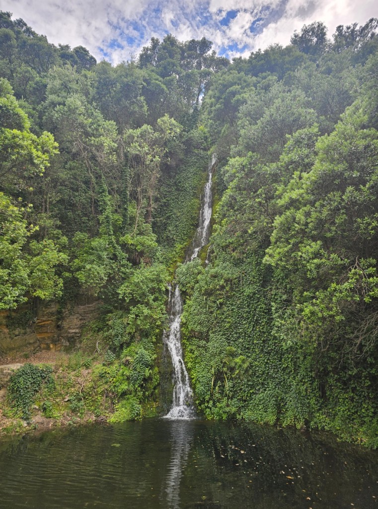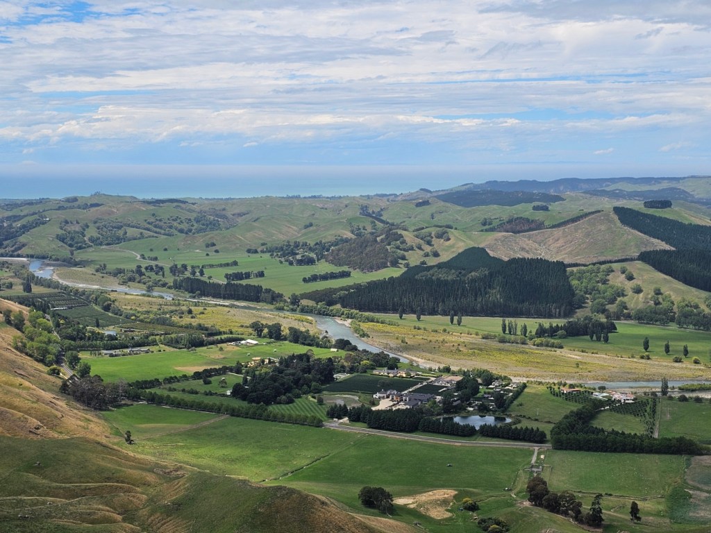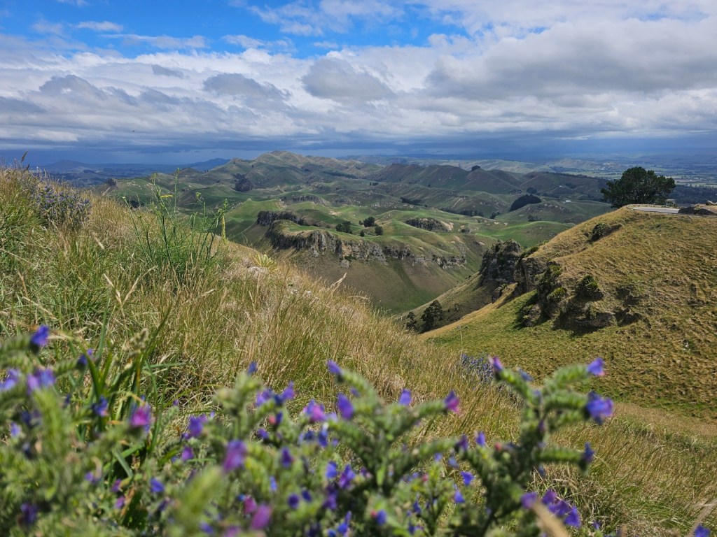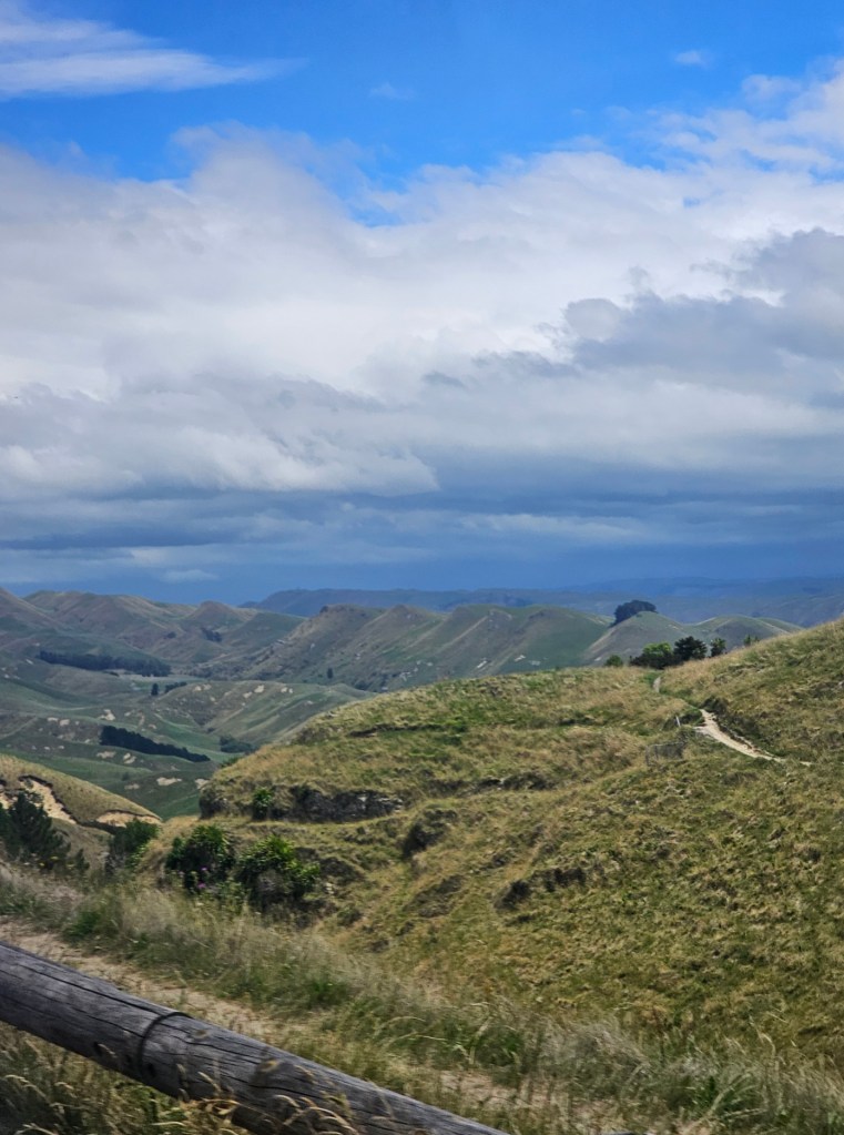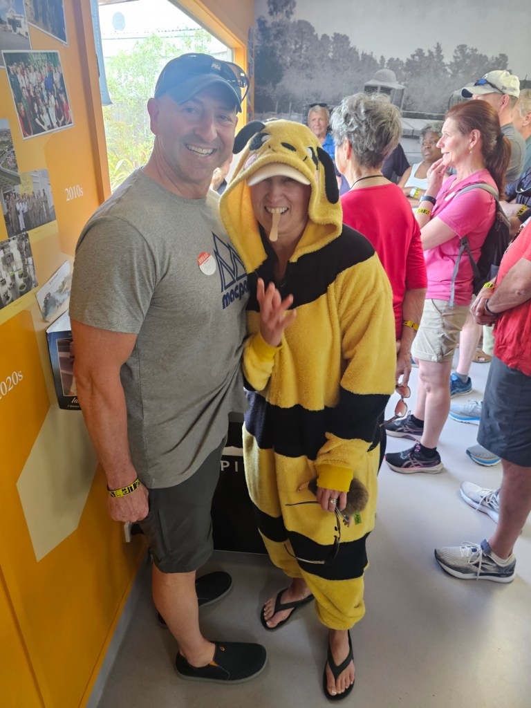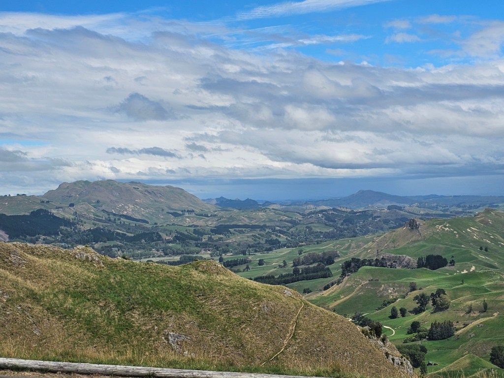 Bernie, our guide for 4 hours, shared with us some things about New Zealand. He said that the three top exports from New Zealand are dairy products, meat, and timber. He said the population of Napier is 66,000. Another big crop beside wineries in this area is the New Zealand Gala apple and that this area is the apple capitol of New Zealand. They do not waste the very fertile land here on cattle or sheep grazing but use it for crops. They have figured out a way to grow apples on my like a vine rather than a tree, which saves time and allows the fruit to grow bigger. They are also much easier to pick! We toured some honey spots (honey is big business in New Zealand!) – Arataki Honey where my sister in law got into a bee costume. We also went to some overlooks high in the hills for some gorgeous over looks. The name of that gorgeous spot was Te Mata Peak. I highly recommend a stop there! The views were amazing! We also stopped at Centennial Gardens to see a beautiful waterfall with pretty flowers all around. We even got to stop at a beach for a couple of minutes to stretch our legs. Our last stop was in town at local park to see the Pou – like a Māori totem pole of sorts.