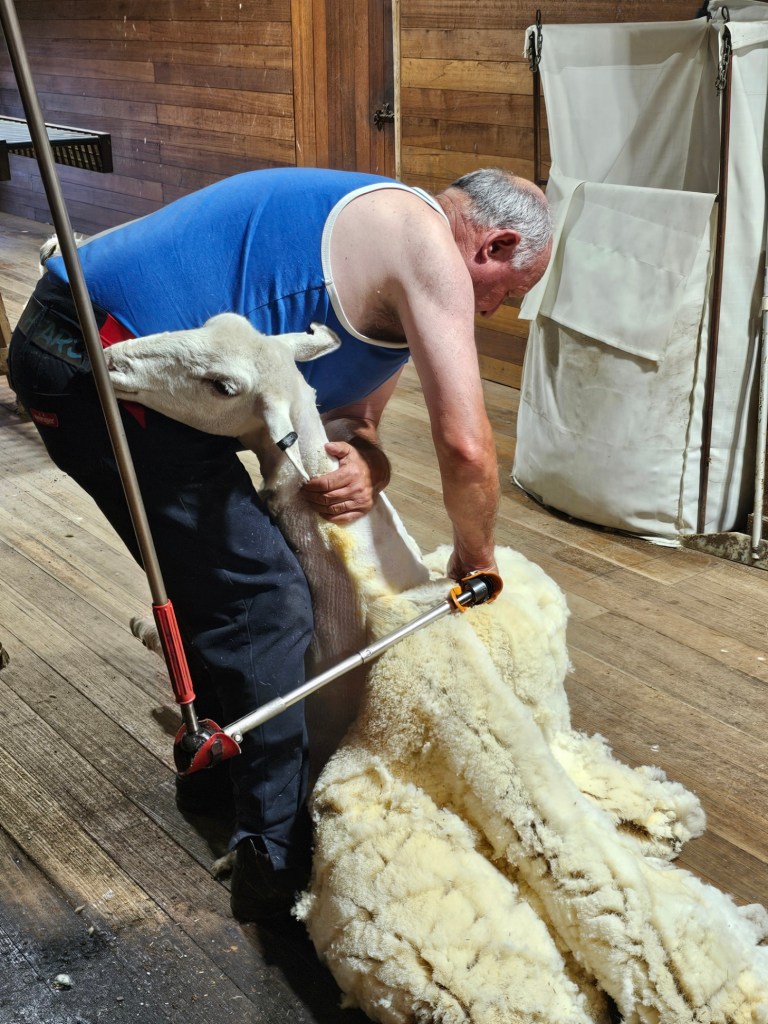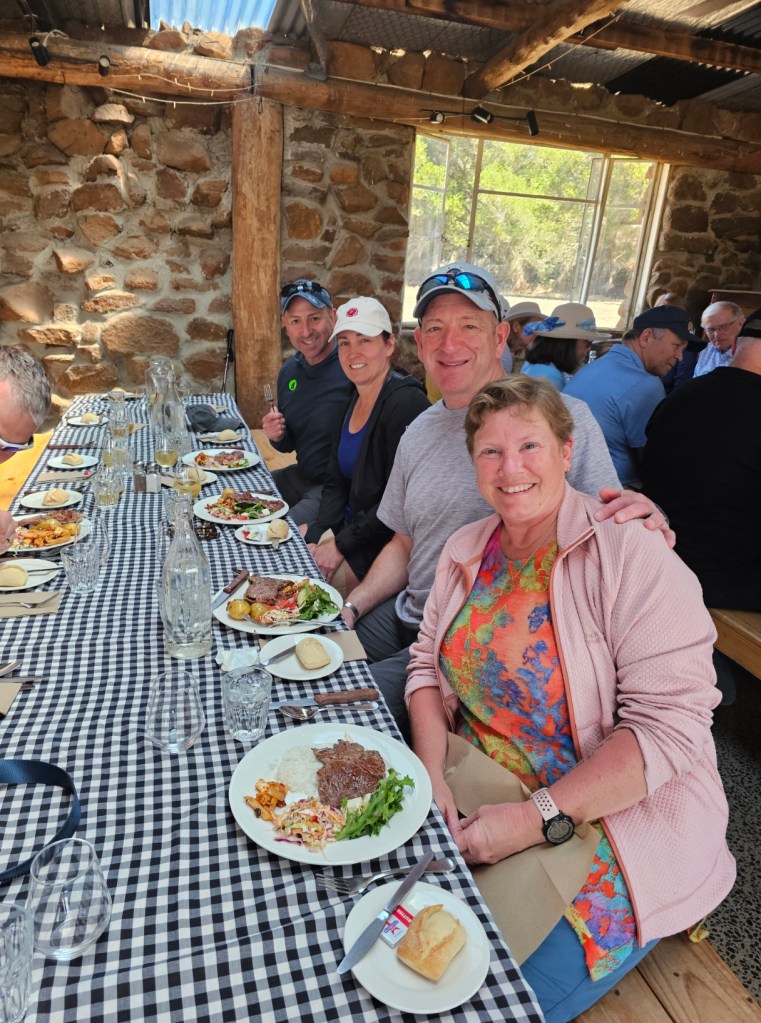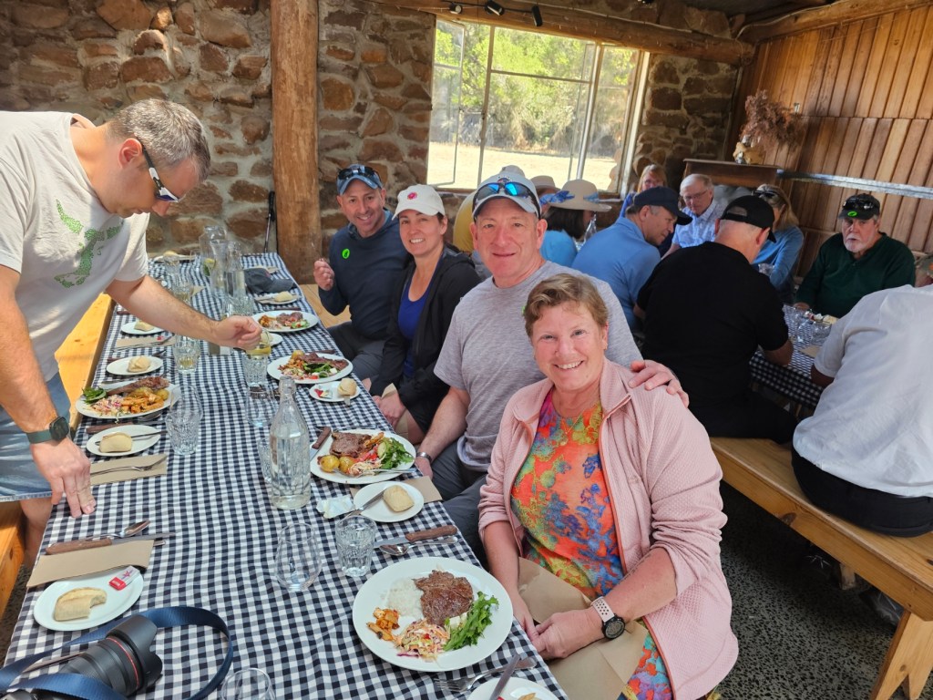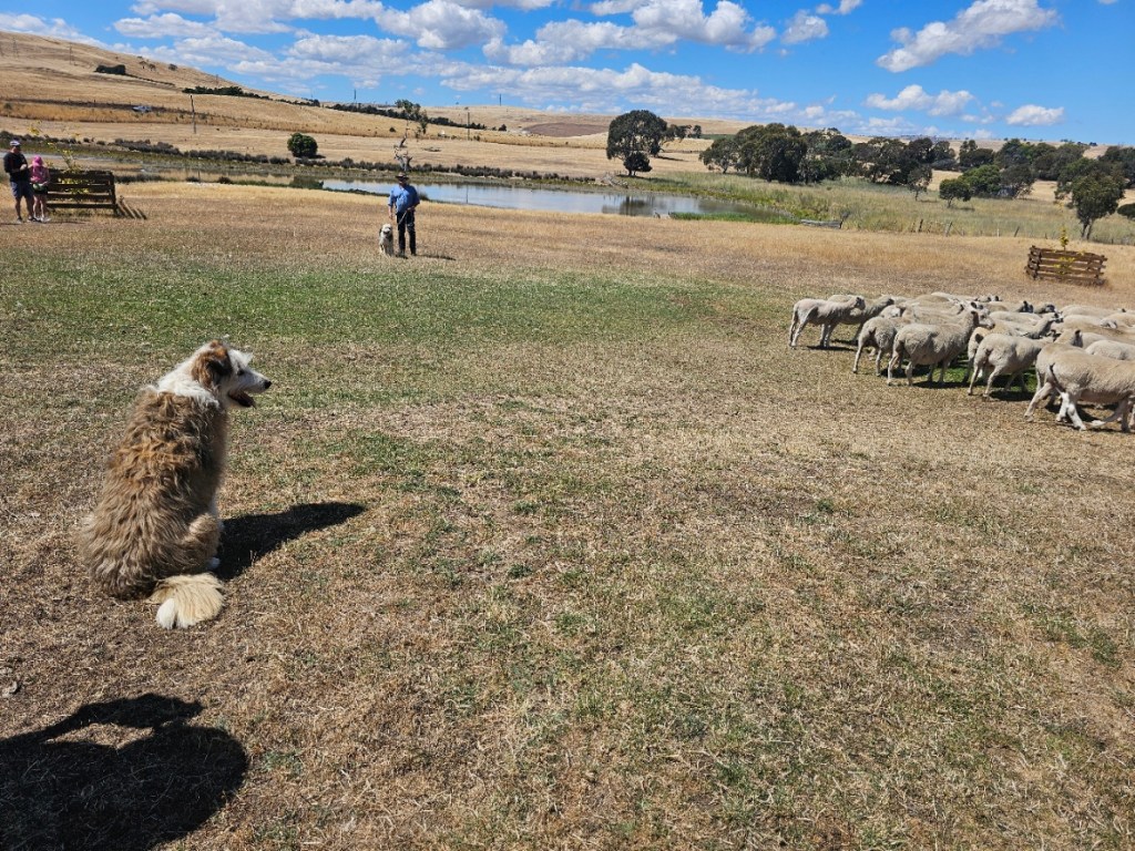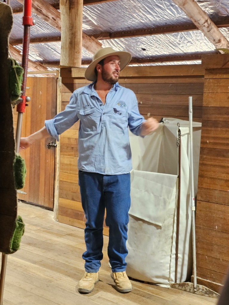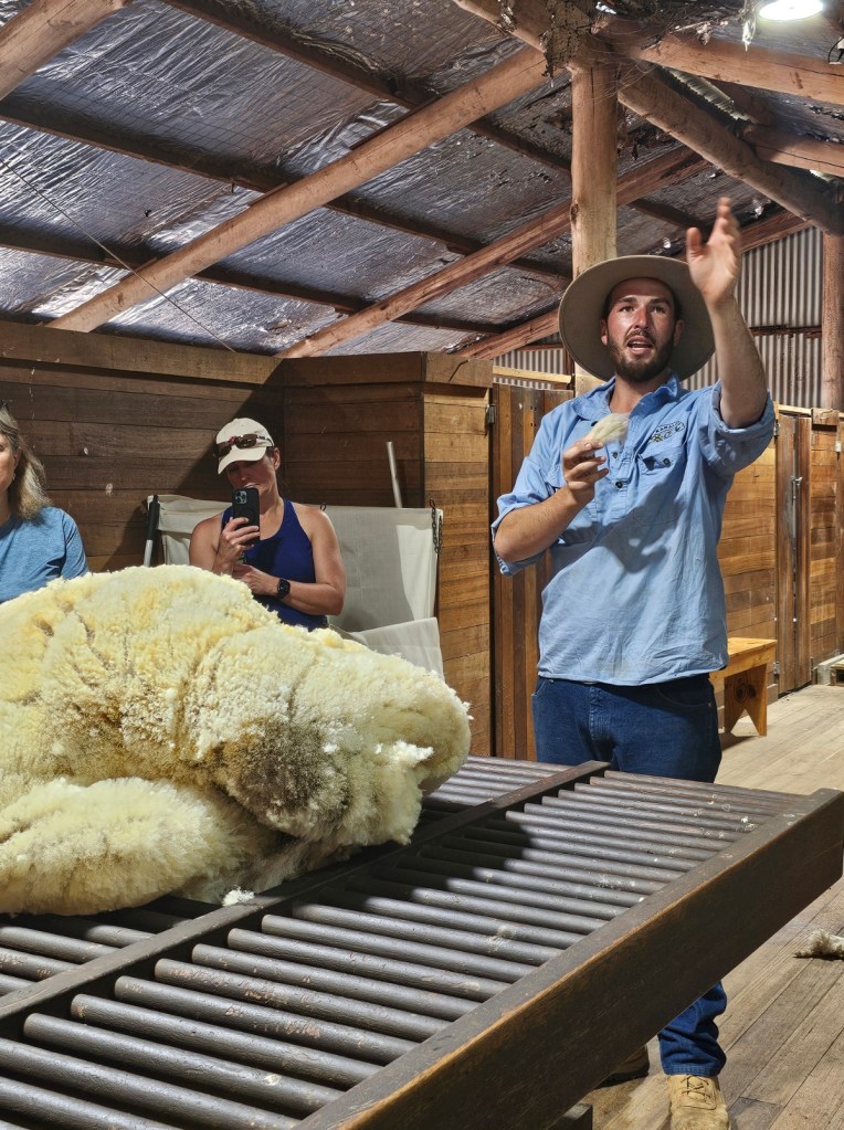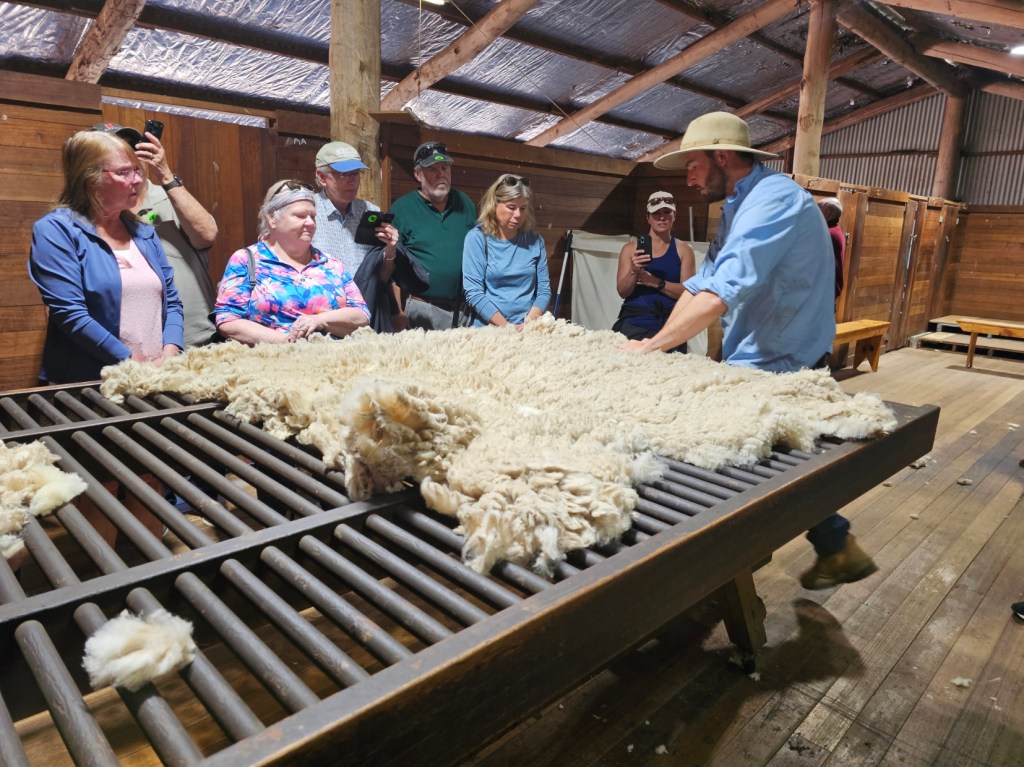 The next place we stopped was really fun: Curringa Family Farms. Tim is the man in charge right now of the working sheep farm and hundreds of acres of other crops. He is the 6th generation on this farm. His son Jacques, is now working the farm as well as the 7th generation. We watched a sheep shearing demonstration and a sheep herding demonstration with their Smithfield/border collie mix dogs. Some of their crops are: pyrethrin (crops that are used to make insecticides) onions, poppies, carrots, cabbages. They have 100 hives that come yearly from a professional pollenating service. They breed vegetables and then sell the seeds. They handpick 1 million seeds for their onions and export them globally. Tim’s wife, Jane, opened farm stay cottages on the farm in 1984 and has won a lot of awards. They shear their sheep in Dec and they are able to do the whole herd in 3 days, with 4 shearers working all day. Each shearer is about to shear 200 sheep each day…so 800 total a day. Most of their sheep are not grown for wool but for meat. They still need to be sheared and the wool gets used as stuffing in pillows and coats. They are in an area called fire storm alley. The area is very fire prone and is a high risk area. If you want to read more about this farm, the website is Curringafarm.com. Tim greeted us on the bus and talked to us about his farm and what he does. He manned the huge grill and made steaks for all of us, which were great. We had a really nice time spending time on his farm.