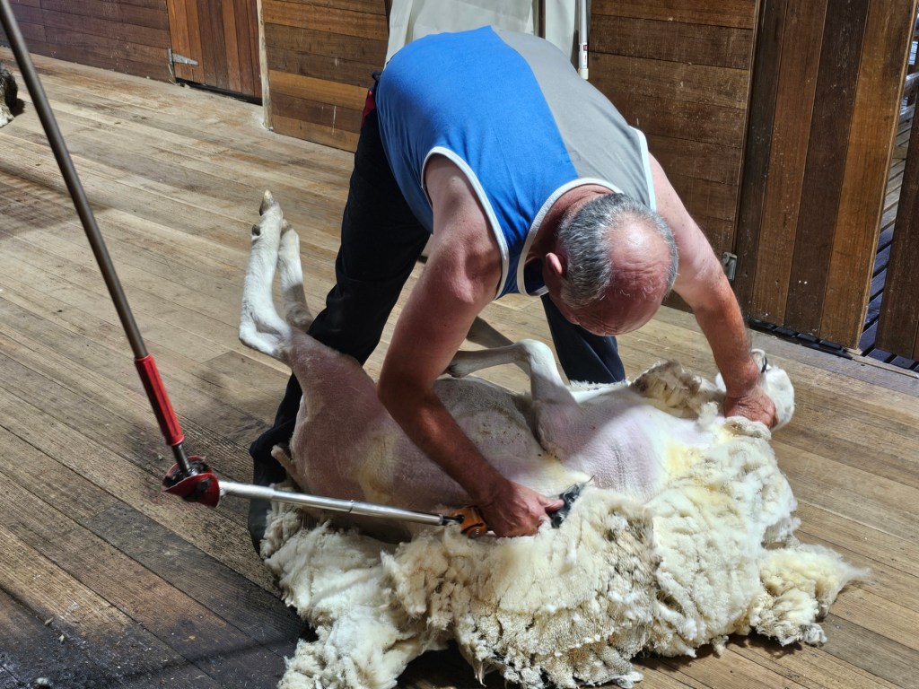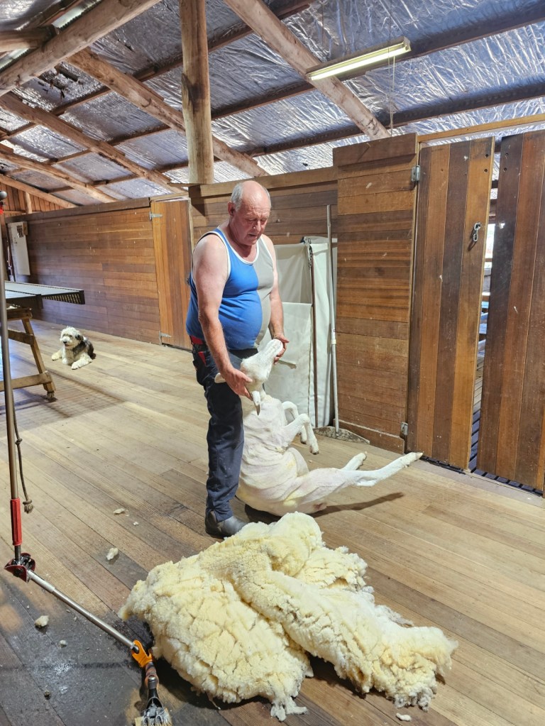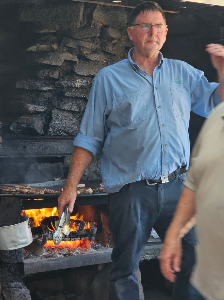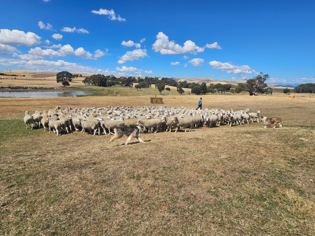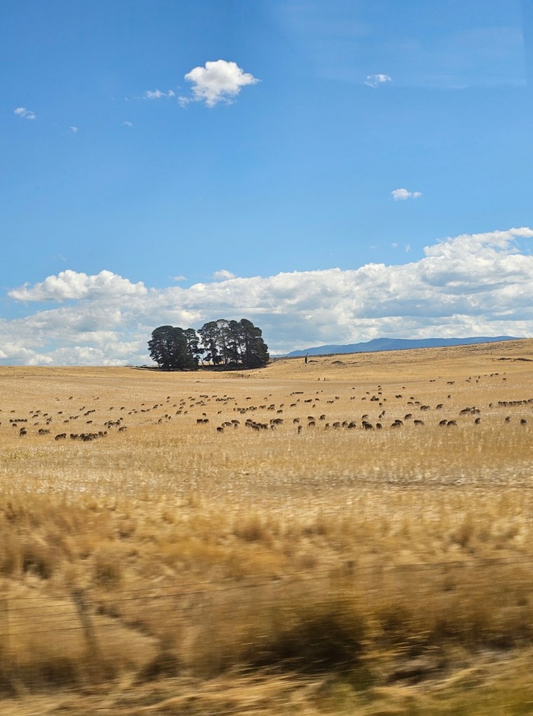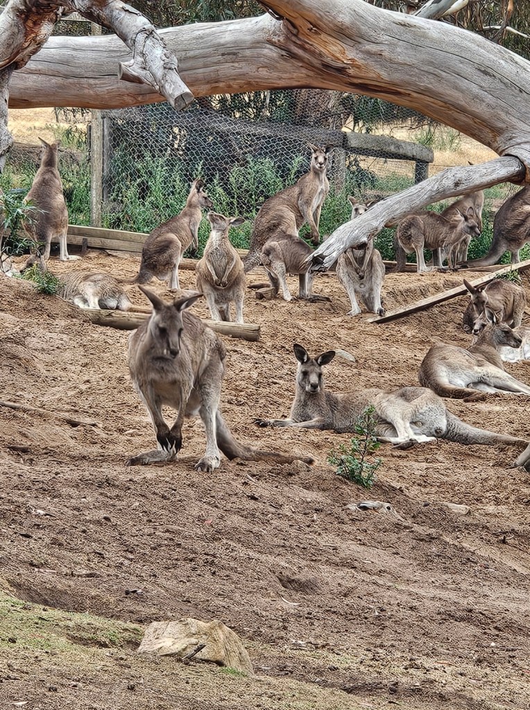 The next place we stopped was really fun: Curringa Family Farms. Tim is the man in charge right now of the working sheep farm and hundreds of acres of other crops. He is the 6th generation on this farm. His son Jacques, is now working the farm as well as the 7th generation. We watched a sheep shearing demonstration and a sheep herding demonstration with their Smithfield/border collie mix dogs. Some of their crops are: pyrethrin (crops that are used to make insecticides) onions, poppies, carrots, cabbages. They have 100 hives that come yearly from a professional pollenating service. They breed vegetables and then sell the seeds. They handpick 1 million seeds for their onions and export them globally. Tim’s wife, Jane, opened farm stay cottages on the farm in 1984 and has won a lot of awards. They shear their sheep in Dec and they are able to do the whole herd in 3 days, with 4 shearers working all day. Each shearer is about to shear 200 sheep each day…so 800 total a day. Most of their sheep are not grown for wool but for meat. They still need to be sheared and the wool gets used as stuffing in pillows and coats. They are in an area called fire storm alley. The area is very fire prone and is a high risk area. If you want to read more about this farm, the website is Curringafarm.com. Tim greeted us on the bus and talked to us about his farm and what he does. He manned the huge grill and made steaks for all of us, which were great. We had a really nice time spending time on his farm.