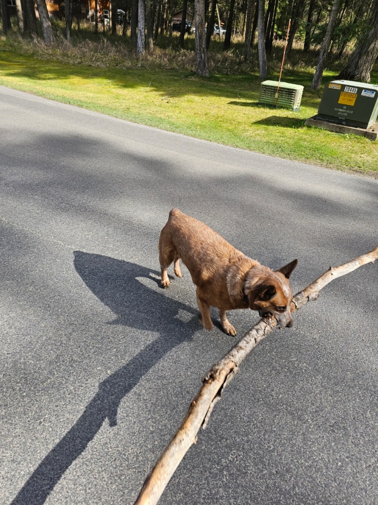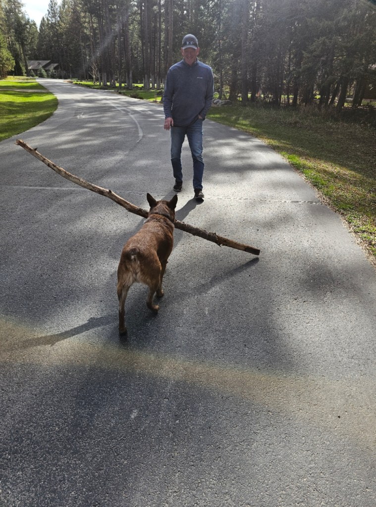 Before we left Montana, the weather was SO WARM! It was in the mid-70’s and then hit 80 the day we left. We took Tallinn for some longer walks and he loved it! Put for the half mile trek to the mailbox and back, he has to carry a stick with him: the bigger, the better. It is all a lot of fun until he whacks you in the back of the calves with it unexpectedly.