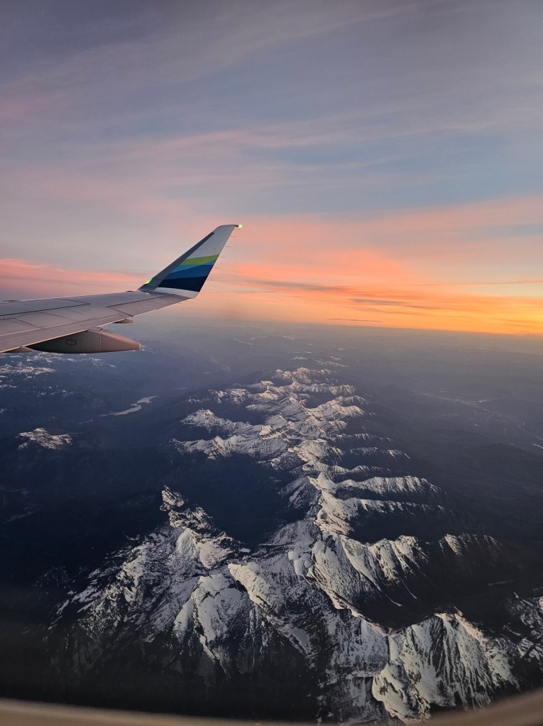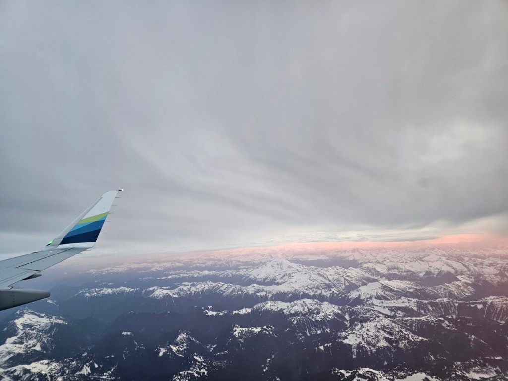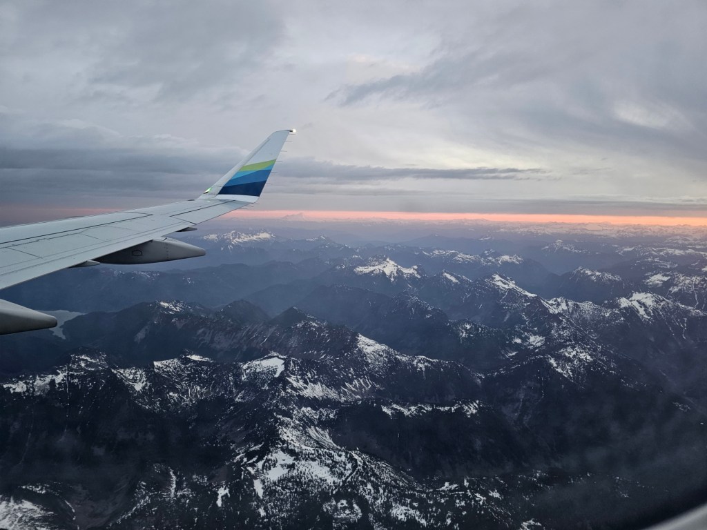 We flew out of Kalispell to head to the Mayo Clinic in Rochester, Minnesota. Unfortunately, we did not have a direct route. We flew out of Kalispell at 6:05 am and flew WEST to Seattle. We were chasing the sunrise the entire time (or maybe it was chasing us). Either way, beautiful visions out of my window on the way to Seattle. We then flew back over OUR HOUSE from Seattle to Minneapolis. We rented a car and drove an hour to Rochester. Coming home late last night, we did that all in reverse. We got back to our house around 1 am this morning. It had snowed and the temp was 29 degrees. It is almost noon here now and it is a balmy 35 degrees. It is above freezing, so there’s that. Here are some of the photos from the sunrise for an hour trip to Seattle on Tuesday….