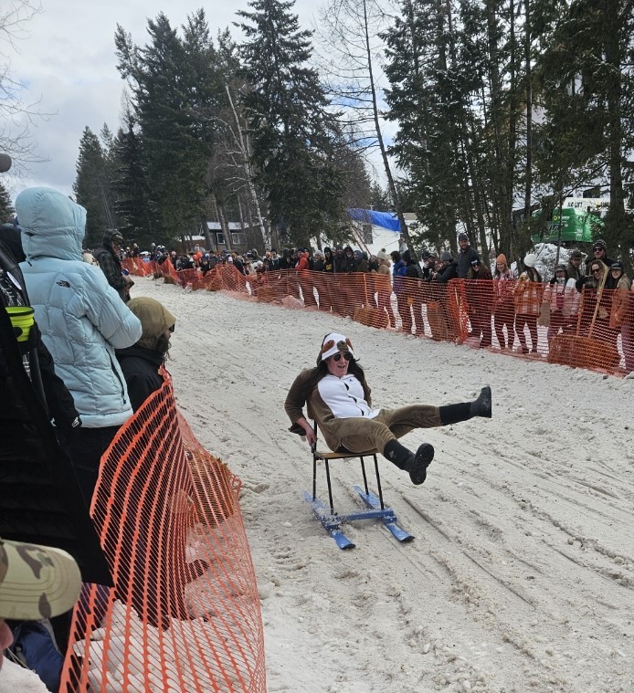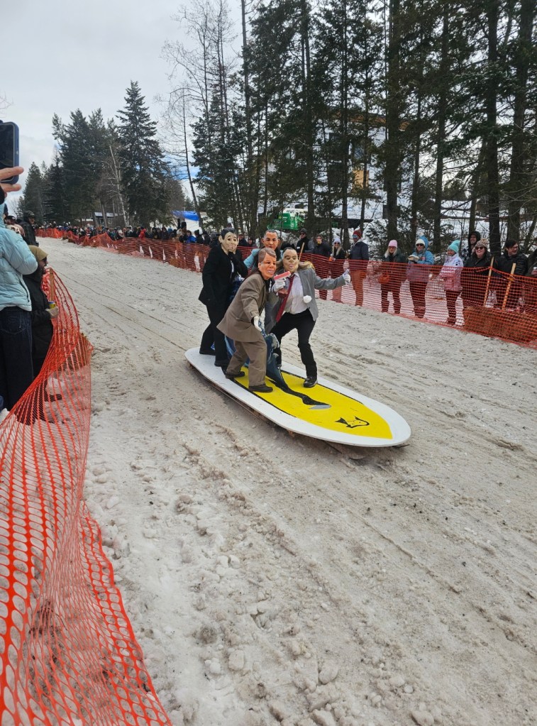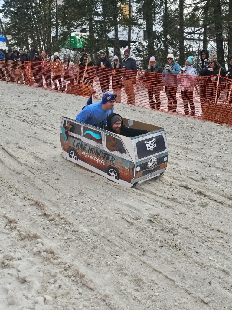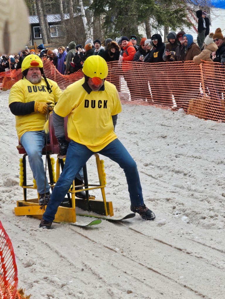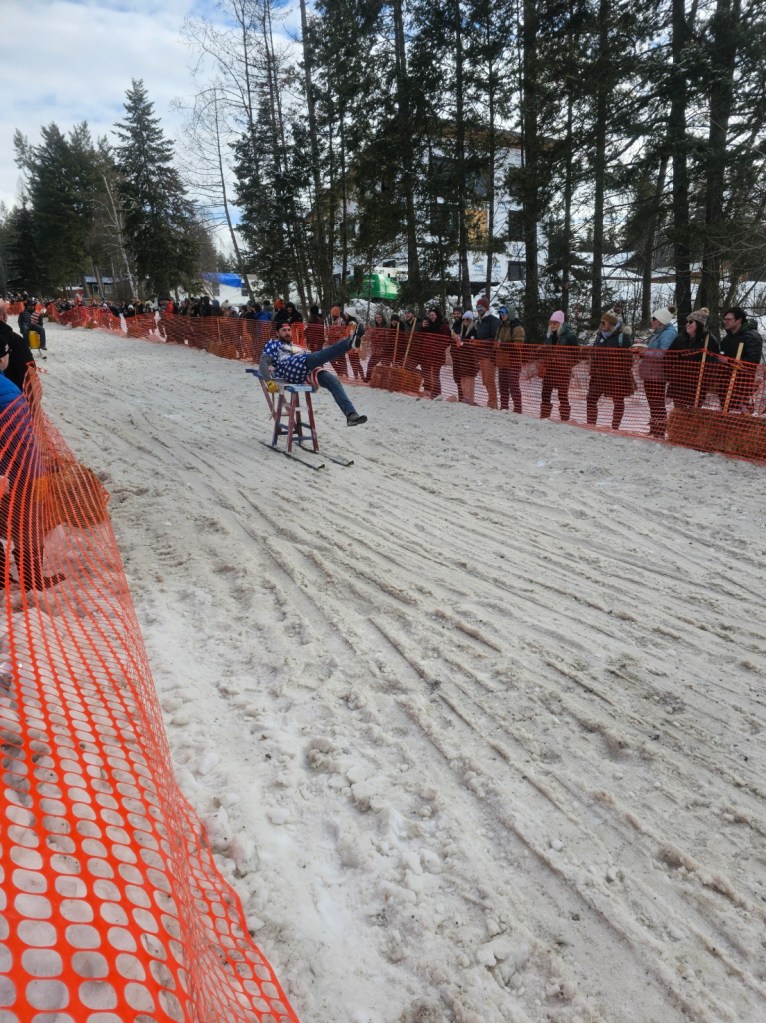 So on to the main event of the day…barstool ski races. It is just like it sounds….you affix a barstool of your choice to some skis, sit on it and get shoved down a hill on main street. There are two racers per heat and usually the more dressed up you are, the better the crowd participation. You can always tell if someone falls as the entire crowd reacts audibly. When the two guys dressed up as ducks fell near us, the crowd cheered them on, yelling, “quack , quack, quack, quack!” The majority of the crowd is being kept warm by flannel shirts, Carhart pants and jackets, mucking boots, and the kind of liquid that warms you from the inside out….and I don’t mean hot chocolate or coffee. LOTS OF ALCOHOL. We arrived at noon and there were at least 1000 people there, all of them pretty toasty off their liquid courage. There was a lumberjack-looking woman standing near me who had her silicone collapsable cups in her backpack, along with her bottle of crown royal. Smart. She was not cold. Anyhow, back to the races…there are three categories: straight barstools on skis, a barstool-like contraption on skis that can be steered, and then the open event where people do whatever on skis to make it fun for the crowd. I took a few photos with my phone. Here they are….because I can’t make this up, folks!
