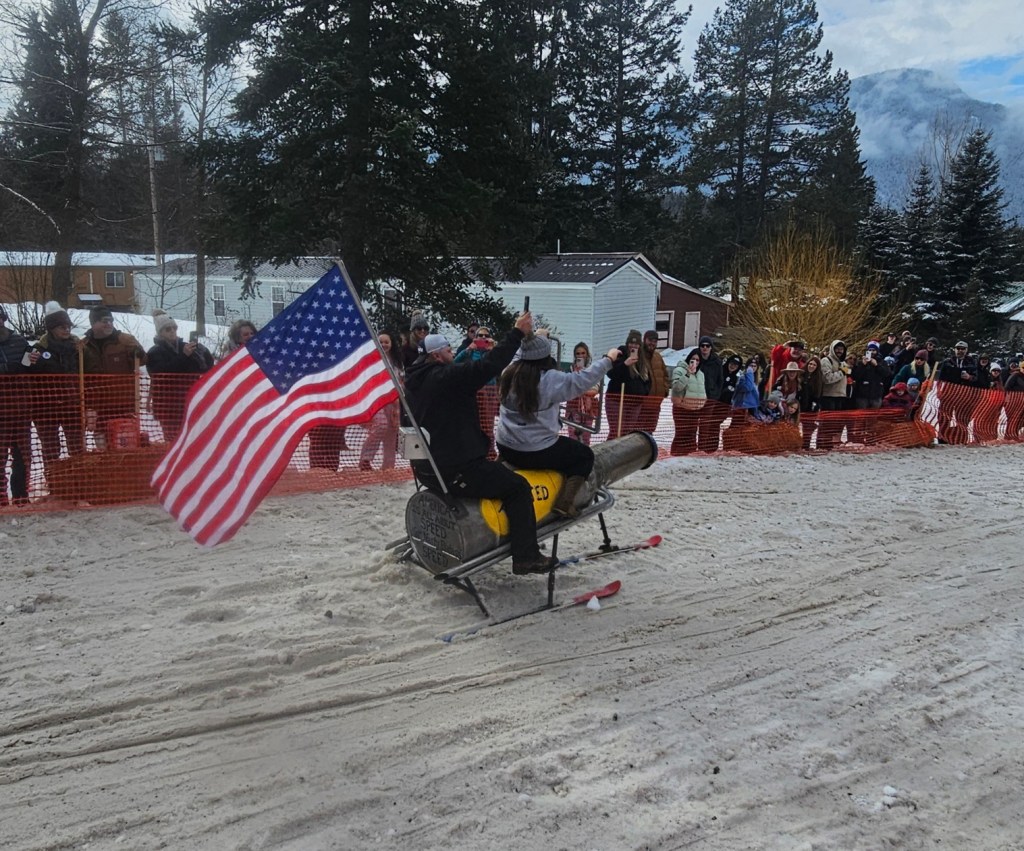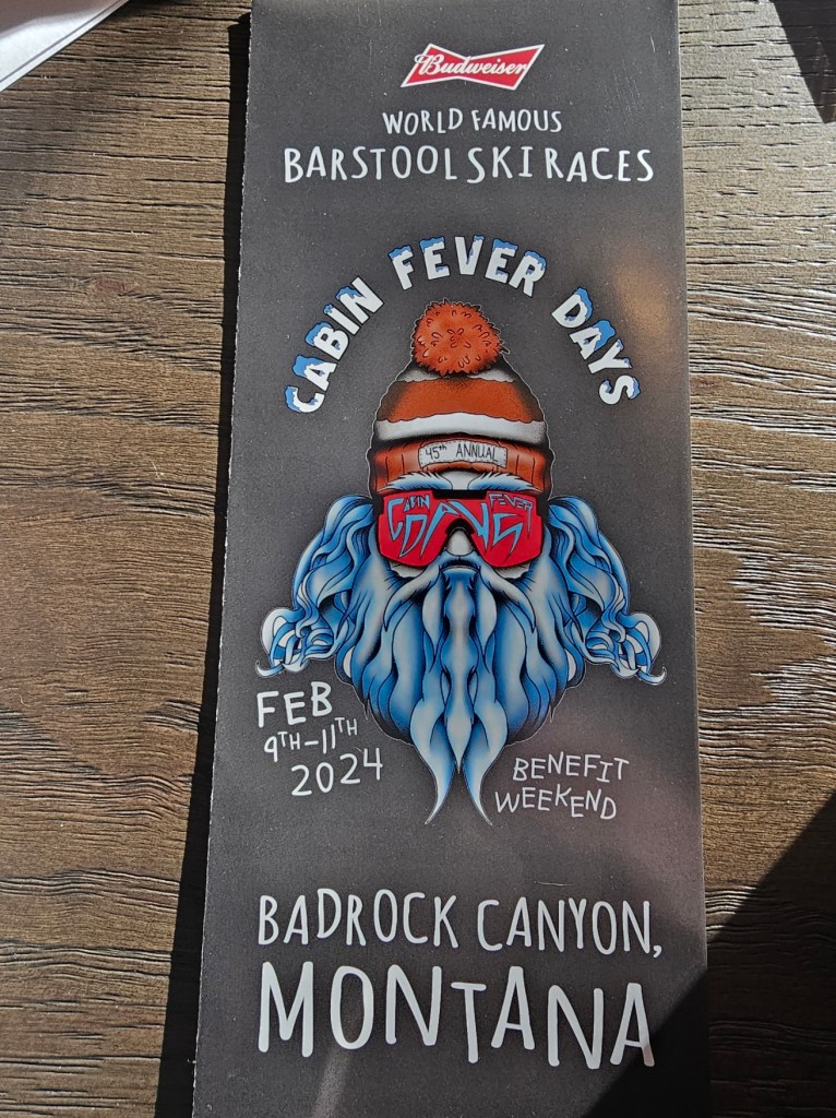 Whelp….I have a local yocal event to share with you! Today, Rich and I, along with another couple who lives in our neighborhood, when to Martin City for the Cabin Fever Days. We specifically went to see the Barstool Ski Races. We did forego the snowshoe softball game (CAN YOU IMAGINE???) because the Barstool Ski Races had us tapped out for Montanan events for the day…..maybe even the whole weekend, perhaps the week! Martin City is one of the little cities (honestly it has city in the name but it is barely qualifies as a town or village anywhere else in the U.S.) that is in the Bad Rock Canyon on the way to Glacier National Park from our spot just east of Columbia Falls. As I mentioned with Hungry Horse, these town are where we do mutual aid fire calls….Hungry Horse, Martin City, Coram, West Glacier, etc. We all have different equipment so we can help each other out…we have vehicle extrication tools like spreaders (the jaws of life) that Hungry Horse may not have….so if they get an MVA (motor vehicle accident), we go on their calls to assist. Anyhow, this event was a fundraiser for those volunteer fire departments. A local tattoo artist came up with the art for this year and I love it!
