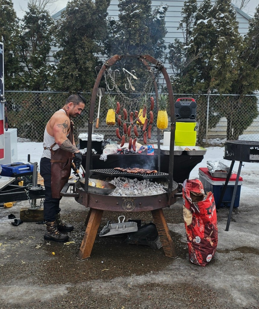 If you notice, it is the 45th annual Cabin Fever Days. The barstool ski races are the high light of the event, even though I mentioned the snowshoe softball games and there is also lots of food trucks and arts vendors on the trek up to Sugar Hill for the races, and there is also a mountain man competition and an arm wrestling contest. Later in the evening there is a doubles pool tournament, a dart tournament, and karaoke at several local area bars. We stopped on the way out at the food trucks and Rich and I had wild boar sausage on a bun with maple mustard (Rich skipped the mustard) and pineapple salsa. Interesting, right? It was messy but man, it was good!